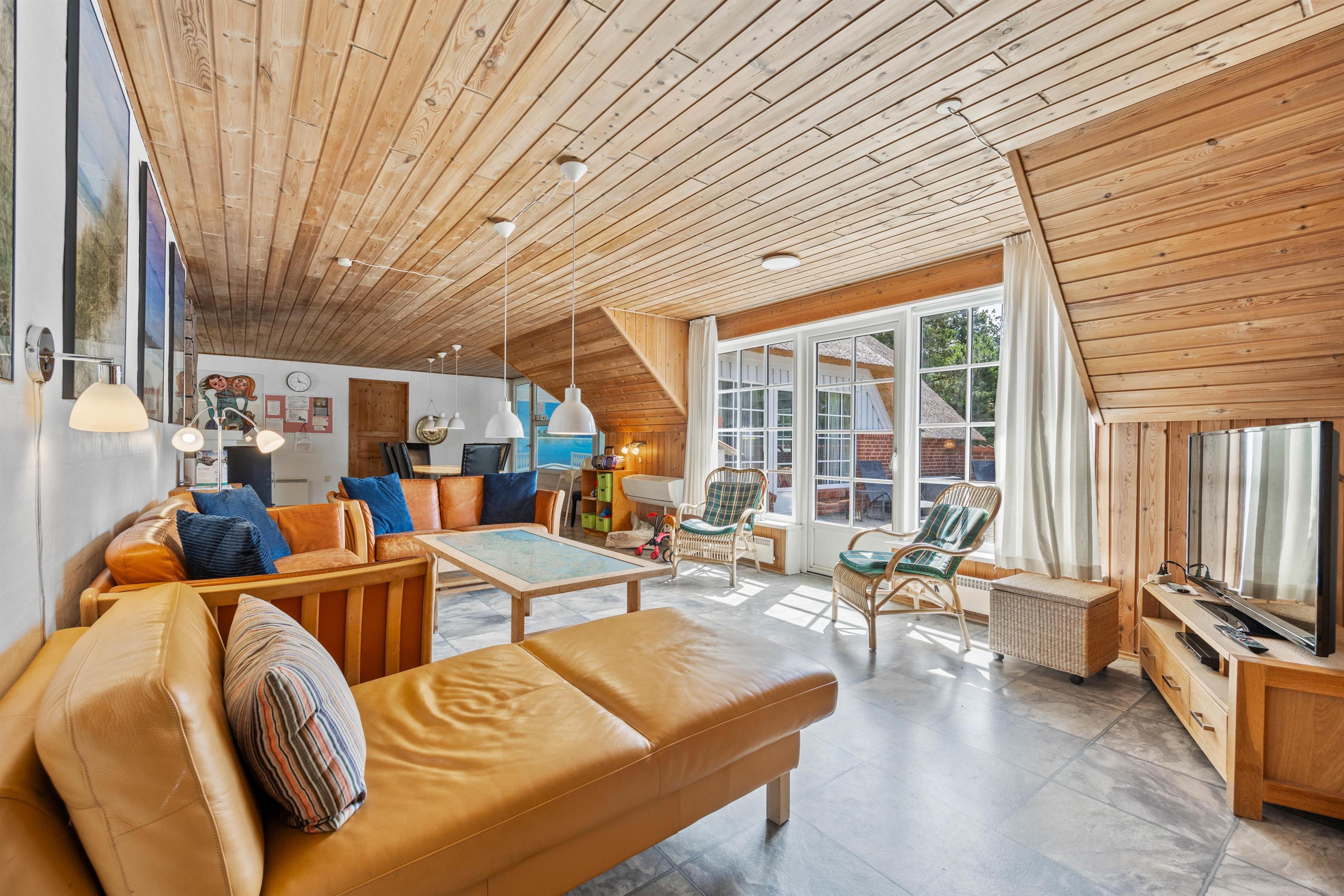 Det charmerende 181 kvadratmeter store sommerhus på A Hveyselsvej 4 byder ind med feriestemning både indendørs og udendørs. Det rustikke rødstenshus er opført i ægte charmerende Rømø-stil, af sten og strå. Poolområdet med både swimmingpool og spabad inviterer til utallige timers leg og plask, uanset vejret.På væggen har ejeren sørget for denne rette stemming med malerier på væggen. Fra opholdsrummet har I udgang til både poolområdet og den lukkede terrasse, så selv om I slapper af i sofaen ved varmen fra den knitrende brændeovn, kan I følge med i, hvad der sker omkring jer. Det åbne køkken i forbindelse med opholdsrummet indeholder alt, hvad I behøver for at kunne kræse om hinanden med lækre måltider.