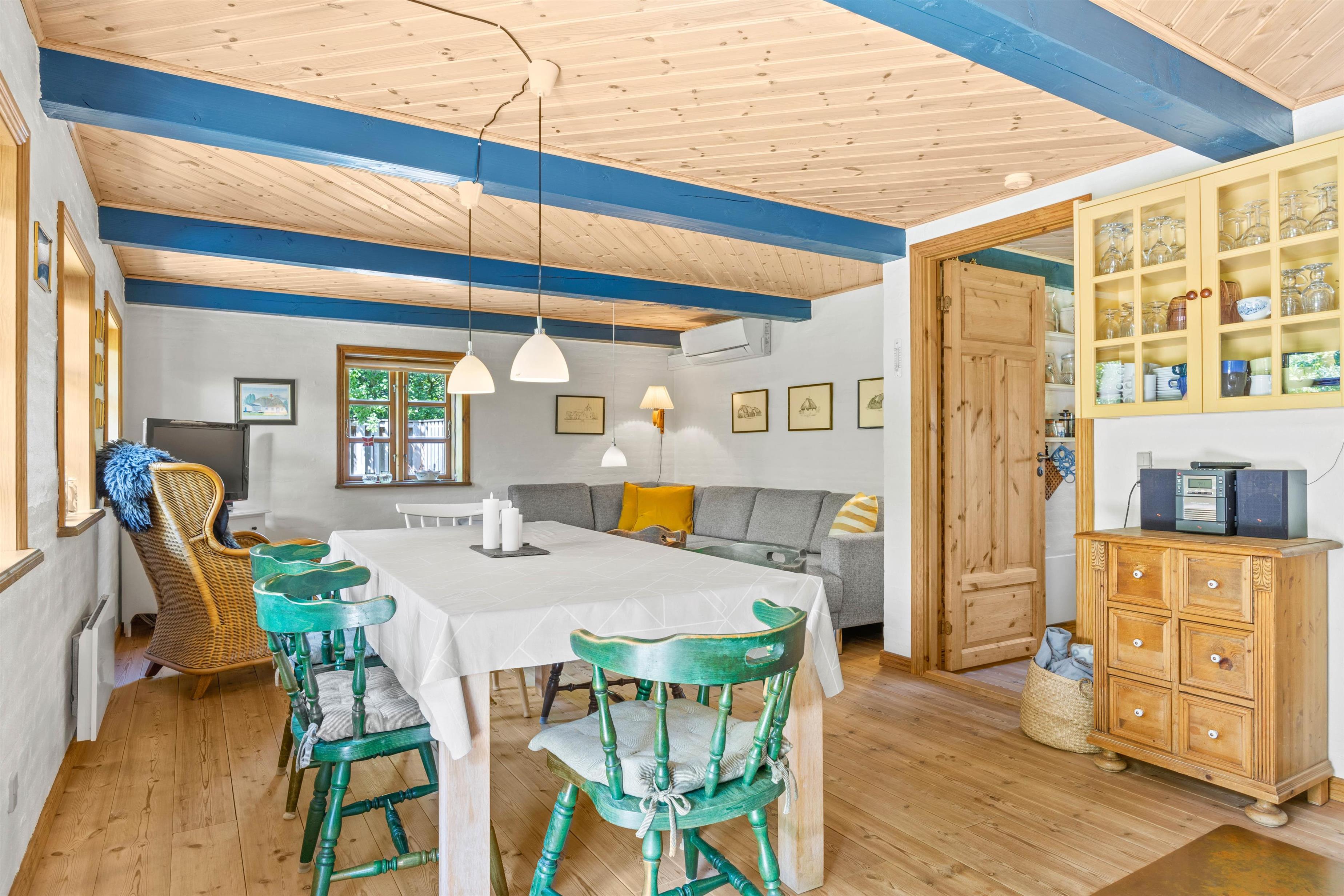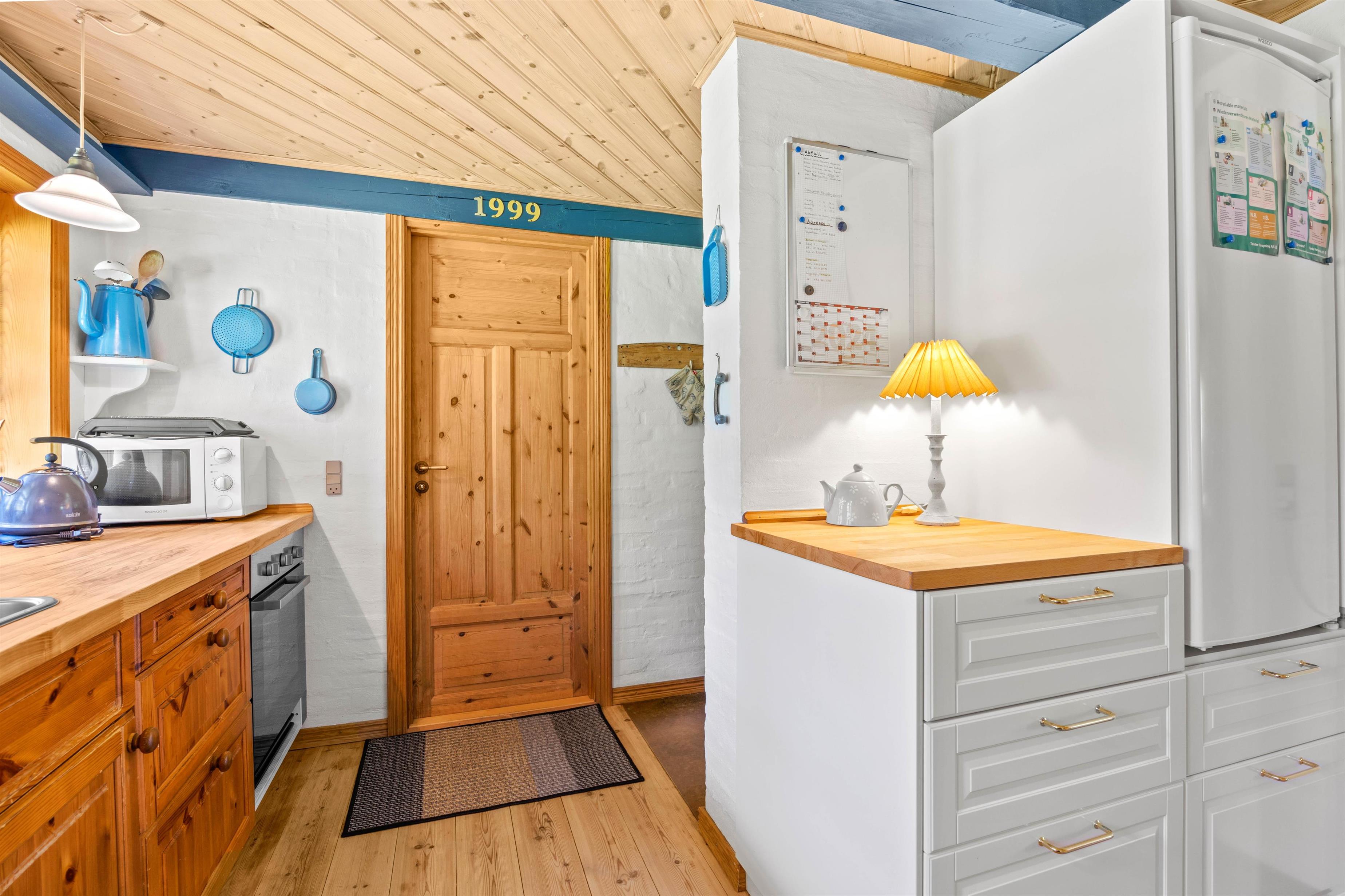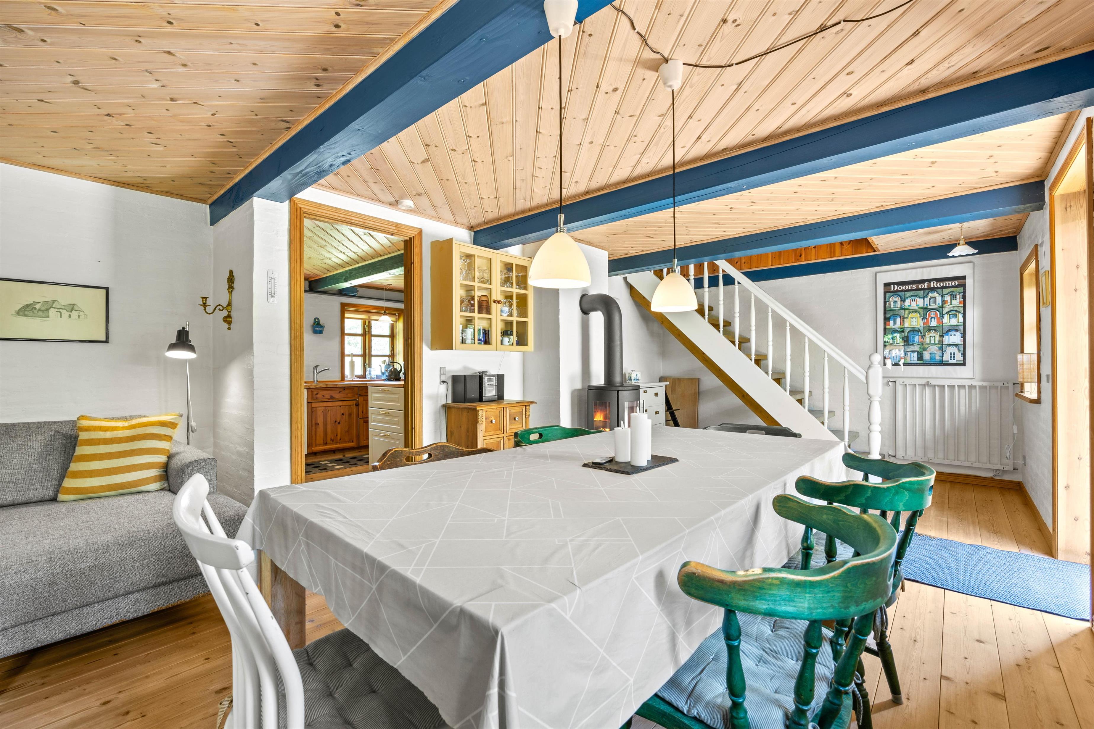 Når I træder ind i sommerhuset, mærker I straks den hyggelige atmosfære, der byder jer velkommen. Brændeovnen sørger for en ekstra hyggelig stemning på de kølige aftener, mens den energibesparende varmepumpe sikrer behagelige temperaturer året rundt. Stuen er rummelig, hvilket giver god plads til, at hele familien kan samles omkring ilden.