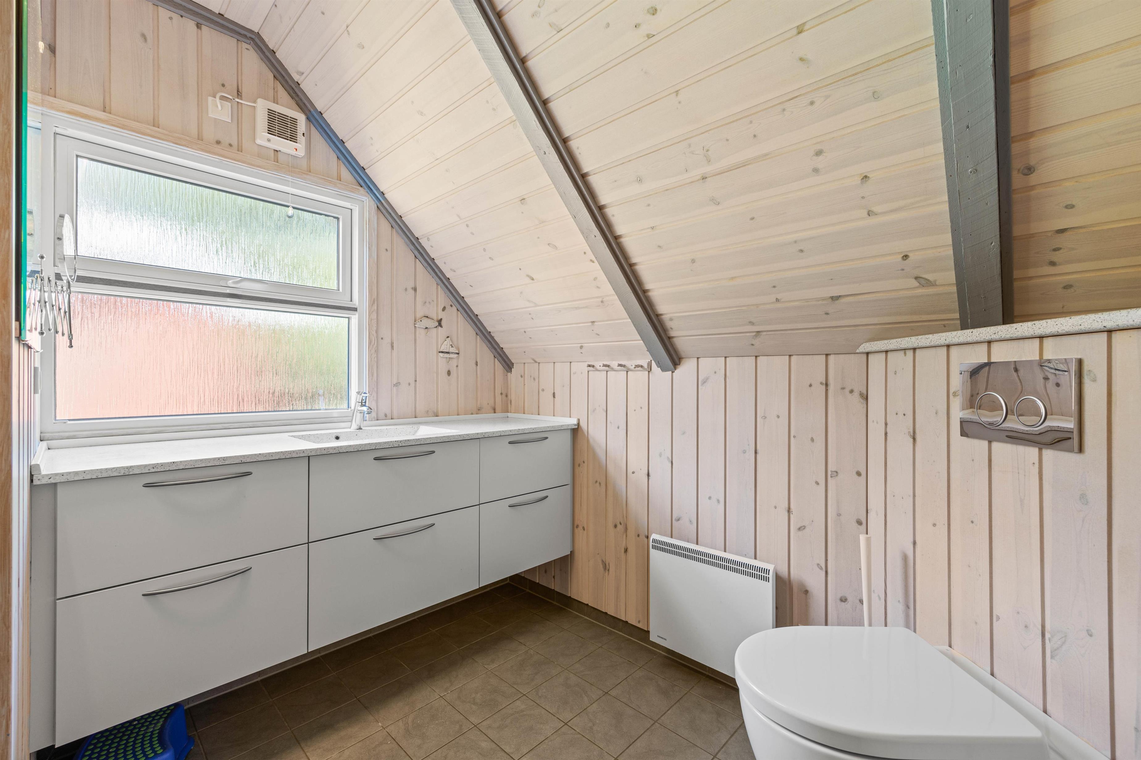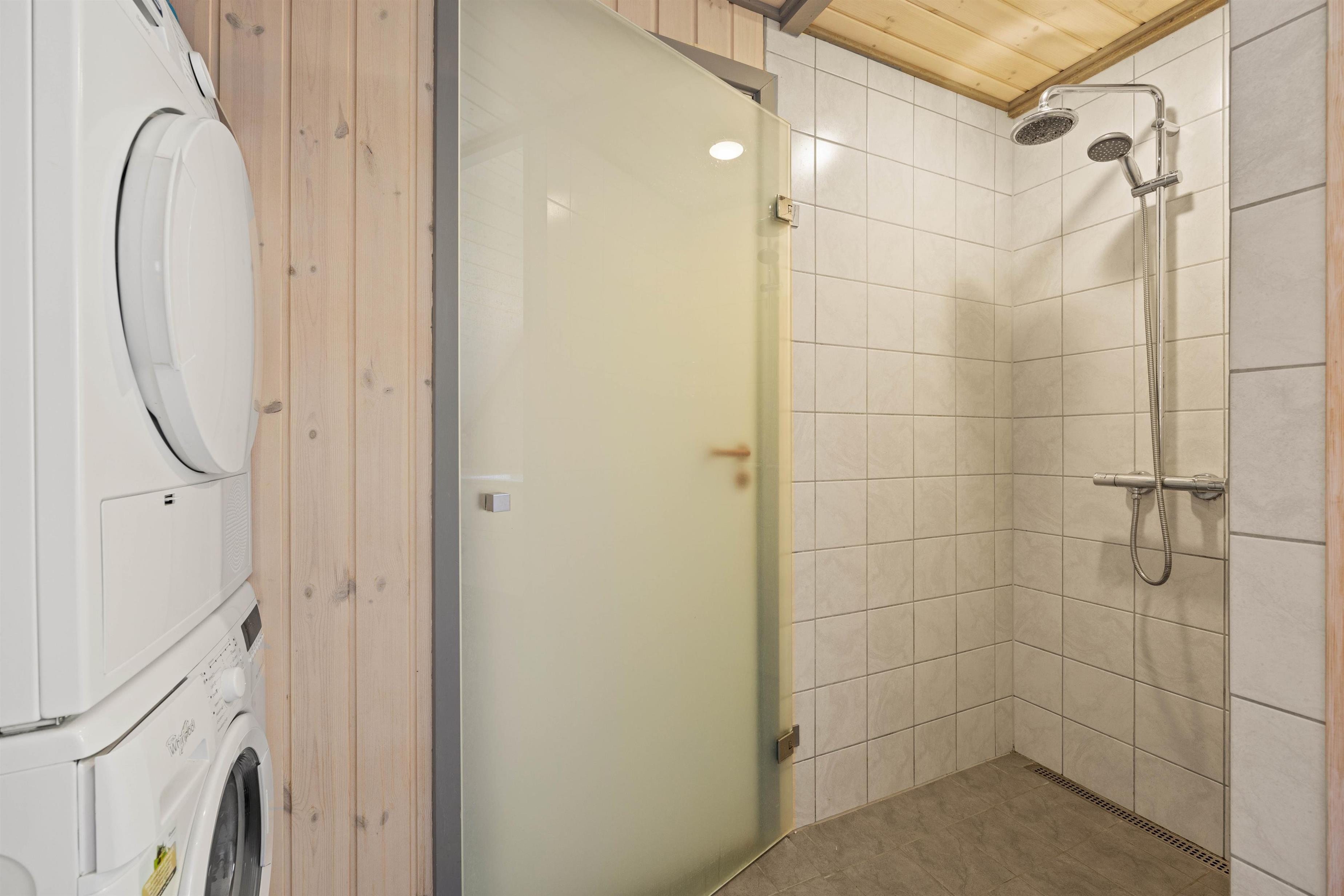 I træder ind i dette skønne sommerhus gennem den praktiske entré, hvor I kan opbevare jeres jakker og sko. Til venstre ligger det velholdte badeværelse, som naturligvis har gulvvarme, så I ikke får kolde fødder efter et brusebad.
