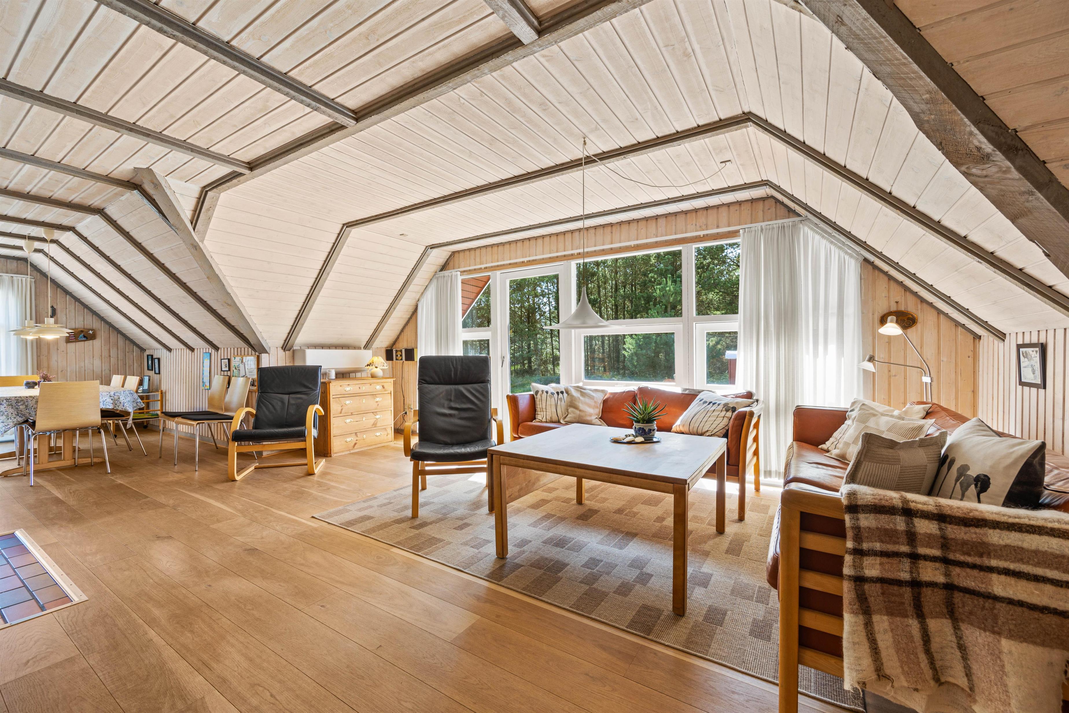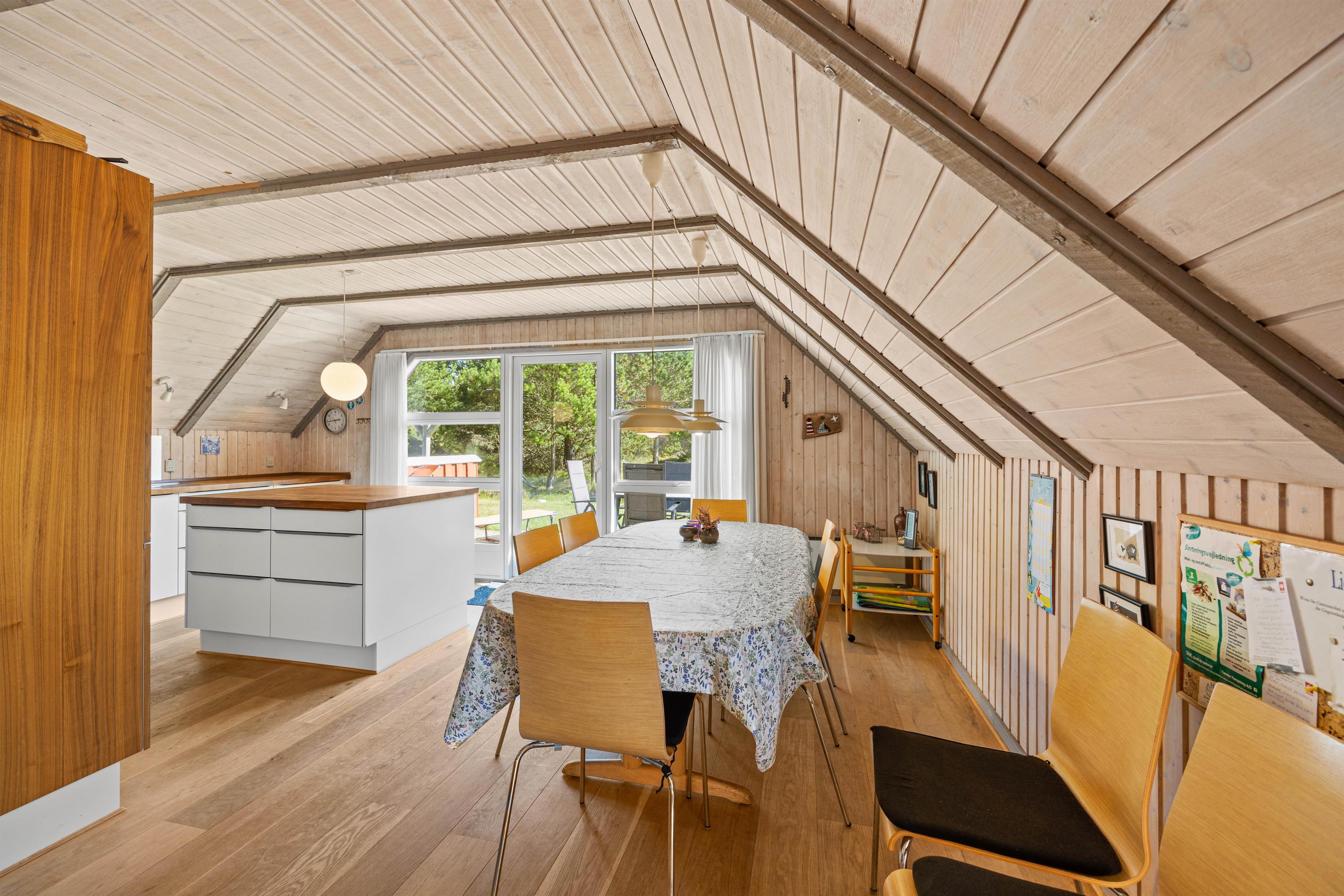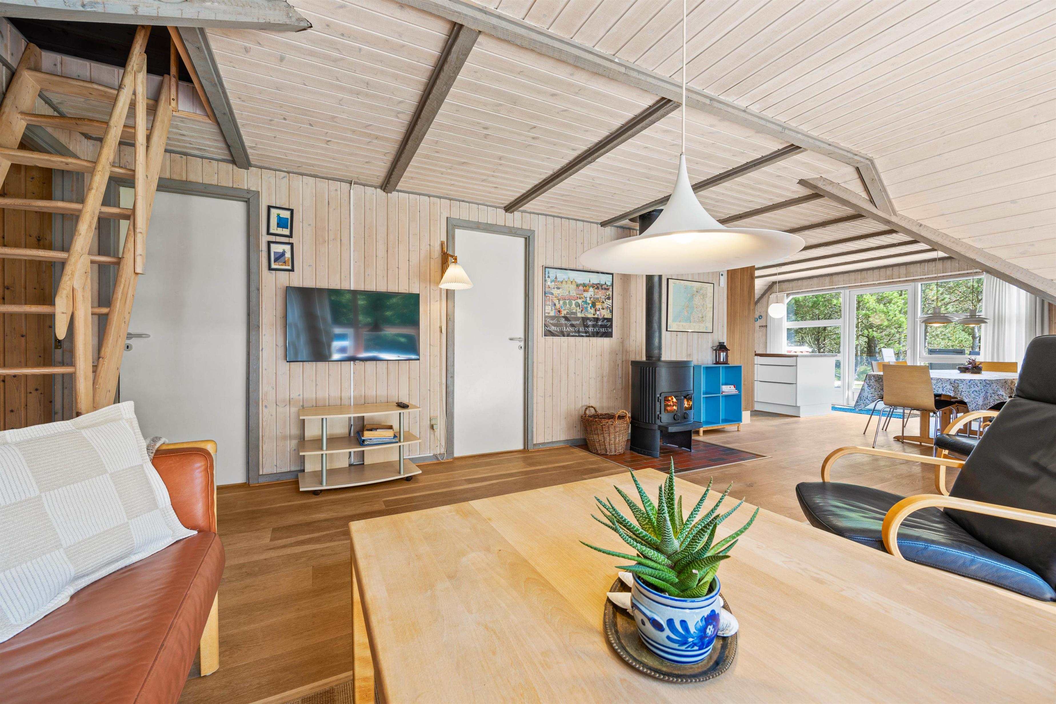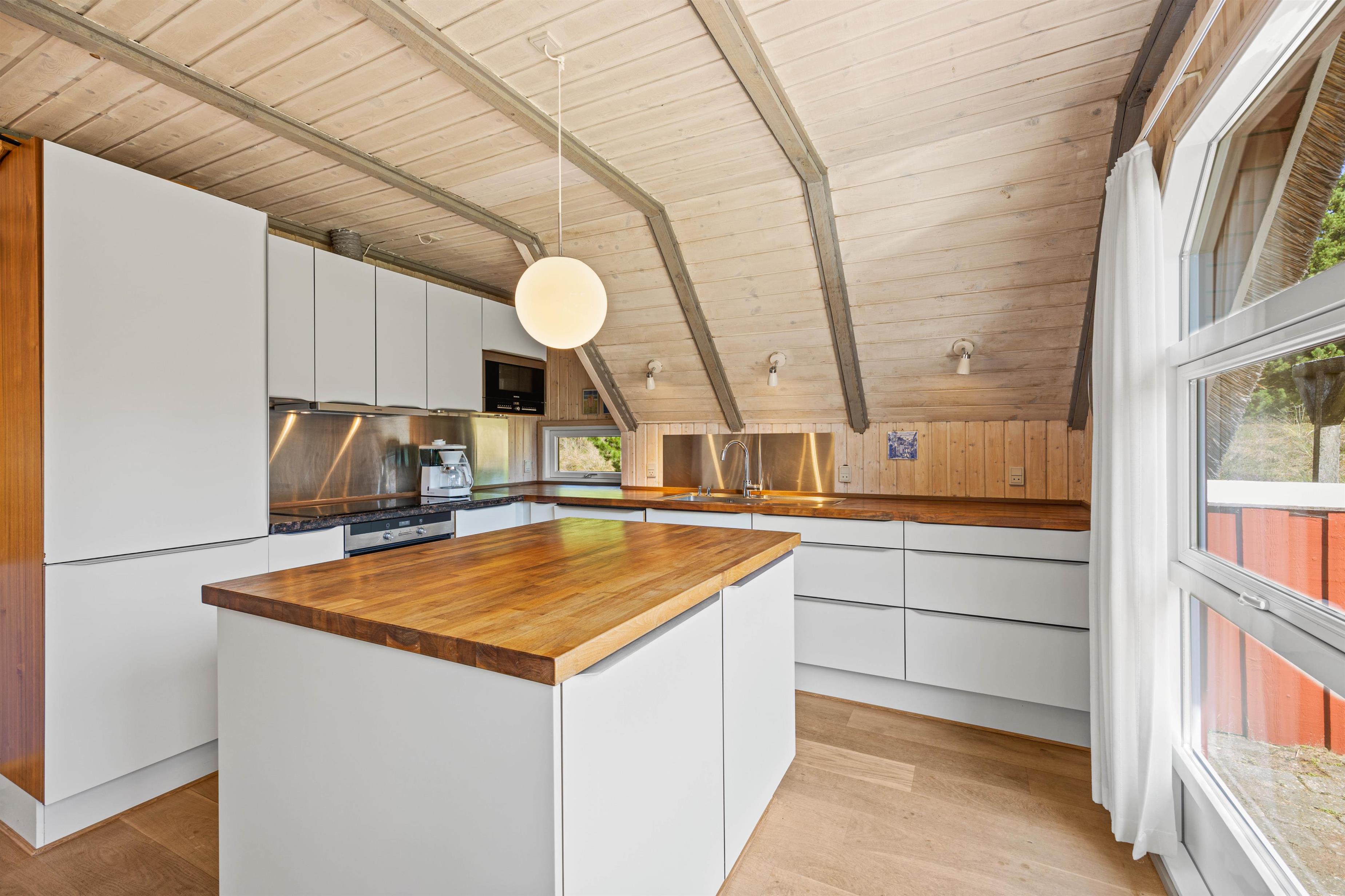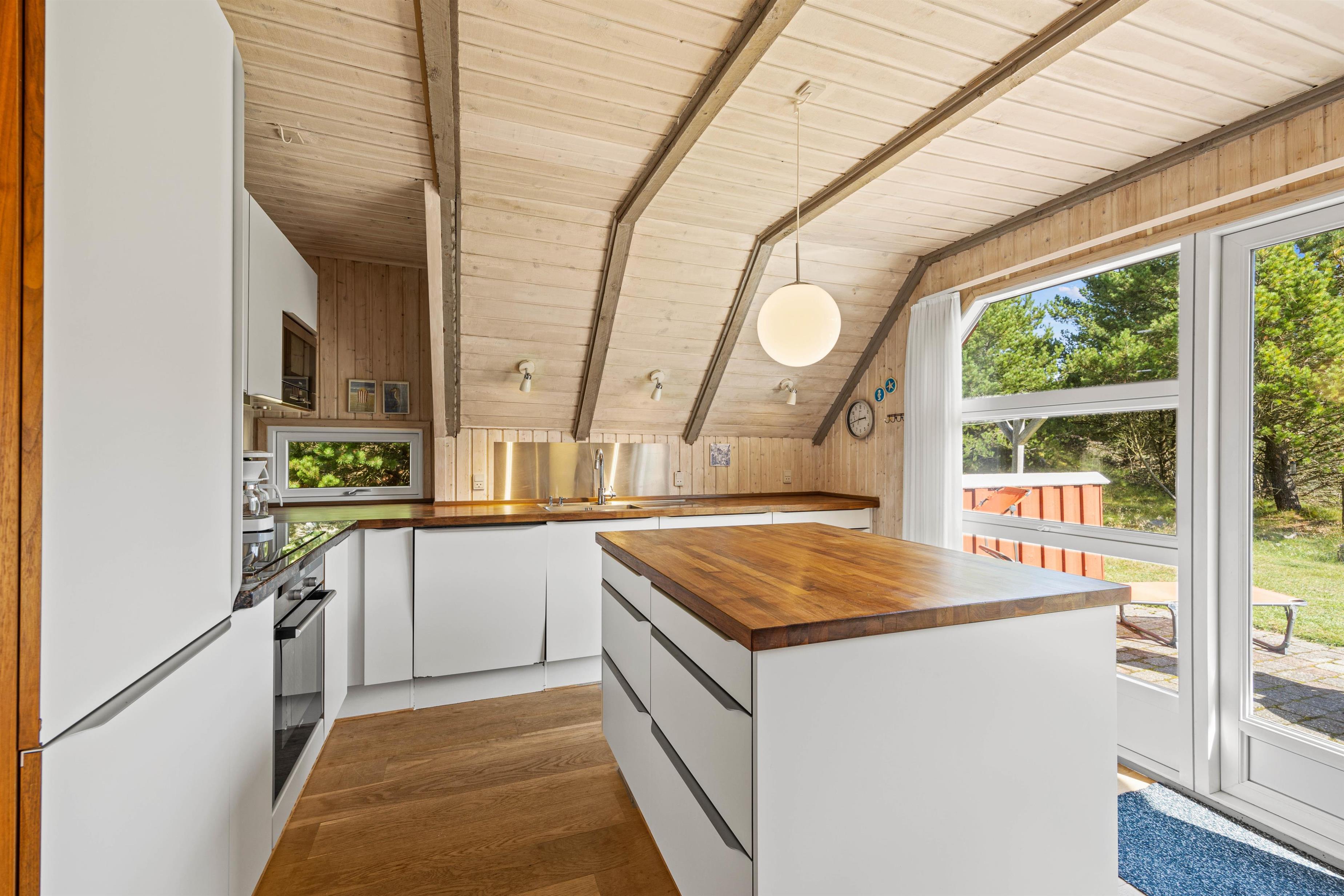 Efter entréen kommer I ind i opholdsstuen, som er indrettet med et lysgivende vinduesparti. Sammen med det lyse træ og de lave lofter får det jer hurtigt til at føle jer hjemme. Her kan I slappe af i sofaen, nyde et godt glas vin og lytte til knitren fra brændeovnen. Om aftenen kan I lave mad sammen i det moderne og veludstyrede køkken.