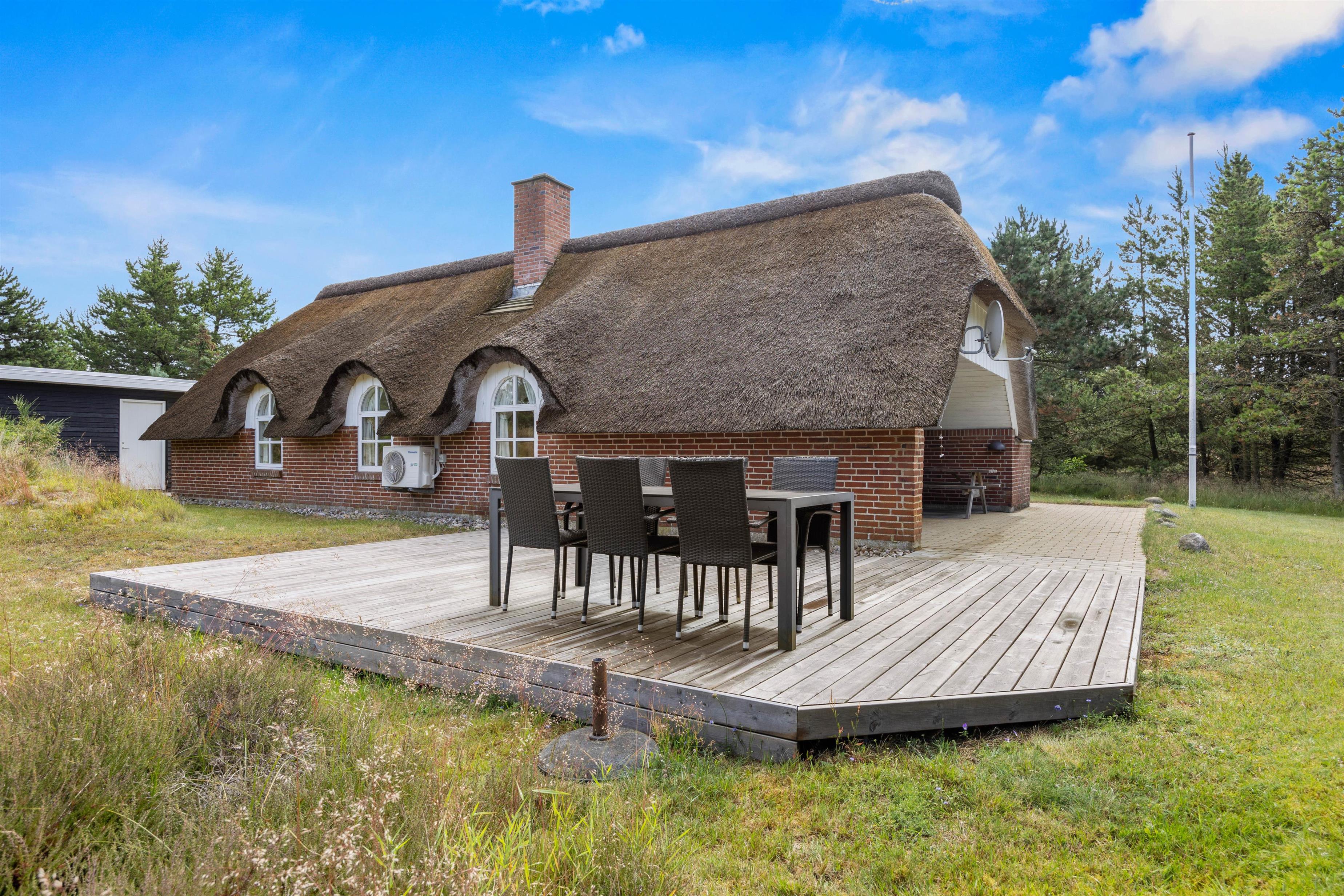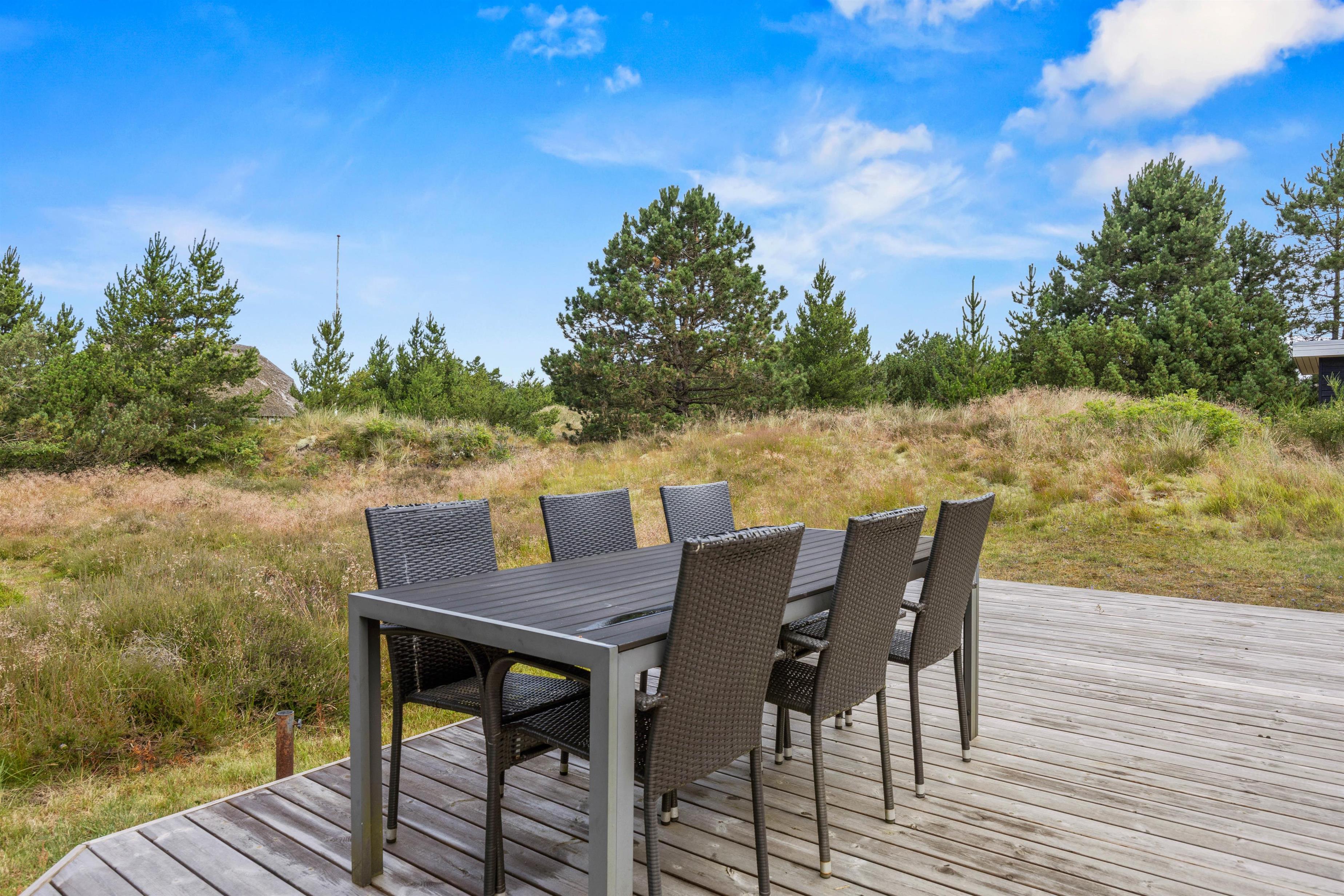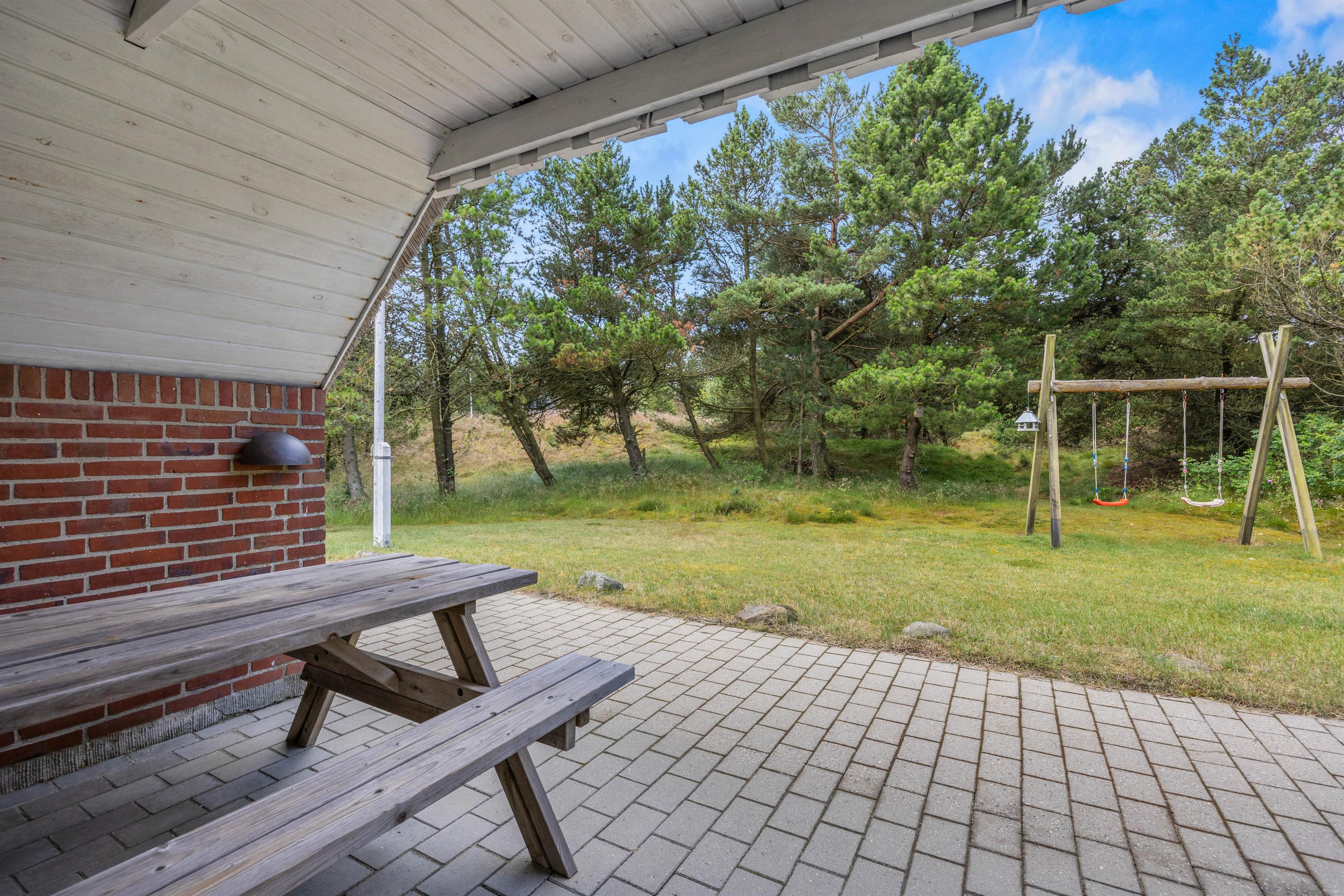 Terrassen er delvist overdækket, således I kan nyde frokosten i skyggen. Her finder I både havestole og liggestole, hvor I kan koble af fra hverdagen med en god bog. Hør fuglenes sang, slap af og nyd de smukke omgivelser omkring jeres sommerhus.