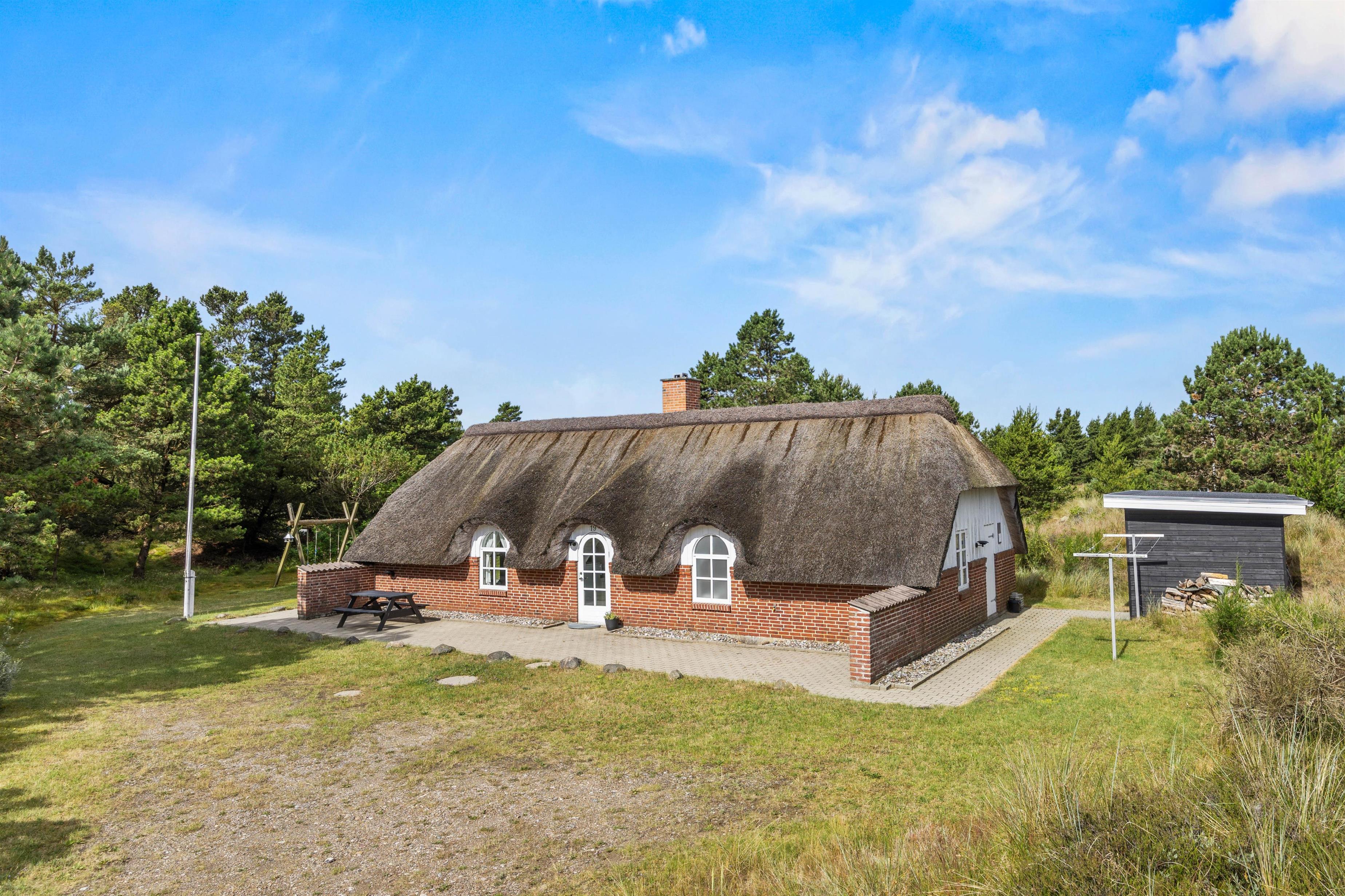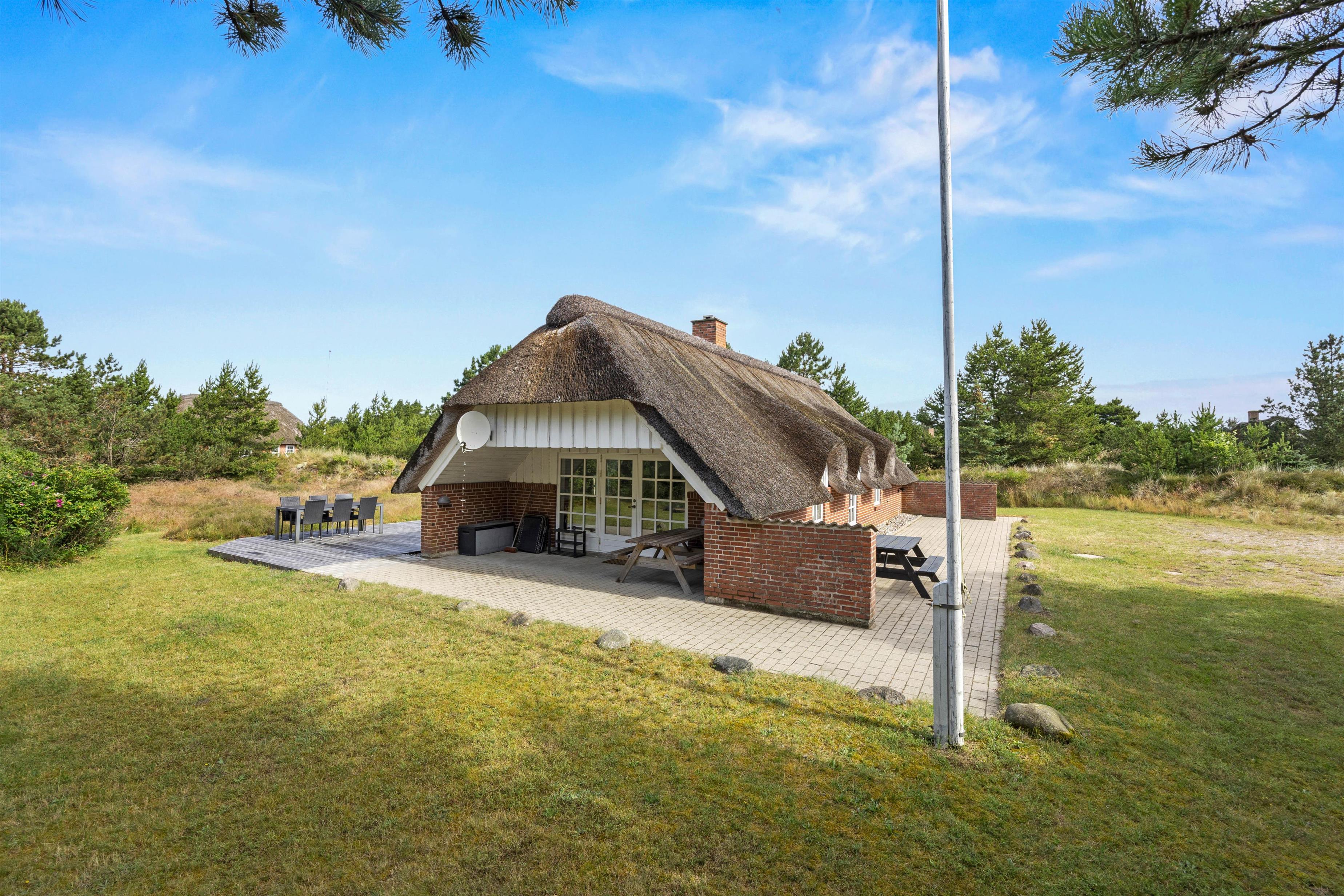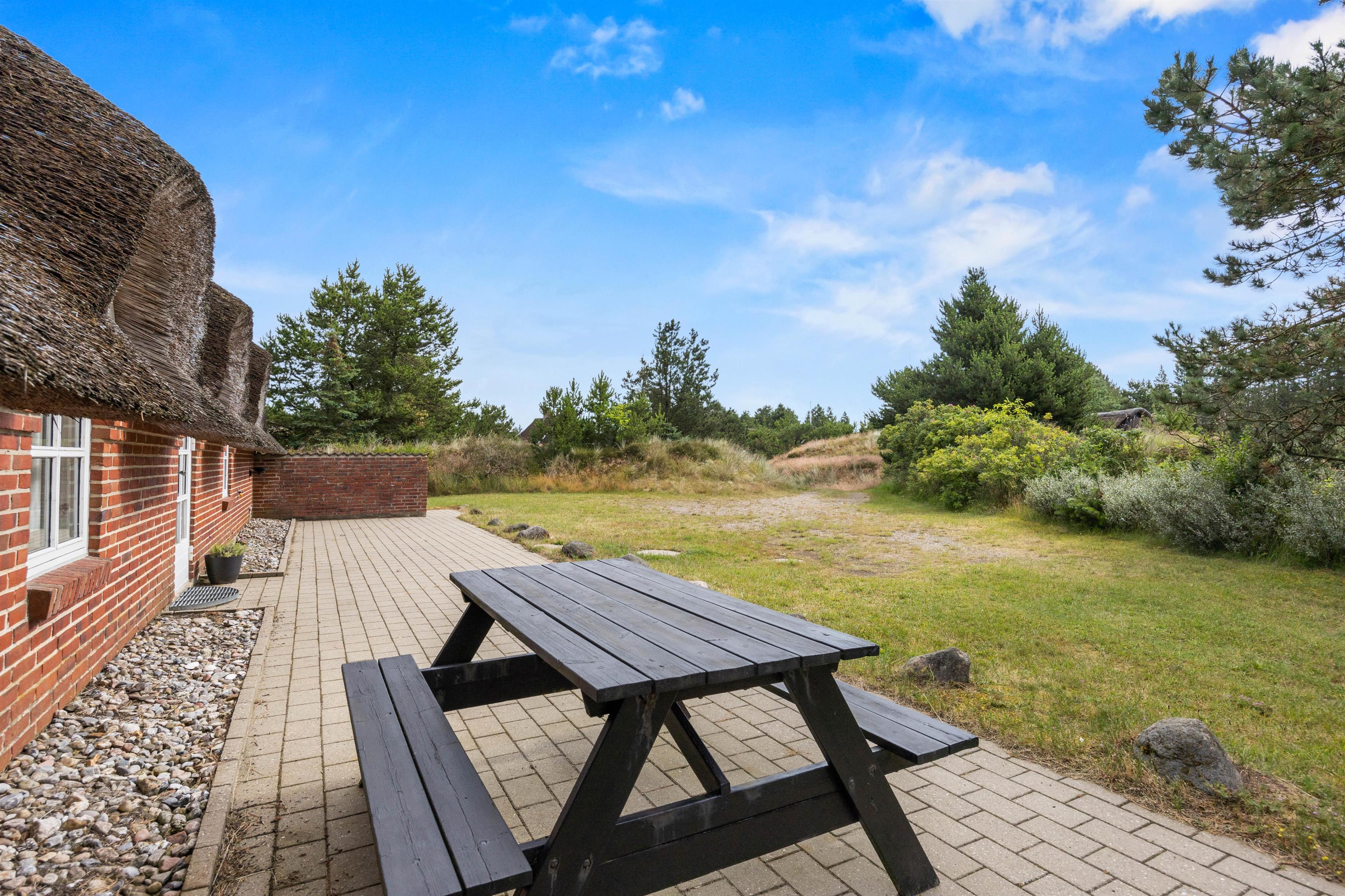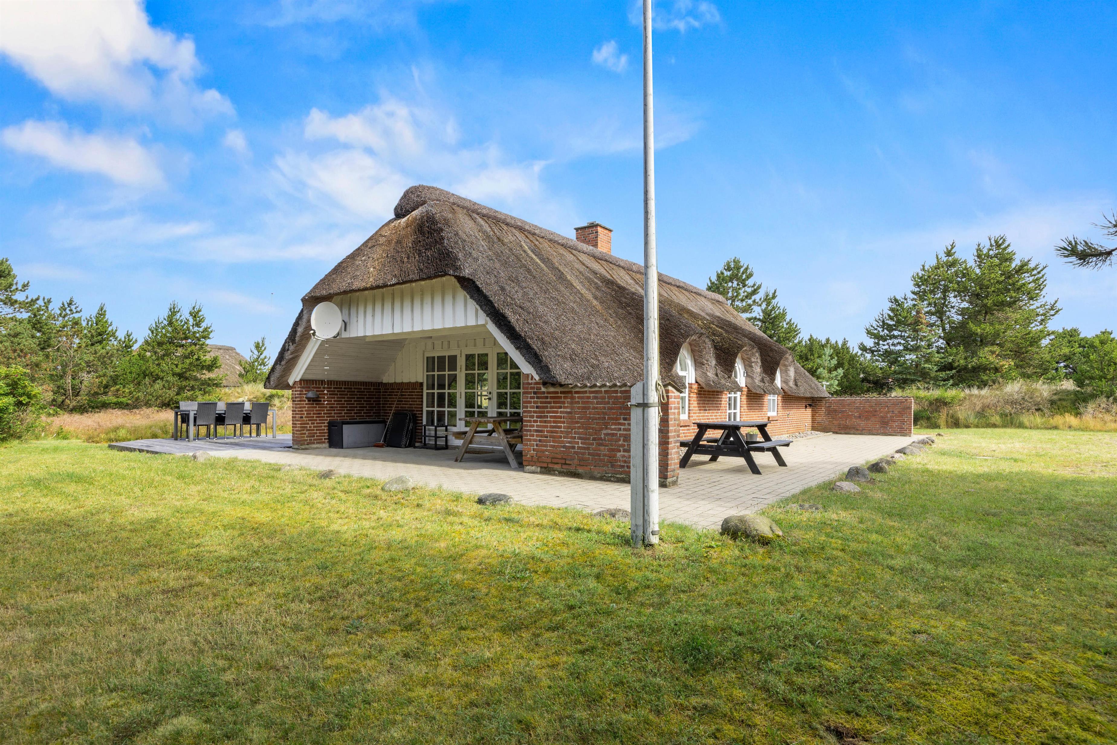 Terrassen er delvist overdækket, således I kan nyde frokosten i skyggen. Her finder I både havestole og liggestole, hvor I kan koble af fra hverdagen med en god bog. Hør fuglenes sang, slap af og nyd de smukke omgivelser omkring jeres sommerhus.