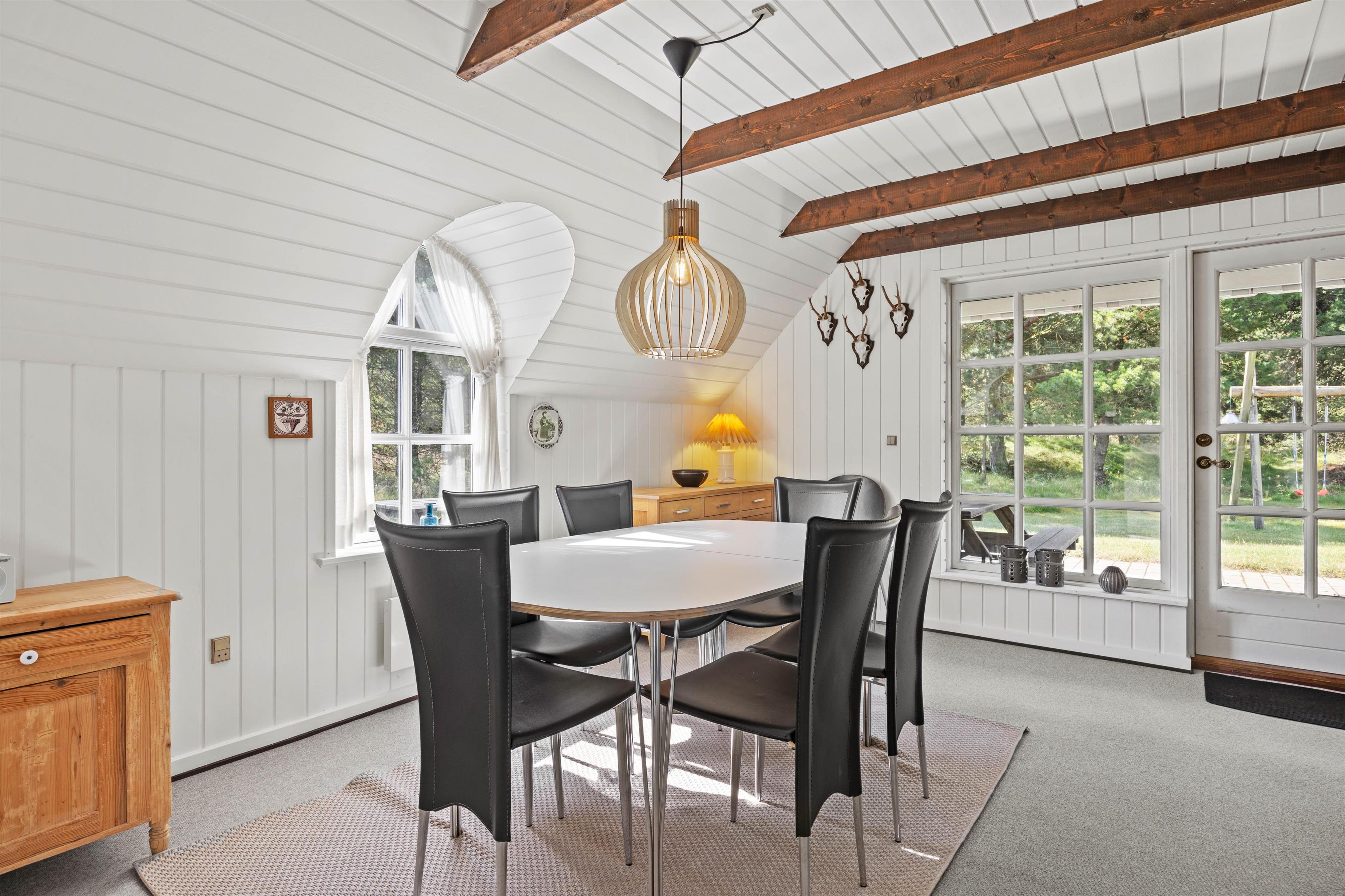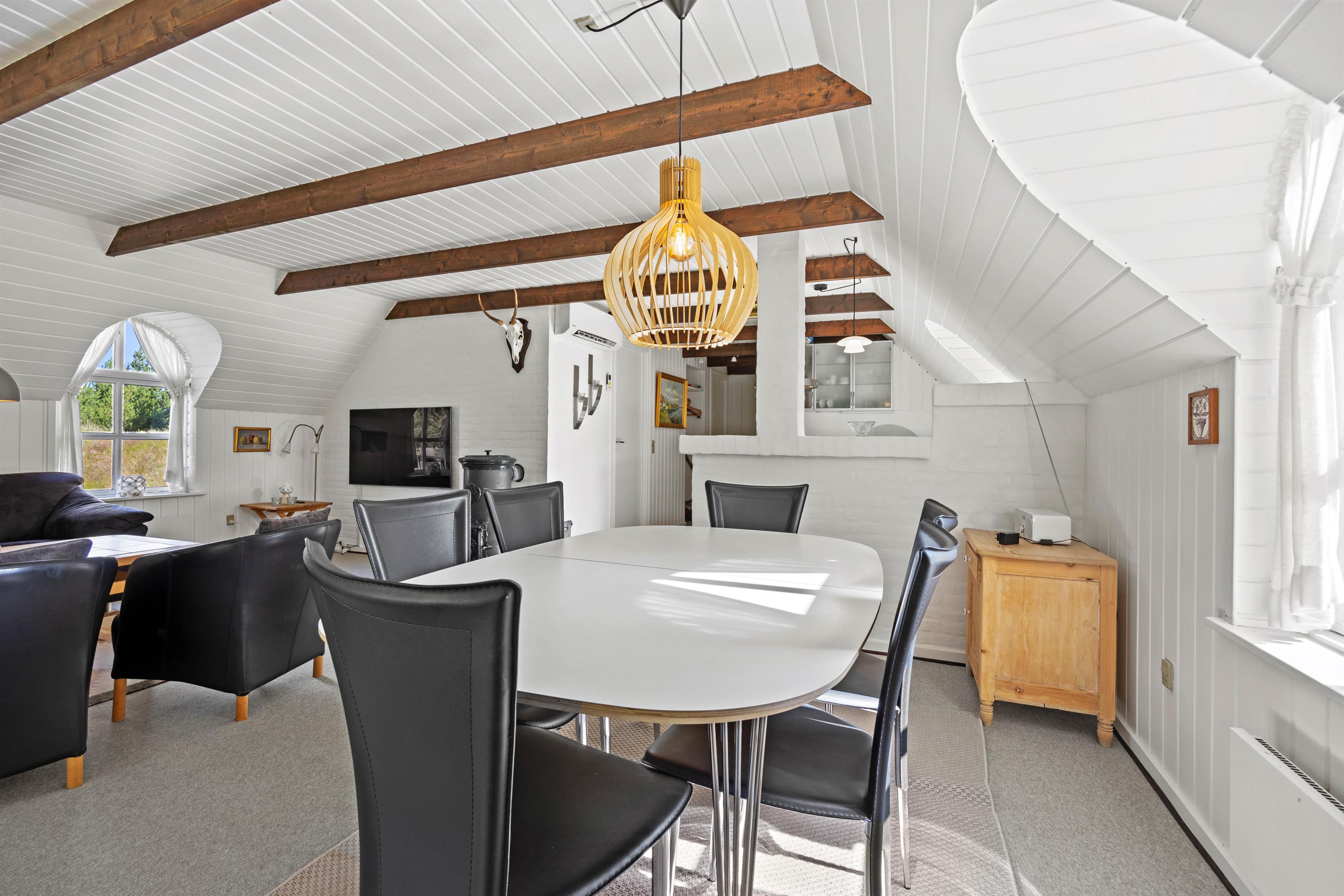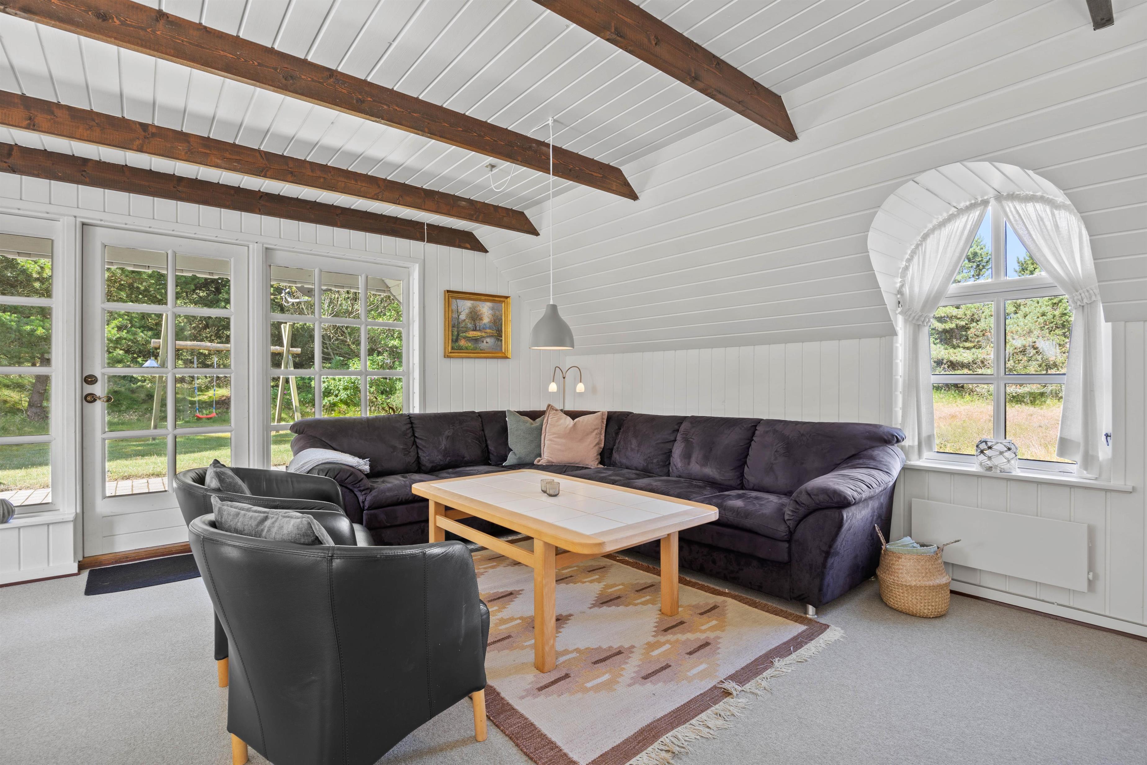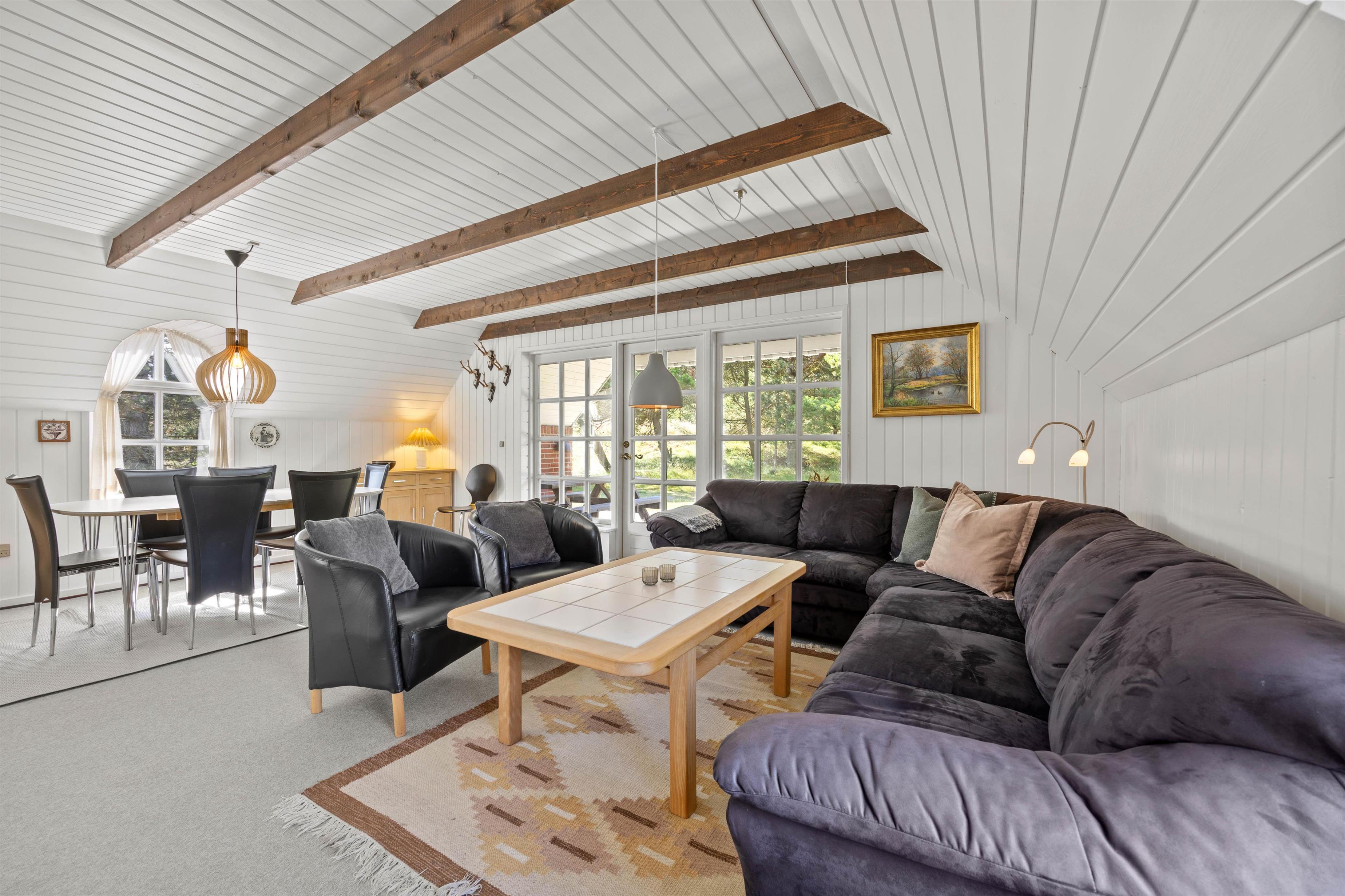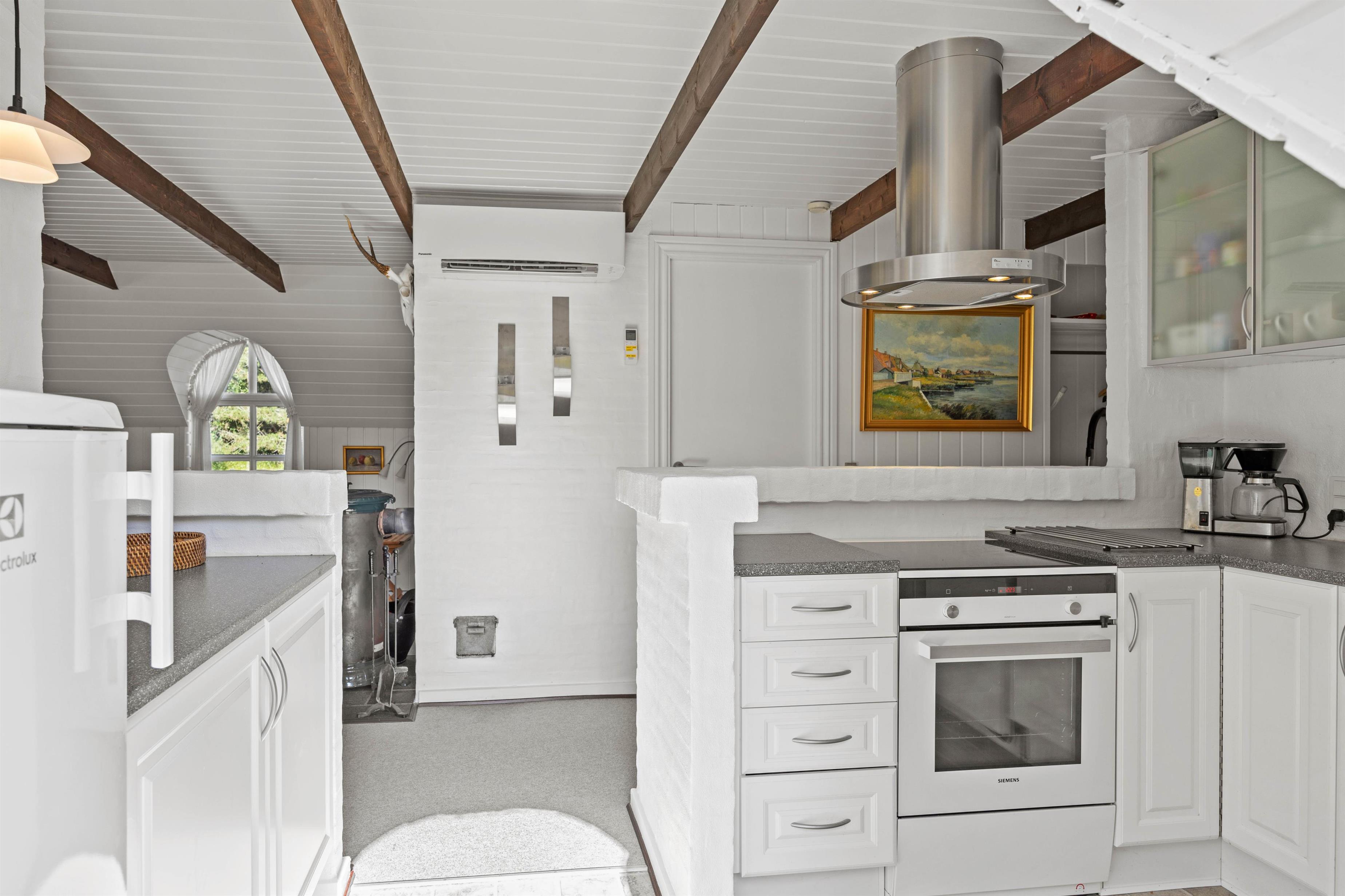 Praktisk er her installeret vaskemaskine, så I let kan vaske strandhåndklæderne under jeres ophold! I opholdsrummet hænger en energibesparende varmepumpe, og herfra er der ligeledes direkte udgang til sommerhusets terrasse.