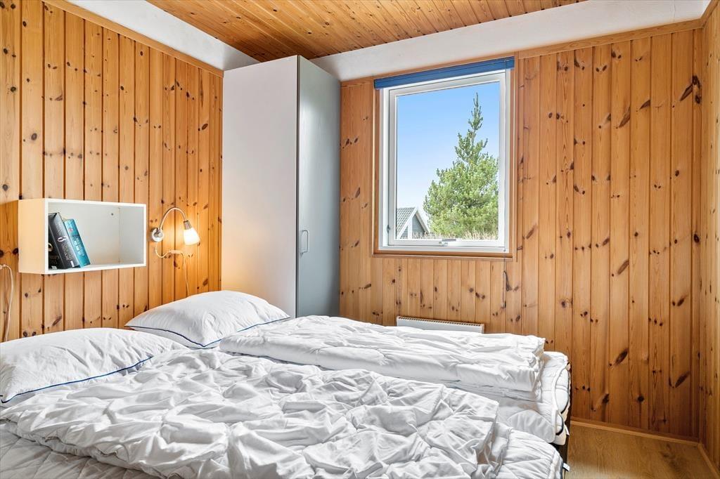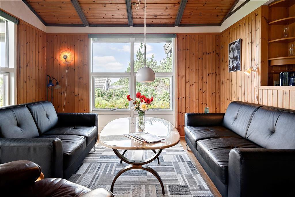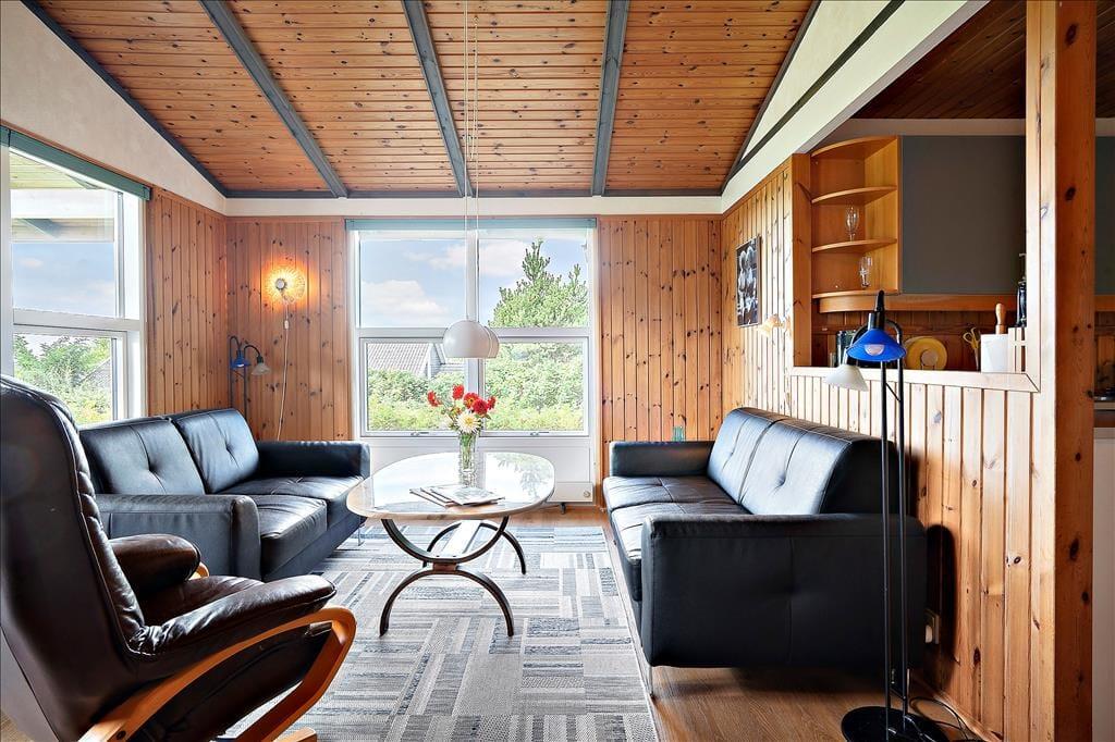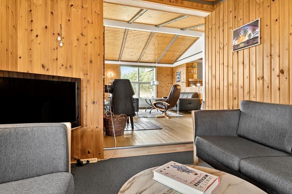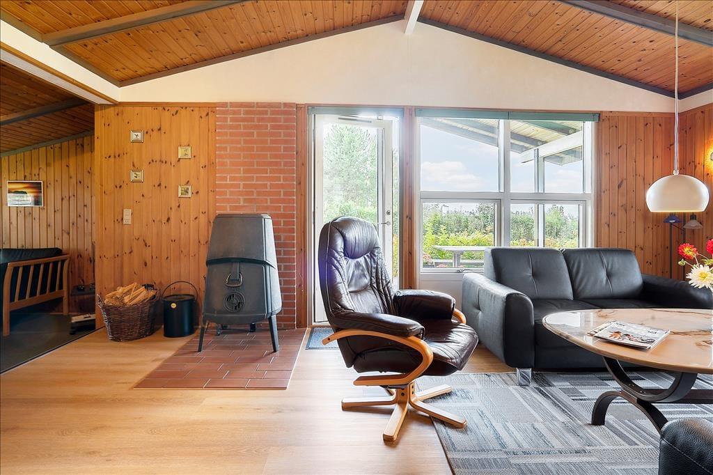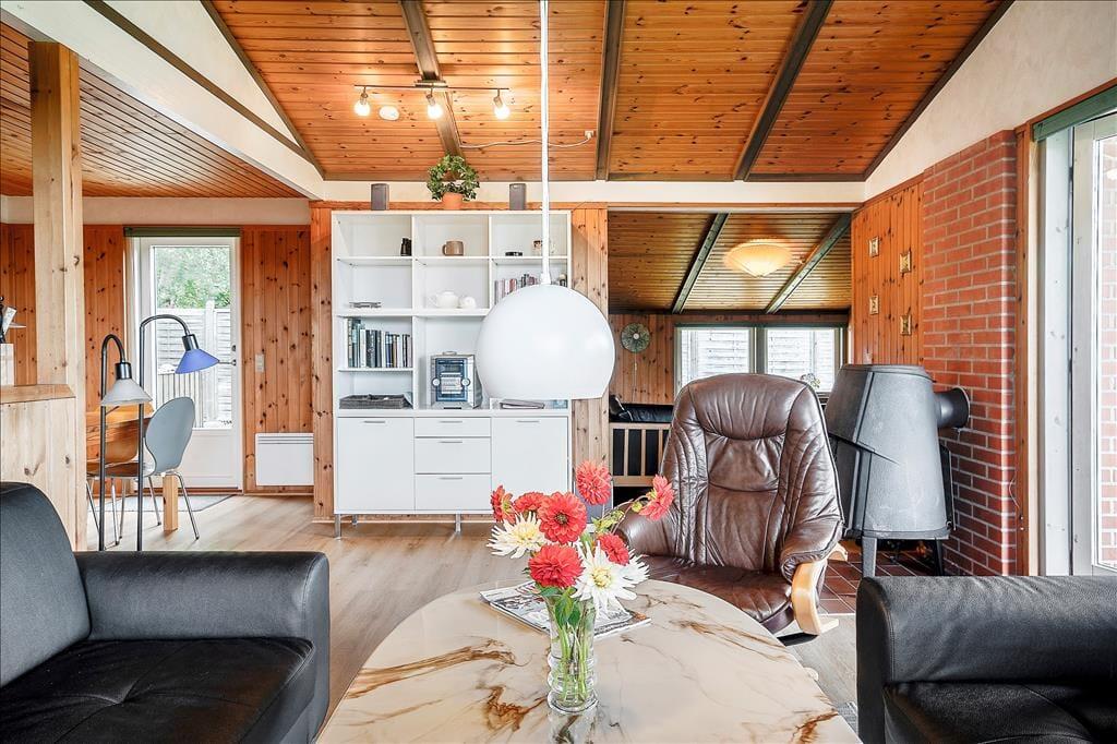Det store, lyse alrum har udgange til terrasser på begge sider af huset, og brændeovnen er placeret, så man har glæde af den ved både sofagruppen og spisepladsen. Hyggekrogen med fjernsyn ligger et trin forskudt. Køkkenet er renoveret og har bl.a. opvaskemaskine. Også badeværelset er renoveret; her er gulvvarme, bruseniche og vaskemaskine. De seks sovepladser er fordelt i tre rum med henholdsvis dobbeltseng, to enkeltsenge og køjeseng; skabe i alle soverum.