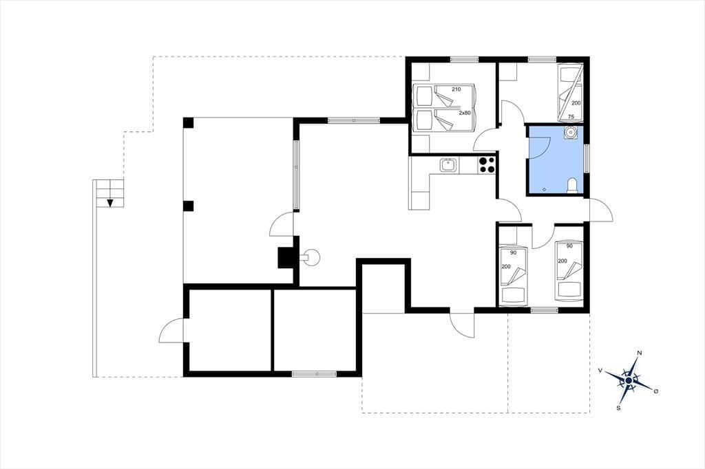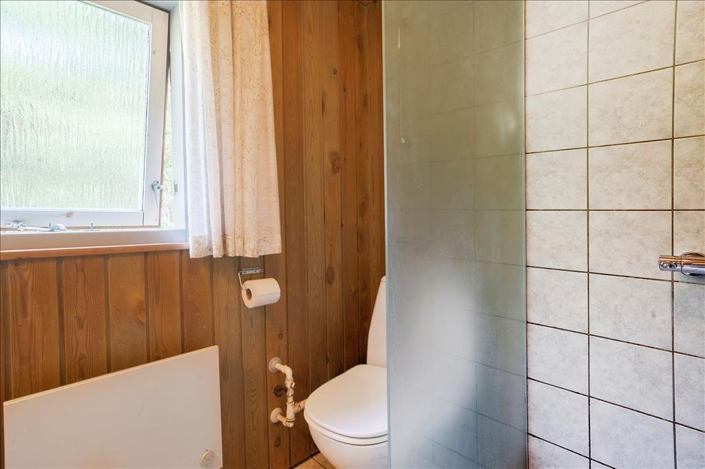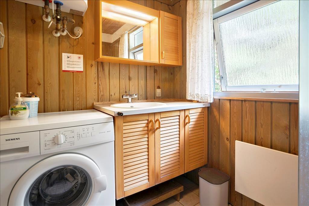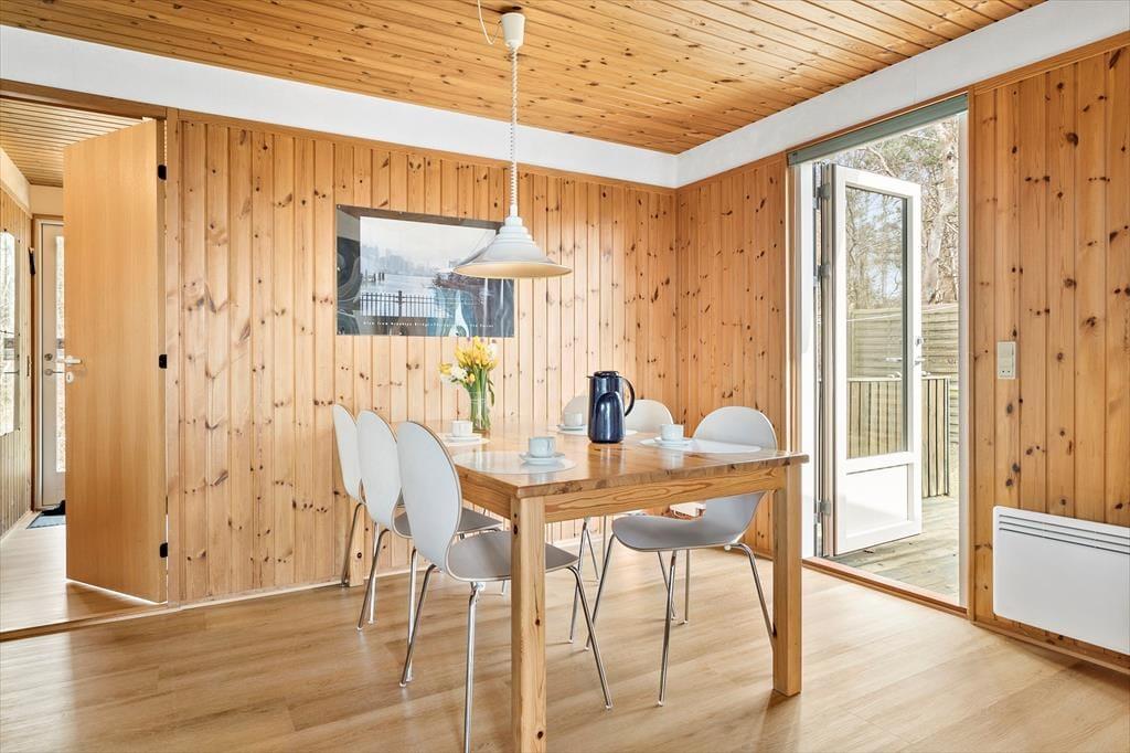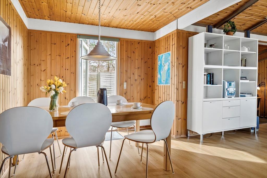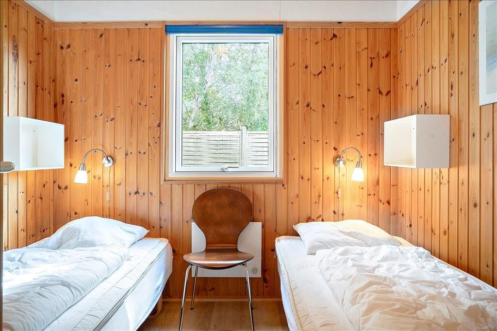 Det store, lyse alrum har udgange til terrasser på begge sider af huset, og brændeovnen er placeret, så man har glæde af den ved både sofagruppen og spisepladsen. Hyggekrogen med fjernsyn ligger et trin forskudt. Køkkenet er renoveret og har bl.a. opvaskemaskine. Også badeværelset er renoveret; her er gulvvarme, bruseniche og vaskemaskine. De seks sovepladser er fordelt i tre rum med henholdsvis dobbeltseng, to enkeltsenge og køjeseng; skabe i alle soverum.