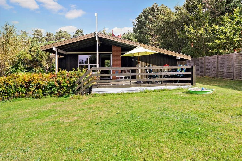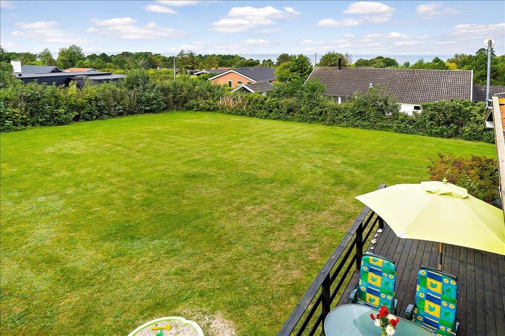 Den store træterrasse syd og vest for huset er delvist overdækket, så man kan nyde solen eller finde skygge og læ, når det er mere behageligt. En mindre terrasse mod øst er et oplagt sted at nyde morgenkaffen. Den store græsplæne omgivet af hæk og stakit giver masser af plads til leg og boldspil. Grill, havemøbler og parasol er til rådighed.