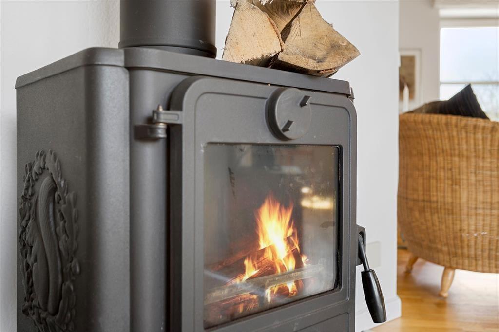 Stuen er også hyggeligt indrettet, her er både en brændeovn, hvor I kan tænde ekstra op for hyggen og varmen, når det er nødvendigt. I stuen er en god sofa og et TV, så her kan I slappe helt af efter en lang dag med oplevelser på Samsø. De lyse trælofter og store vinduer samt havedøren giver masser af lys ind i stuen, og I kan nyde udsigten ud i haven.