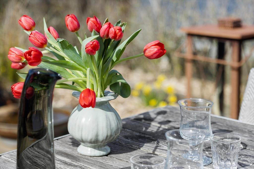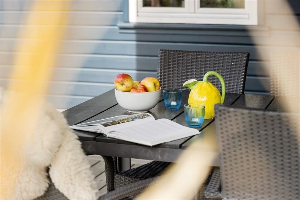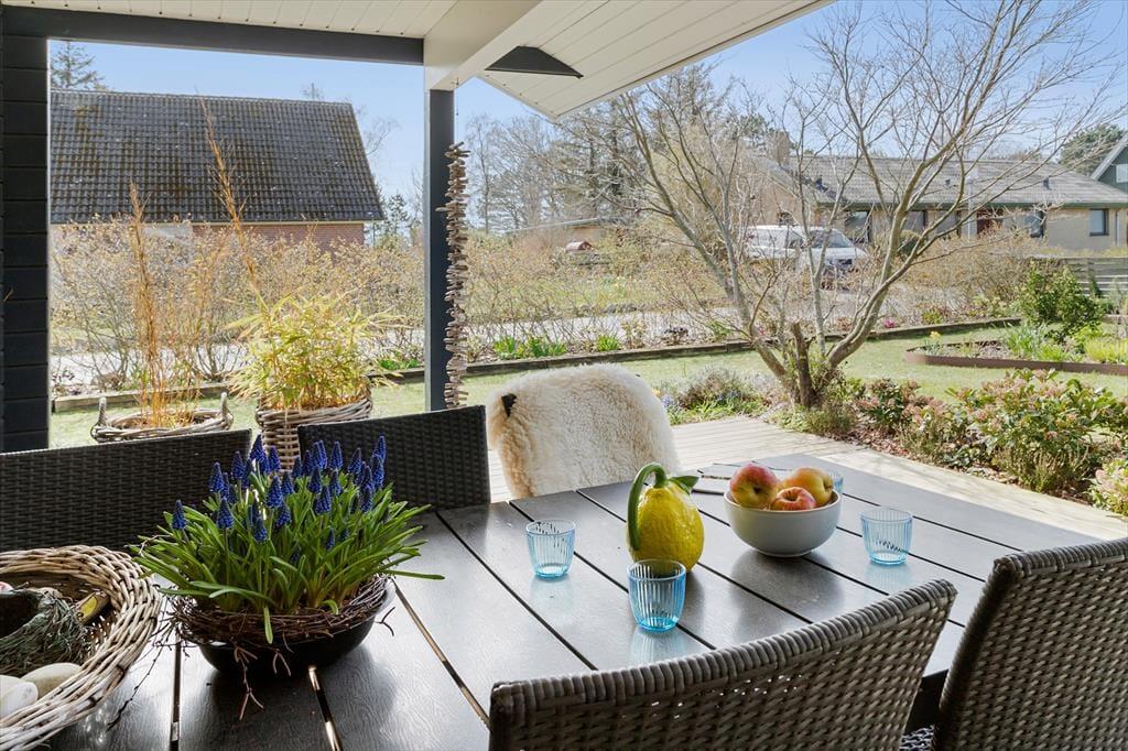 Fra stuen er der direkte udgang til den overdækkede vestvendte terrasse, så her kan I sidde i læ og nyde jeres måltider. På modsatte side af huset er der endnu en dejlig terrasse. Dette er et ideelt sted at sætte sig, når solen skinner over Samsø. Gå på opdagelse i haven og nyd de grønne omgivelser og de fine krukker og bede med blomster. Ved huset er også en god indkørsel og en garage, så praktikken er helt på plads, når I skal holde ferie her.