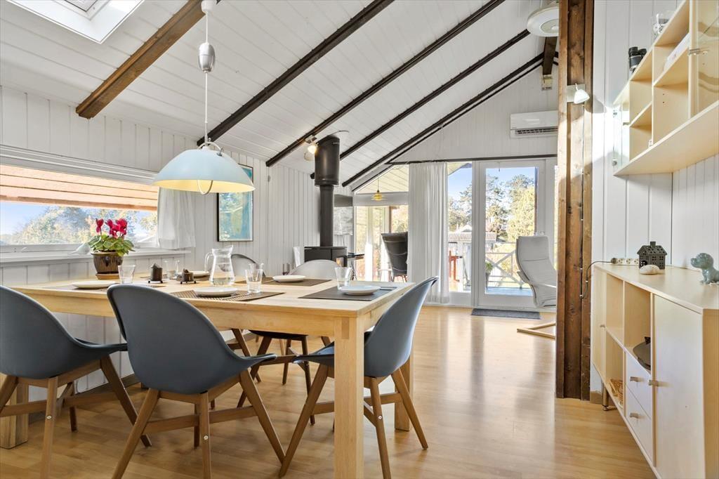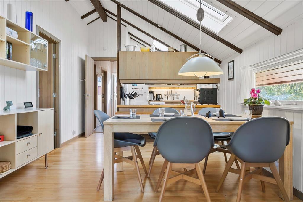 Køkkenet er veludstyret med gode faciliteter til at tilberede feriens måltider. I forlængelse af køkkenet ligger spiseområdet lidt afsides fra resten af stuen. Her er det lyst og indbydende med store vinduer, der giver udsigt til terrassen og haven.