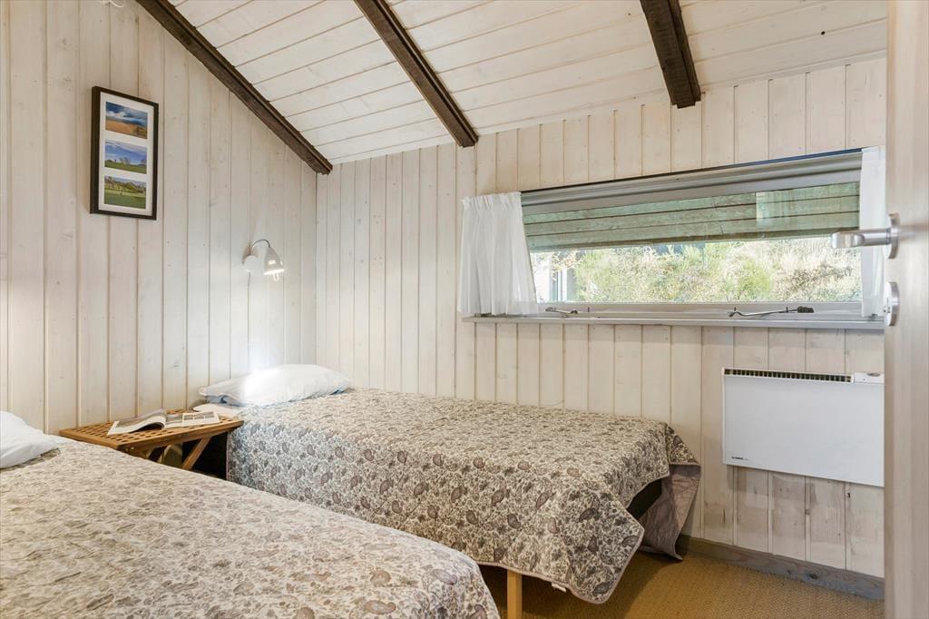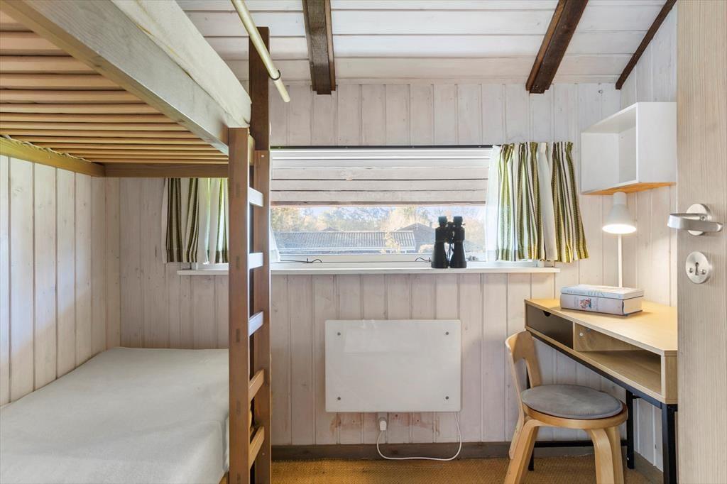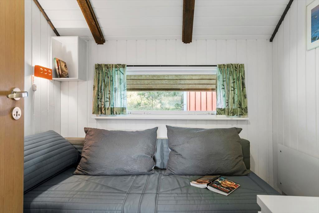 En mellemgang fører til de tre soveværelser og badeværelset. Det ene soveværelse har en dobbeltseng, det andet en dobbelt sovesofa, og det tredje en køjeseng til to børn. Værelserne er små, men hyggeligt indrettet med trævægge, sengelamper og opbevaringsplads. Badeværelset har de nødvendige faciliteter som bruser, og resten af huset opvarmes af en varmepumpe og el-radiatorer.