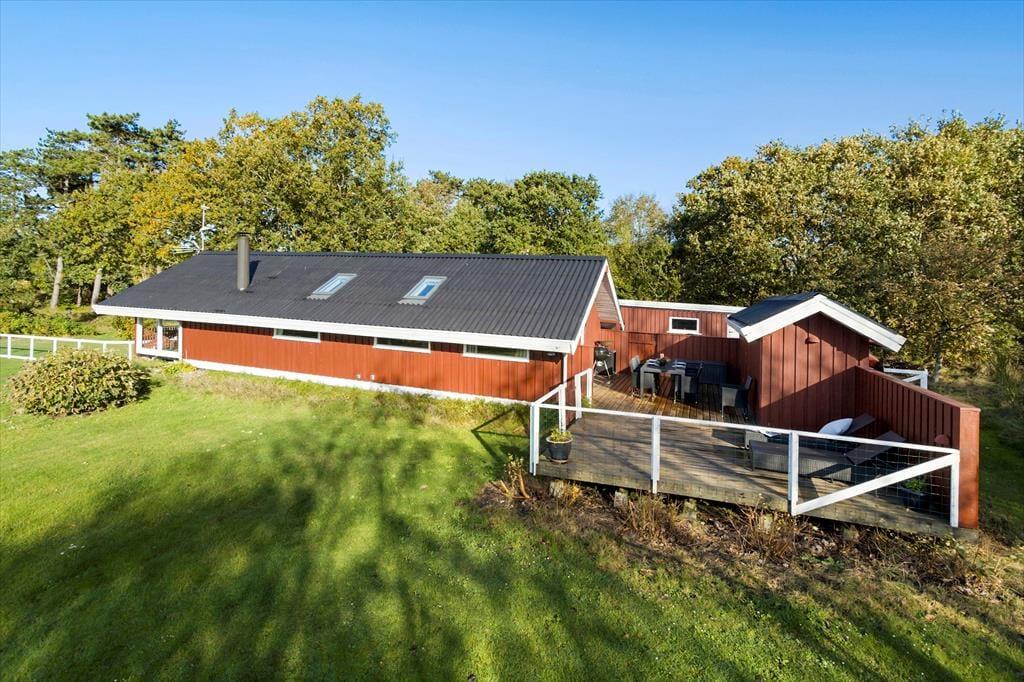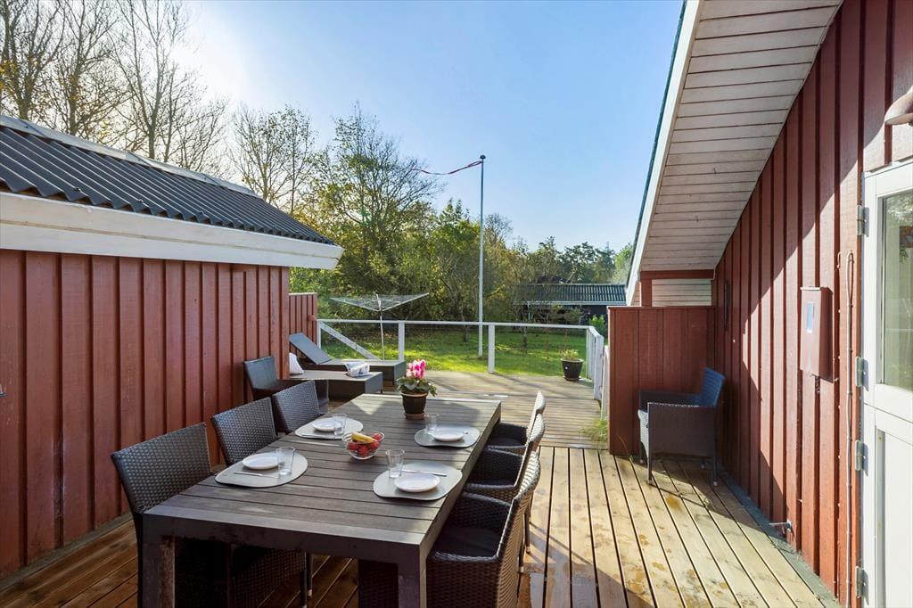 Sommerhuset ligger på en stor, aflukket grund omkranset af træer og buske, som gør det muligt at nyde udelivet ugeneret. På græsset er der god plads til leg, og af og til kommer en hare forbi. Terrassen, der vender mod sydvest, er delvist overdækket og tilbyder fremragende udsigt over området. Her er både havemøbler og en grill, så måltiderne kan nydes udendørs. Der er desuden gode parkeringsmuligheder ved huset.
