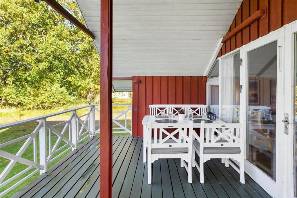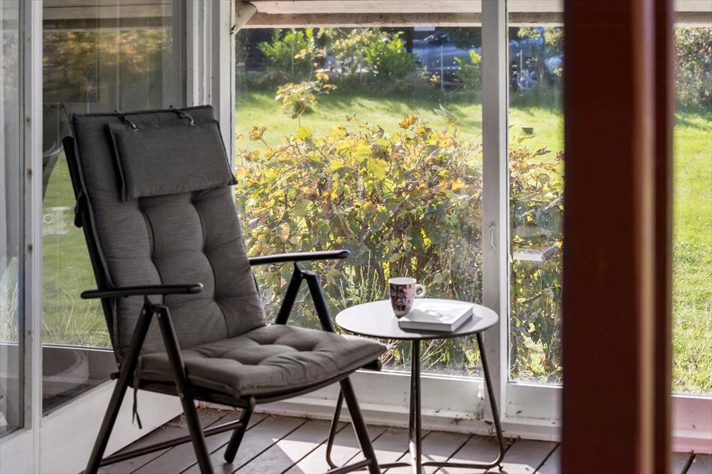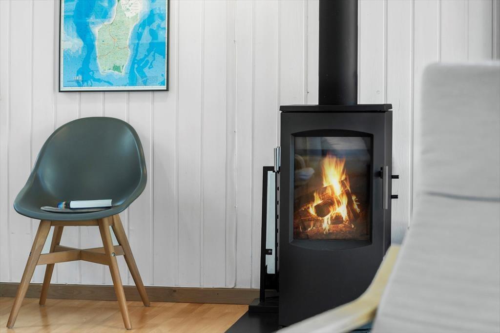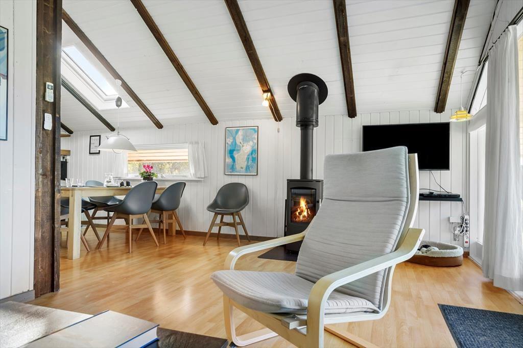 I det samme åbne rum findes stuen med komfortable møbler, som indbyder til afslapning og hygge. Her er også et TV samt gratis WiFi. Ved sofahjørnet er der et stort vinduesparti, som giver et dejligt lysindfald og udsyn til den grønne have. Centralt i rummet står en brændeovn, der kan skabe både varme og hygge i de kolde måneder. Fra stuen er der udgang til terrassen, som er delvist overdækket. Det er oplagt at nyde sine måltider udendørs, når vejret tillader det.