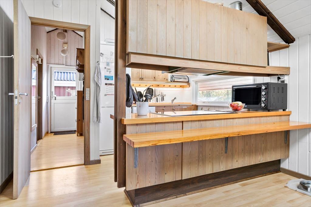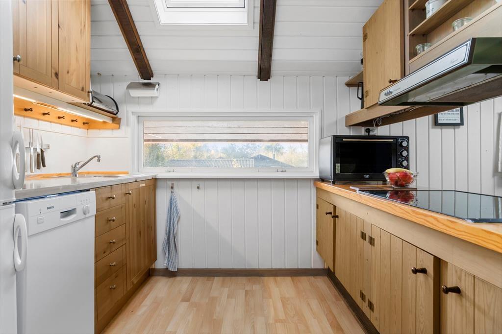 I det fredelige sommerhusområde Vesterløkken ligger dette hus med en god udsigt over området. Sommerhuset er et ældre, klassisk træhus hyggeligt indrettet i en charmerende sommerhusstil. Hygge og samvær er i fokus i køkkenalrummet, hvor der er plads til alle gæster. I det åbne køkken kan alle være sammen, uanset om nogen laver mad, mens andre sidder ved spisebordet eller i sofaen.
