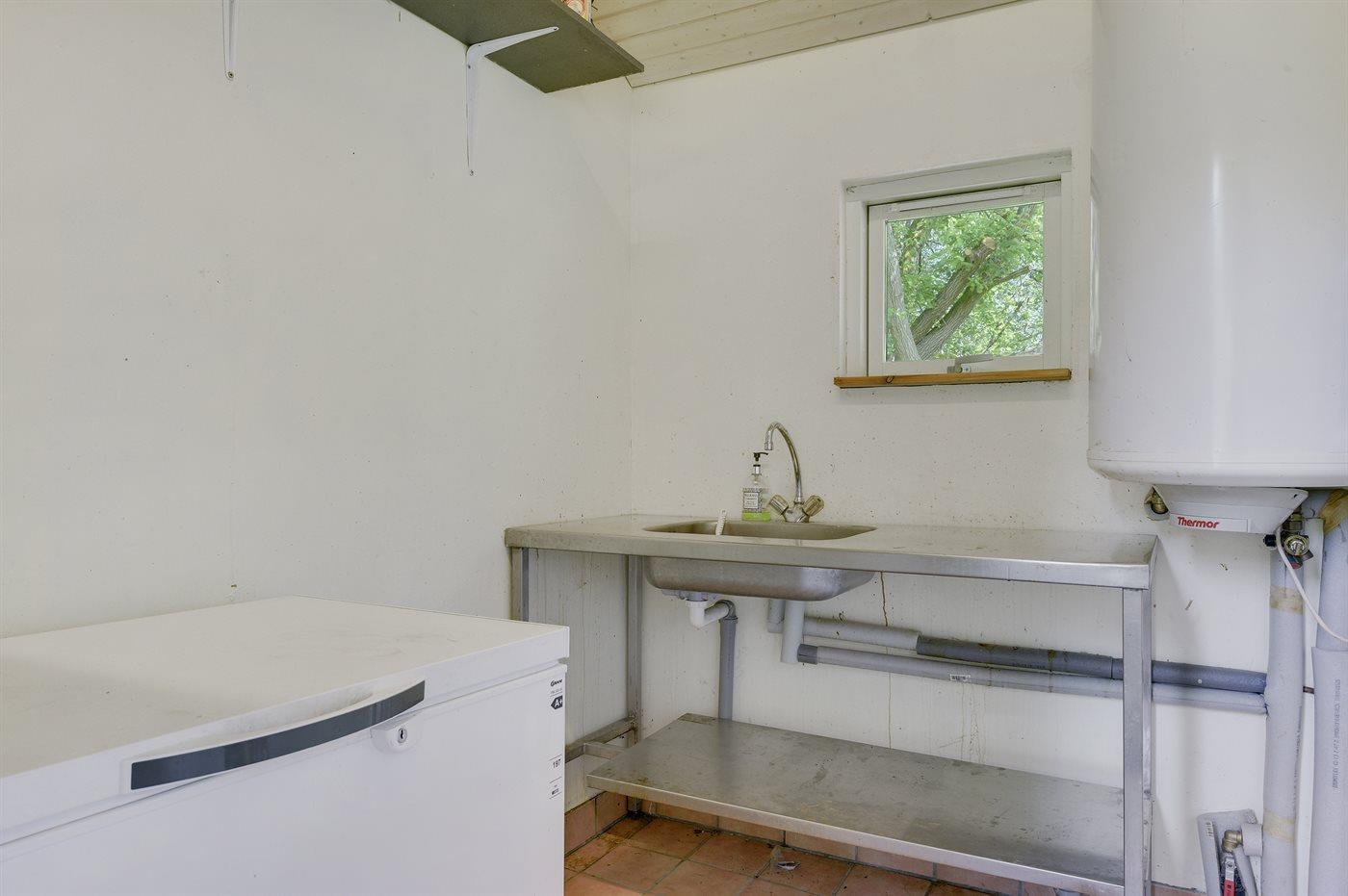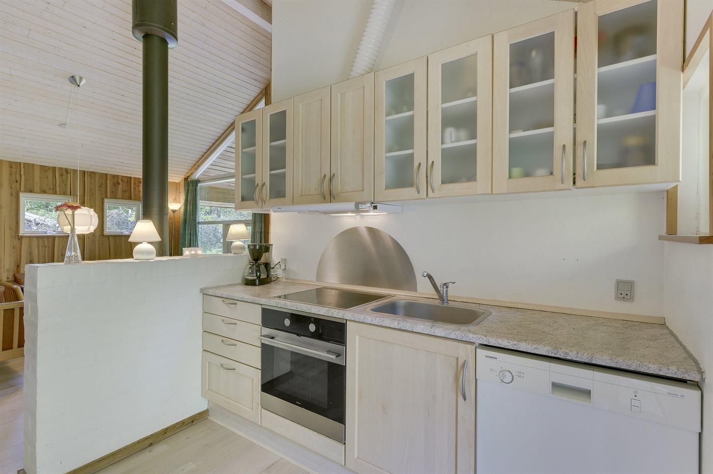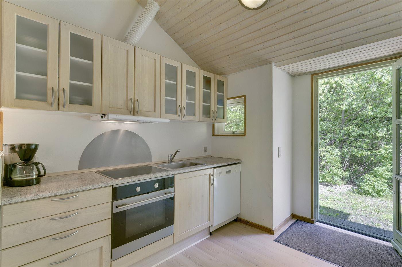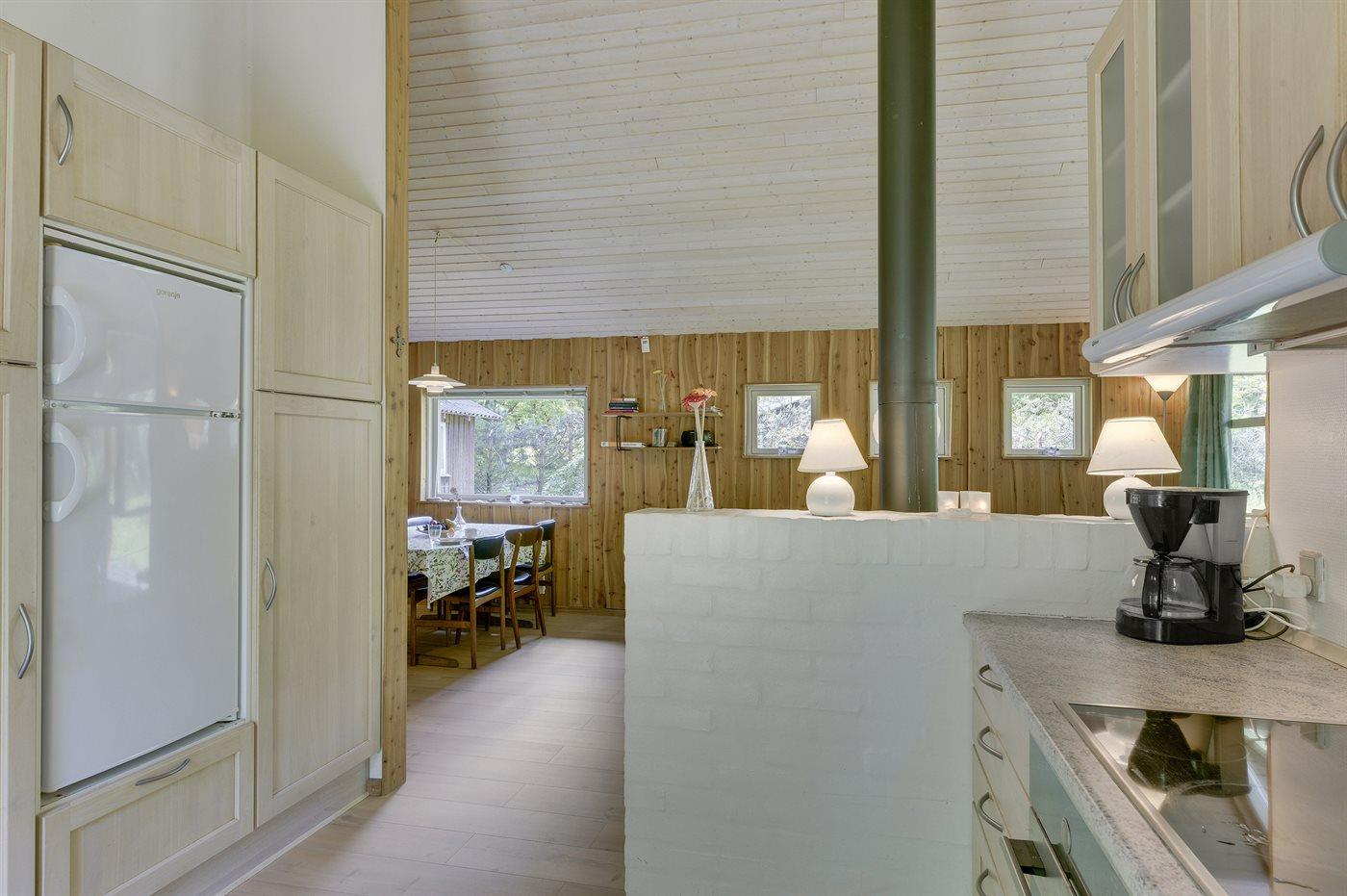 Køkkenet er udstyret med 1 køleskab. Der er 4 keramiske kogeplader, varmluftovn, mikrobølgeovn samt opvaskemaskine.