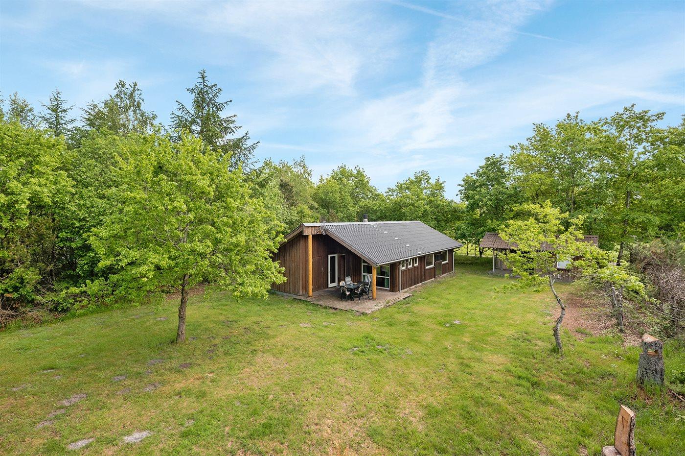 Midt i den skønne midtjyske natur ligger dette velholdte og hyggelige sommerhus i et område, som er kendt for sit unikke egetræskrat, og på husets grund kan man nyde synet af to smukke egetræer. Området byder ligeledes på gode faciliteter til lystfiskere, og i det lille udhus som hører til huset, finder man stålvask og stor dybfryser.