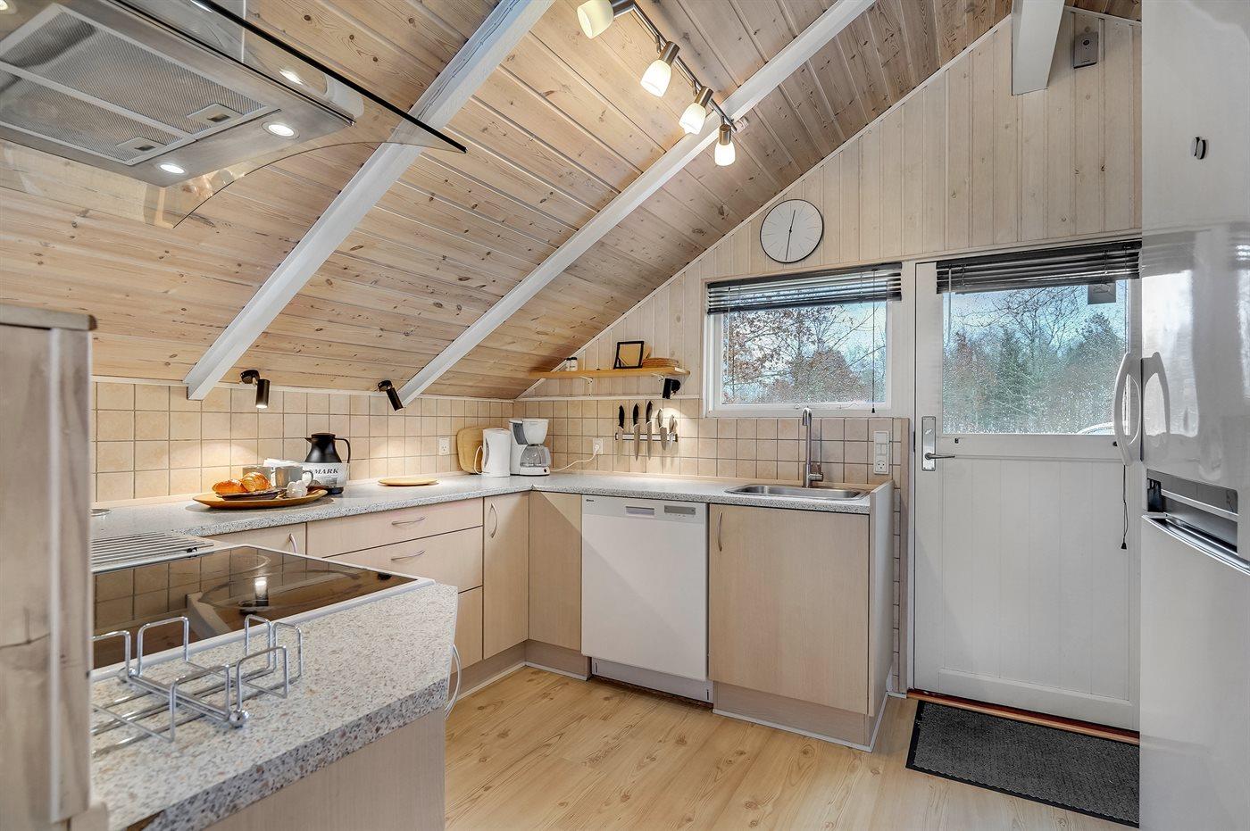 Køkkenet er udstyret med 1 køleskab. Der er 4 keramiske kogeplader, varmluftovn, mikrobølgeovn samt opvaskemaskine.