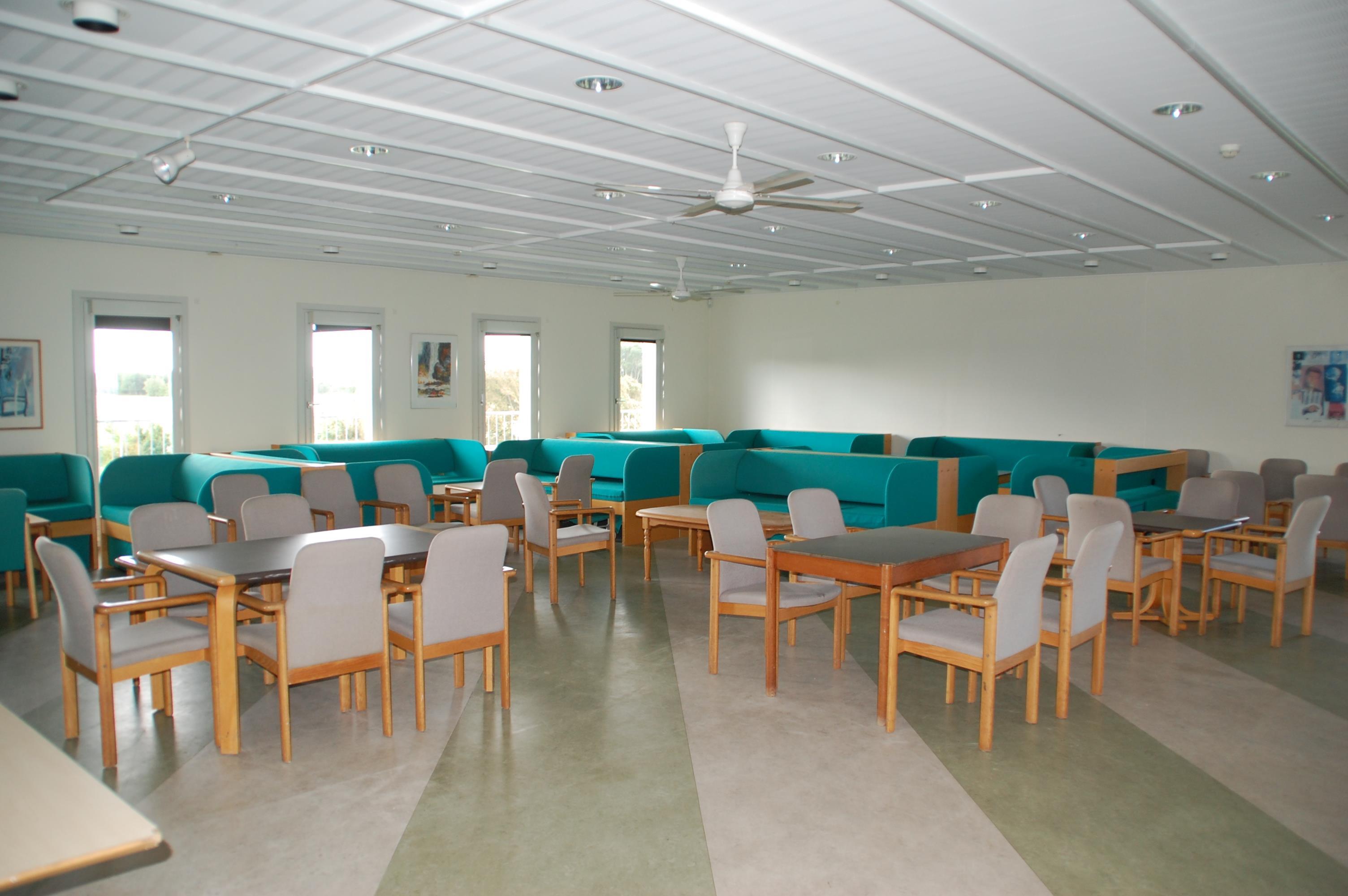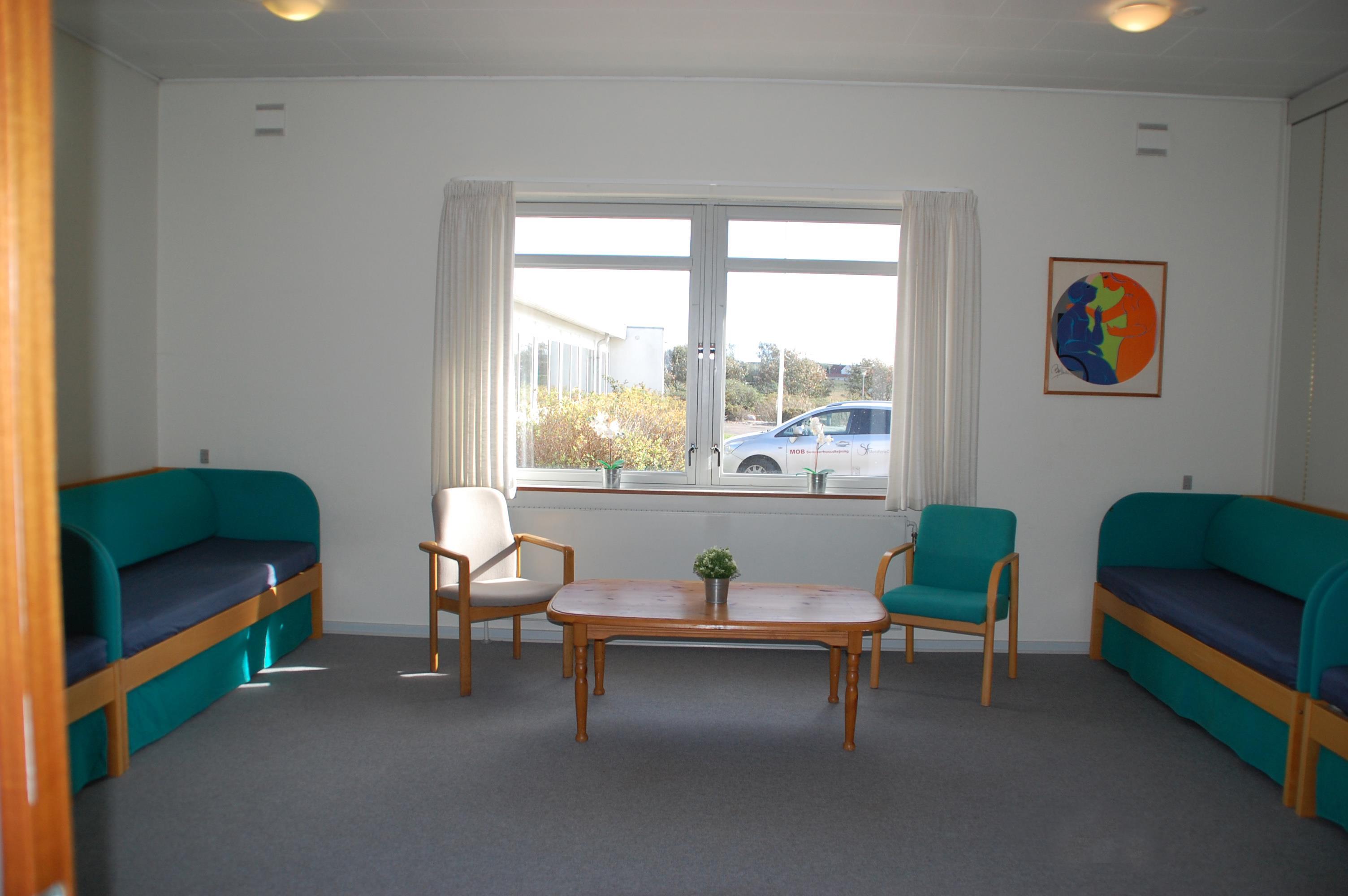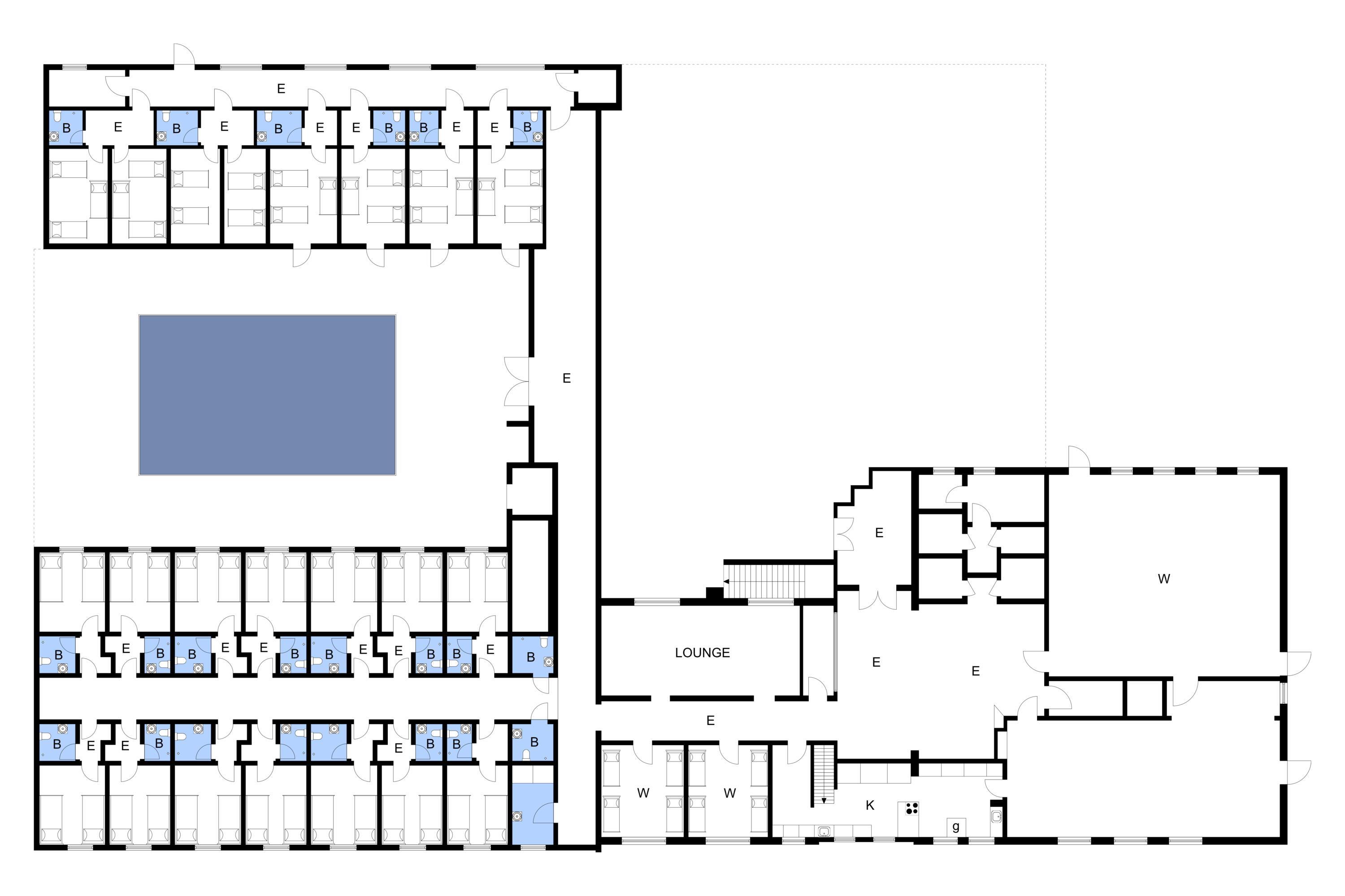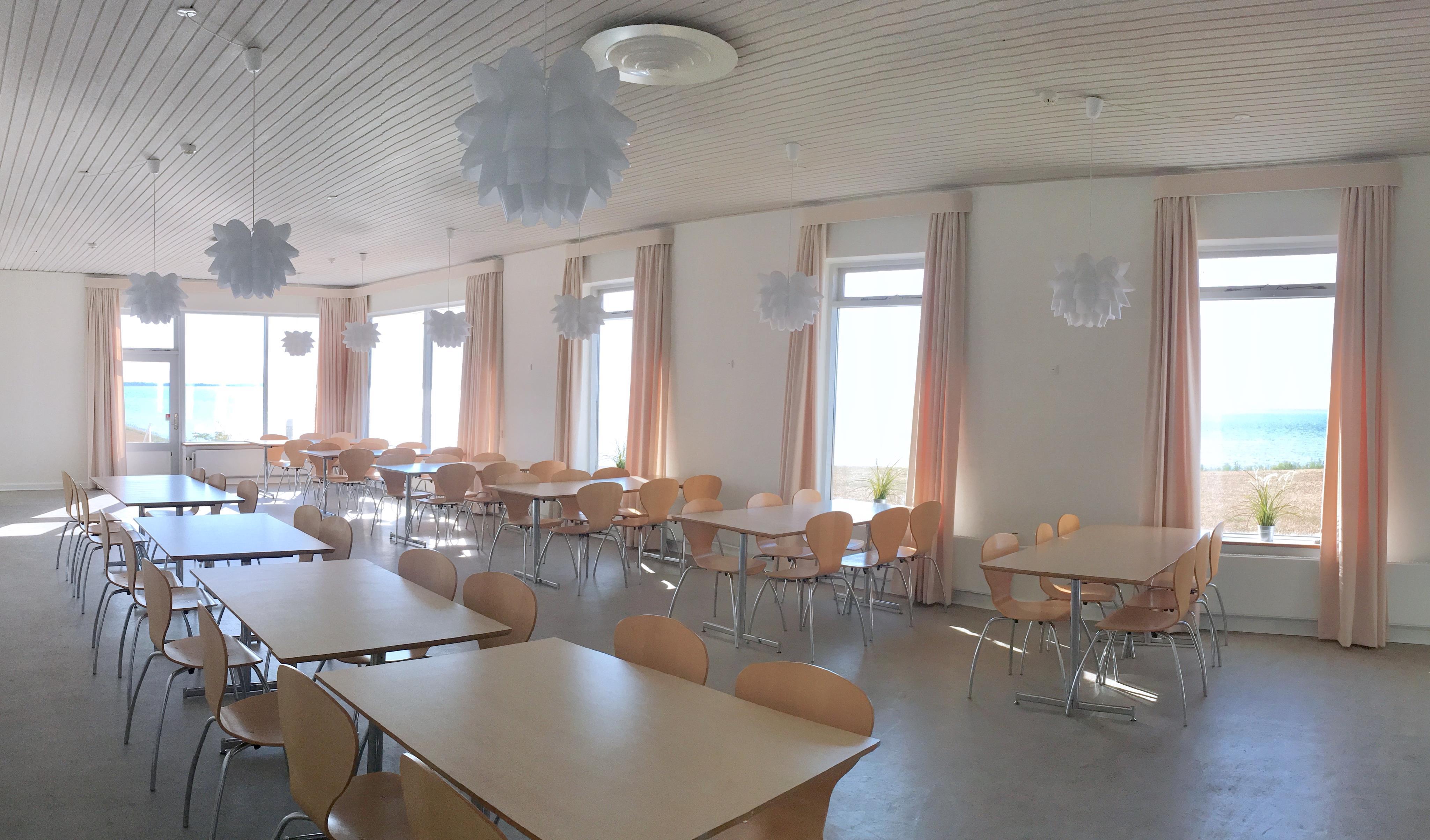 Der er en stor hall med reception og 4 gæstetoiletter. Der går en fordelingsgang ned i ”nord- og sydfløjen” med i alt 24 soveværelser med 2 enkeltsenge i hvert samt 22 badeværelser. 4 af værelserne i ”sydfløjen” har direkte udgang til den udendørs swimmingpool, som kan benyttes i perioden 1/5 – 30/9. Der er derudover et vaskerum med to vaskemaskiner og to tørretumblere. Med egen indgang er der en ”krostue”, hyggeligt møbleret med billardbord, dart, TV og bar med bl.a. vinkøler.