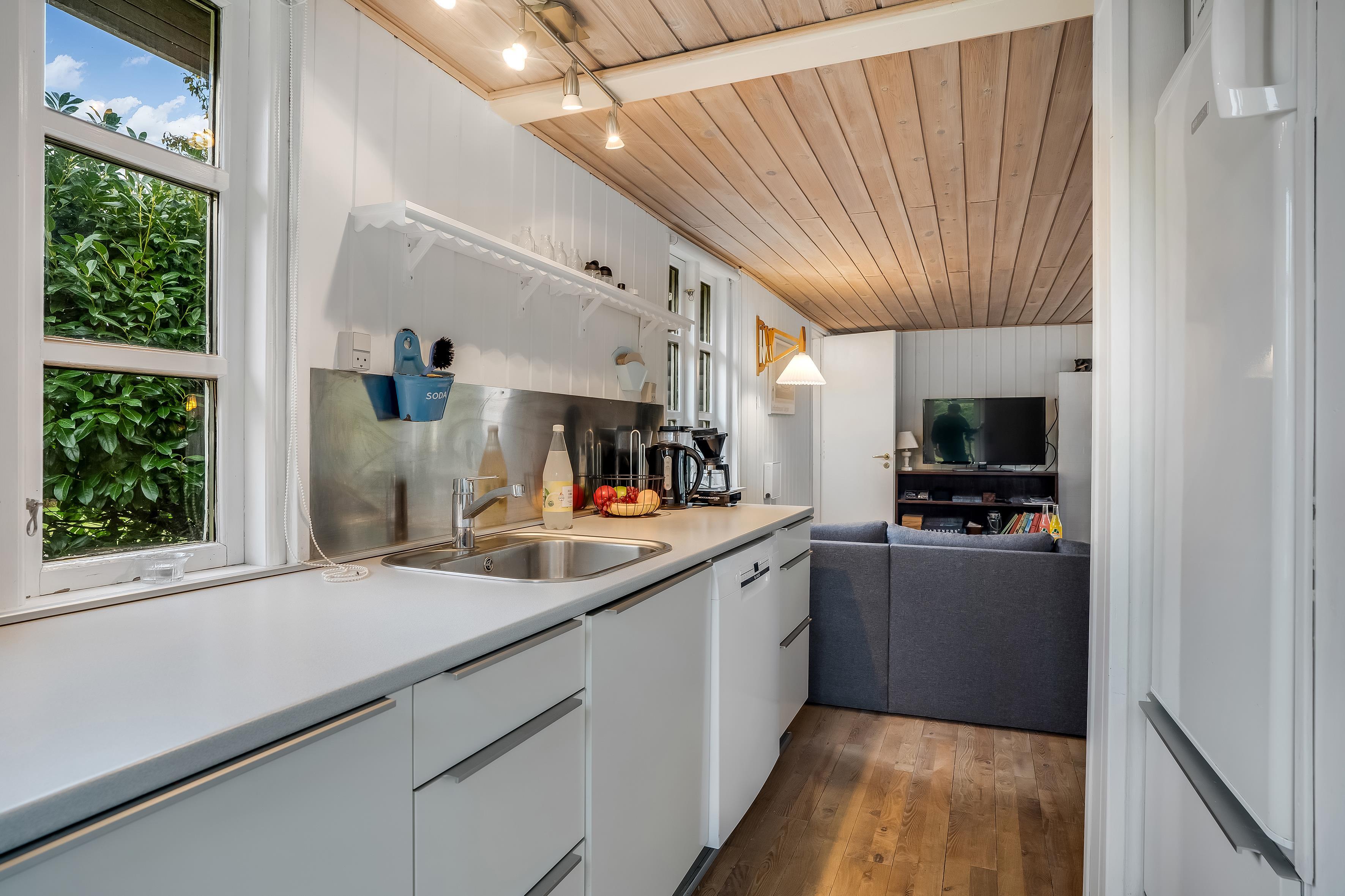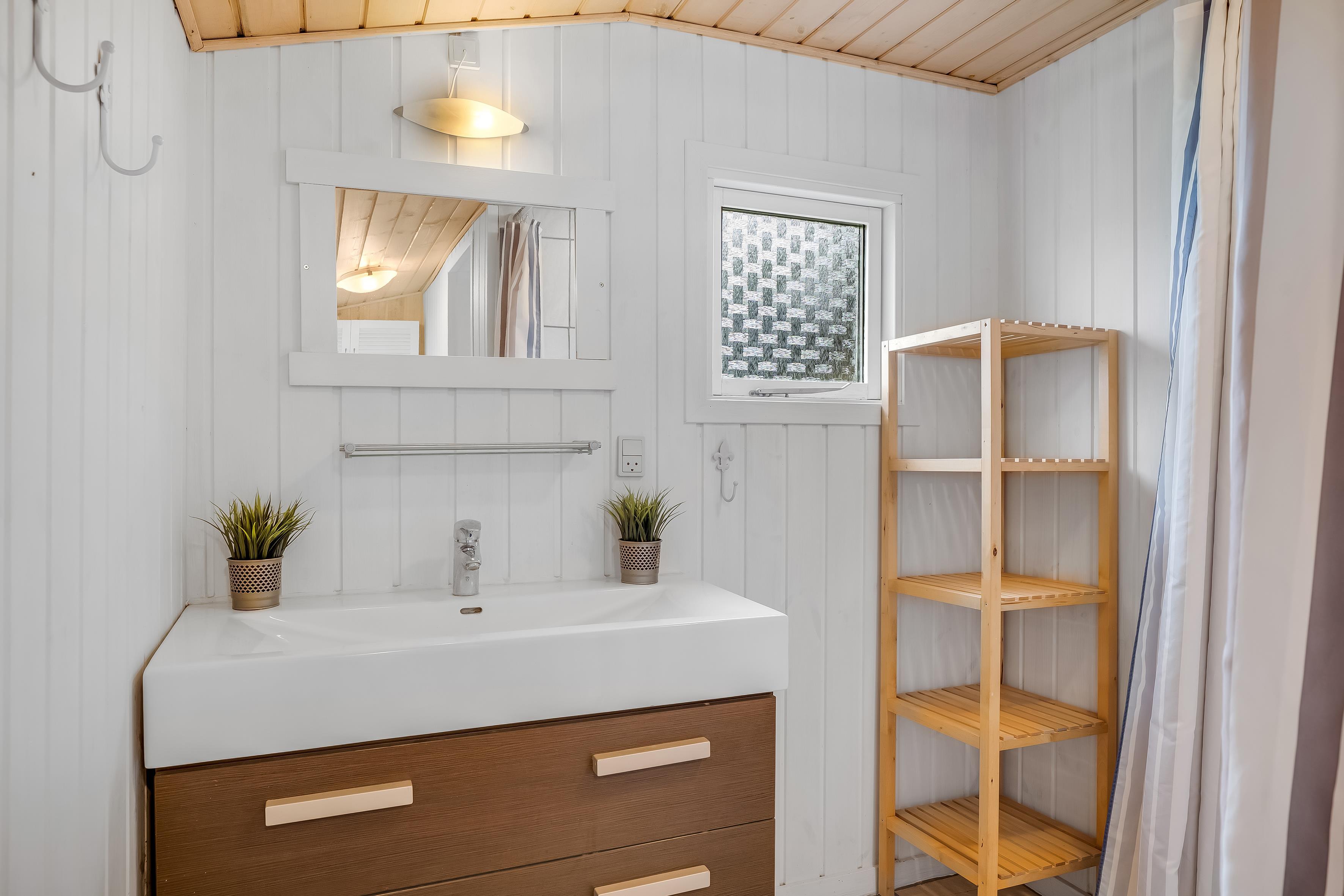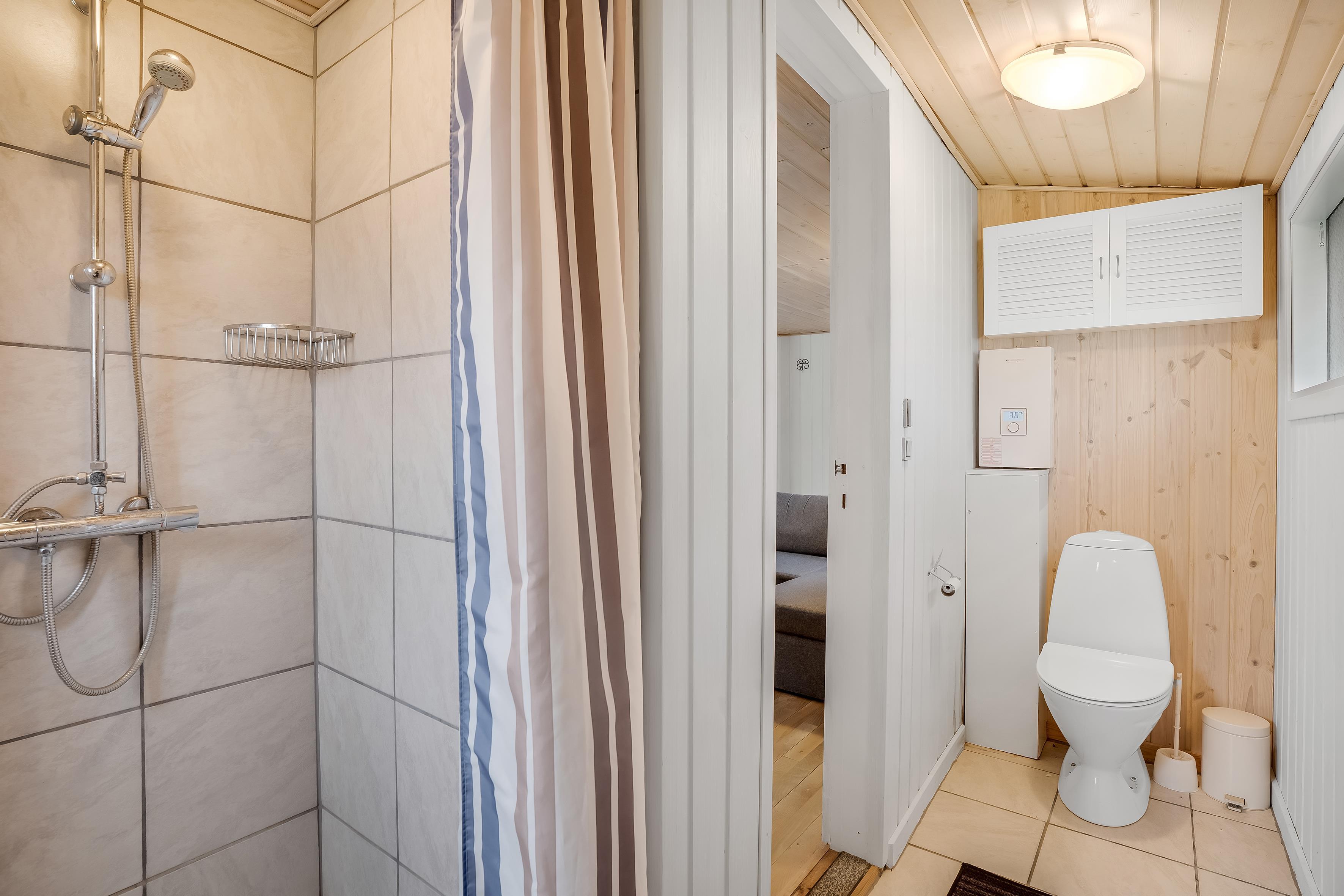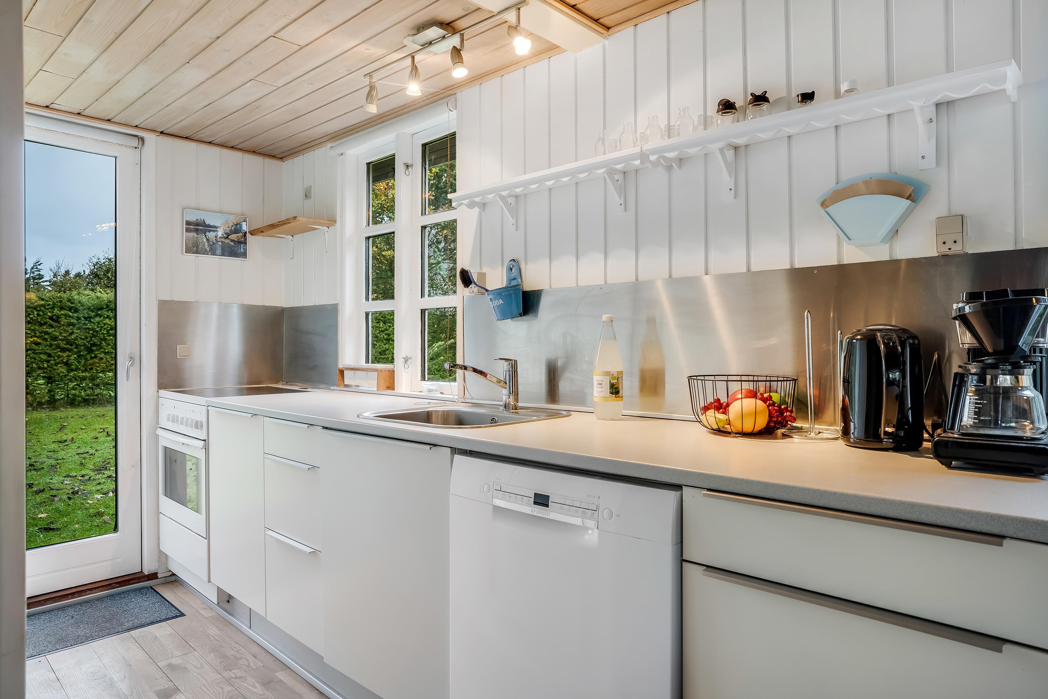 Badeværelset er udstyret med moderne faciliteter, herunder en bruser, et toilet og gulvvarme, hvilket sikrer en behagelig oplevelse året rundt. Huset har også en praktisk opvaskemaskine, der gør rengøringen efter måltiderne til en leg. Køkkenet er veludstyret med en keramisk komfur, ovn, køleskab, fryser (15 liter), mikrobølgeovn og en kaffemaskine, så du kan forberede lækre måltider og nyde din morgenkaffe i ro og mag.
