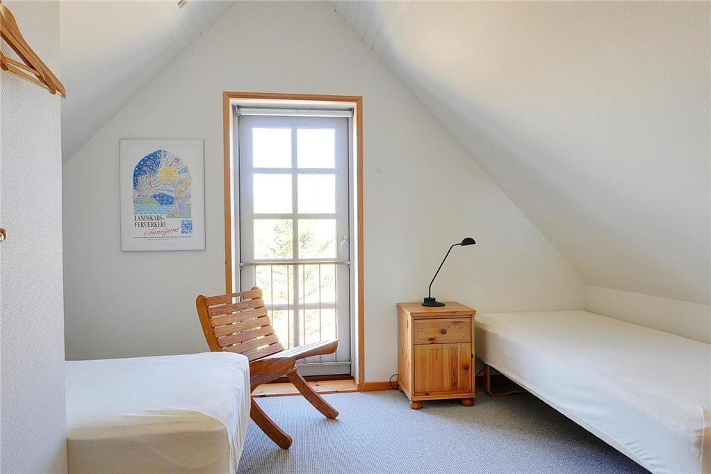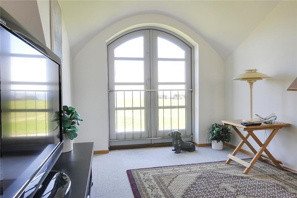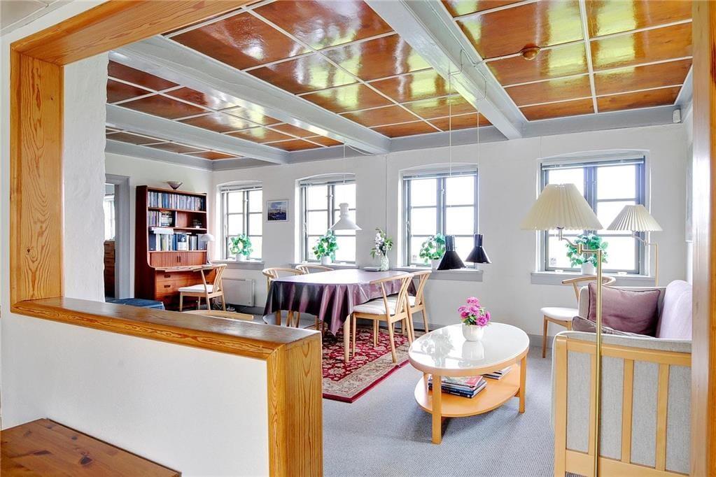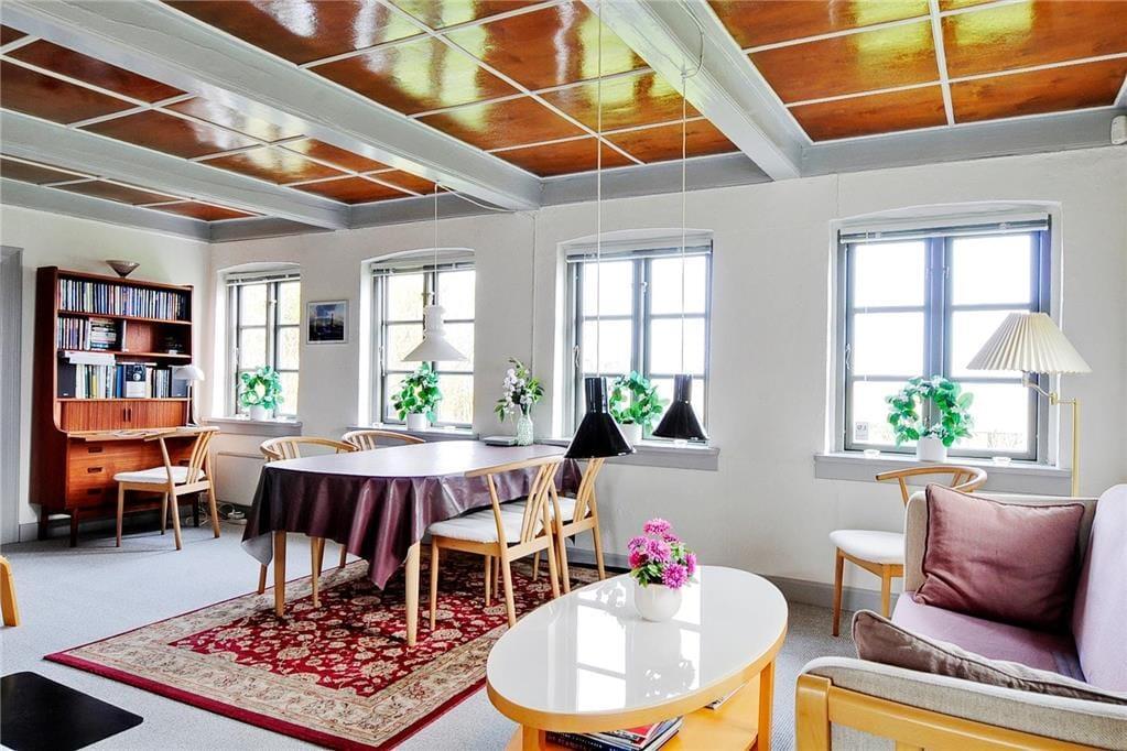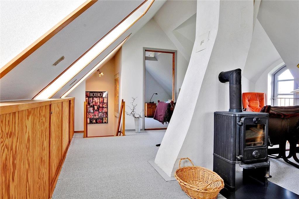 Dejlig lys stue med kvist, skråvægge, synlige loftsbjælker, brændeovn og med en storslået udsigt over Østersøen.