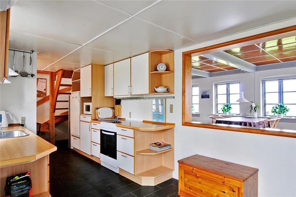 Køkken med gulvvarme, spiseplads og udgang til terrassen. Køleskab, komfur med keramisk plade og bageovn, fryser, emhætte, mikroovn, opvaskemaskine og vaskemaskine, tørretumbler. Trappe til 1. sal