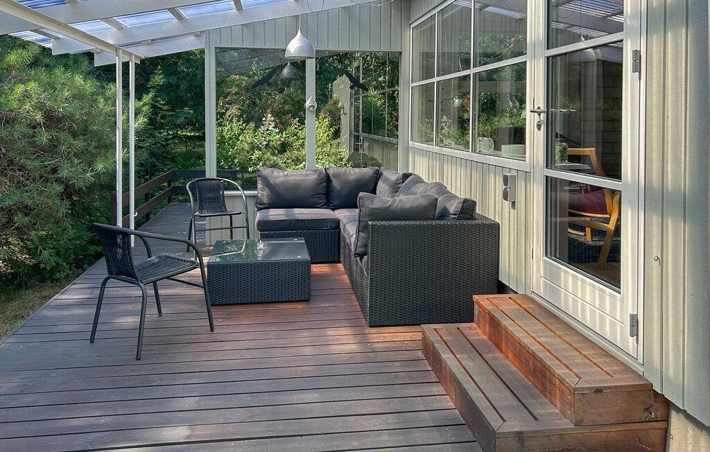 Til huset hører en ugenert, solrig og delvist overdækket træterrasse med havemøbler og en terrassevarmer, så I kan sidde længe ude om aftenen uden at fryse. I har også en grill til rådighed, så I kan tilberede lækre feriemåltider. Husets have med et lille vandhul tilbyder god plads til leg, og børnene vil elske gyngerne og den lille sandkasse. Der er yderligere en delvist overdækket terrasse med havemøbler samt en solbænk på en af husets sider, så her er det altid muligt at finde et dejligt sted at sidde og slappe af udenfor. Den lukkede gård sikrer, at smøbørn bliver ved huset. Cykler forefindes.