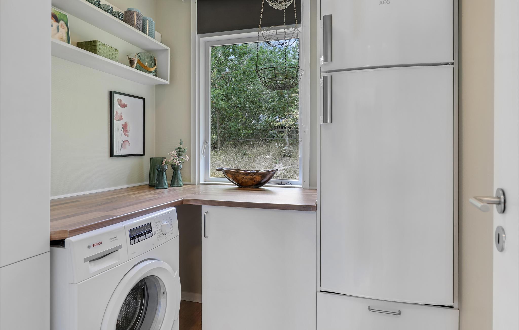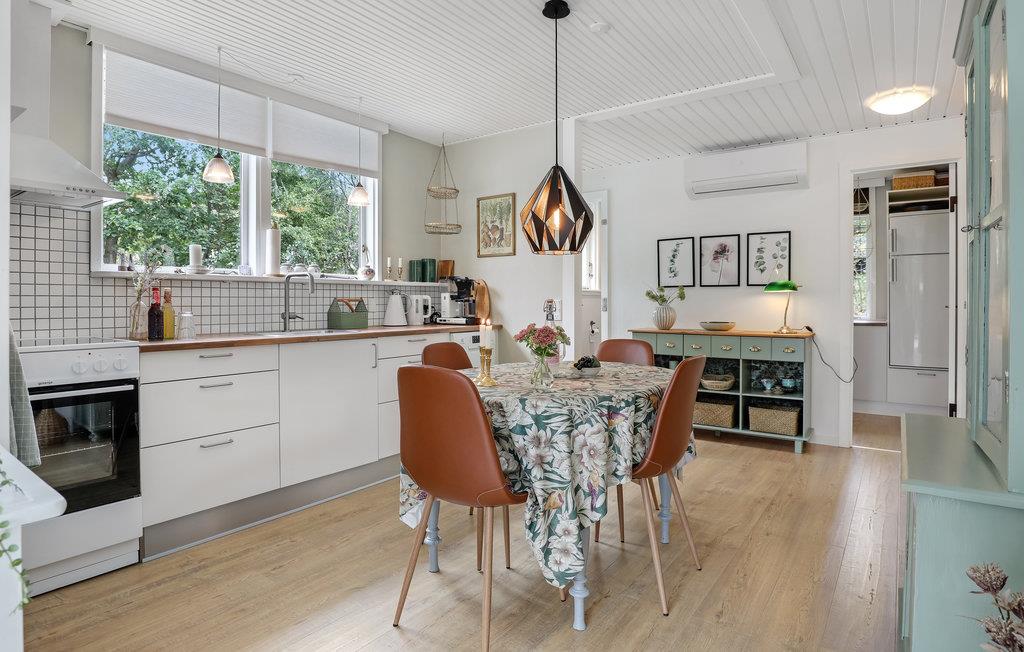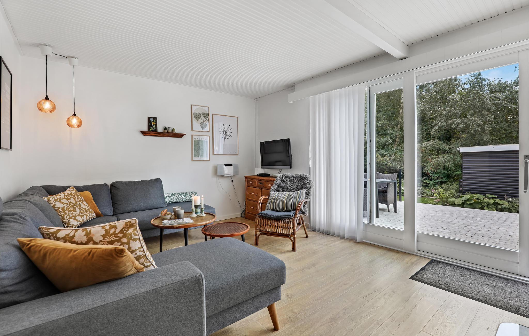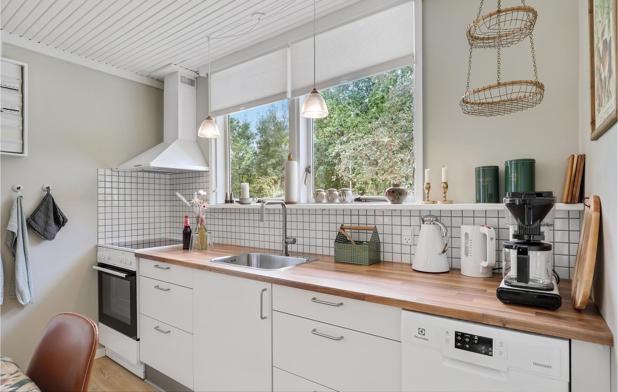 Sommerhusets hjerte er den attraktivt indrettede opholdsstue, hvor I kan se film i komfortable møbler, høre radio eller musik og nyde varmen og den hyggelige atmosfære fra brændeovnen i køligere sæsoner. I den veludstyrede køkkenafdeling med spiseplads kan I nemt tilberede dejlige feriemåltider og samtidigt samtale med dem, der slapper af i stuen.
