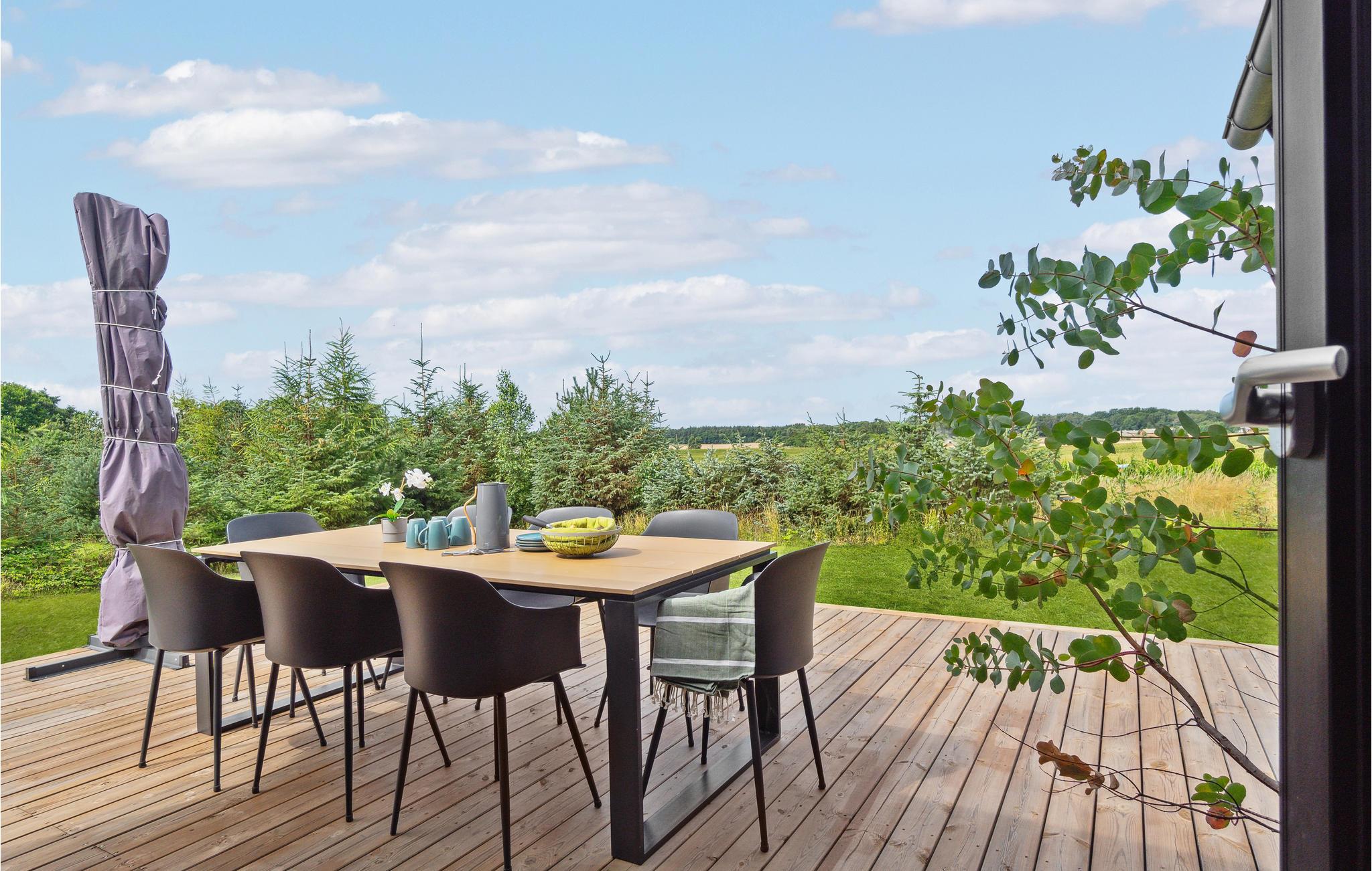 I kommer helt sikkert til at tilbringe en betydelig del af jeres ferie på den store, delvist overdækkede og solrige træterrasse med mange komfortable havemøbler og en grill til hyggelige grillaftener. Til huset hører også en udebruser, som er perfekt til afkøling på varme sommerdage og til at skylle sandet af sig efter en strandtur.