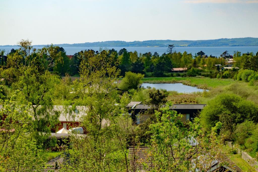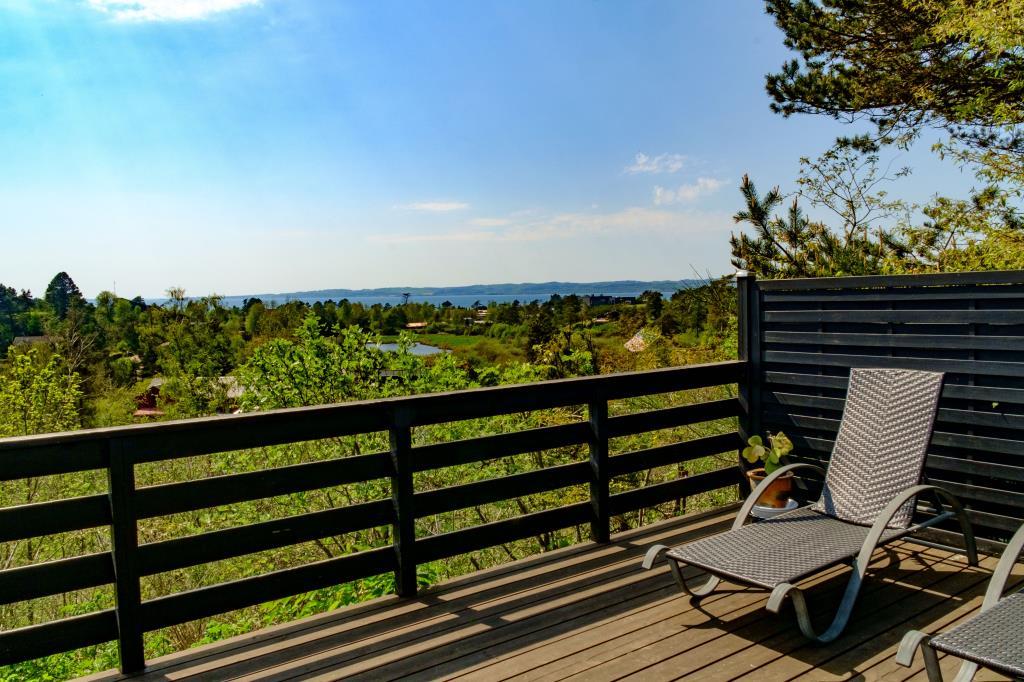Nyrenoveret sommerhus med panoramaudsigt over Ebeltoft Vig og Mols Bjerge, tæt på strand og by.