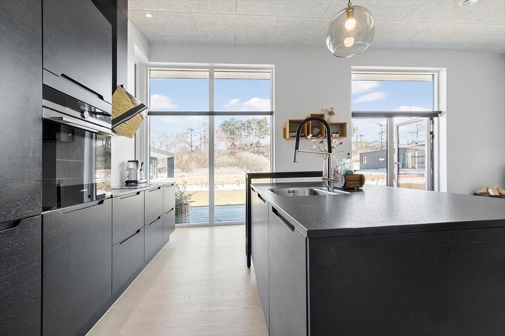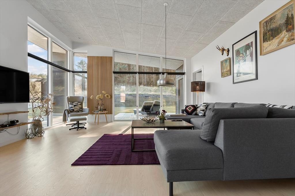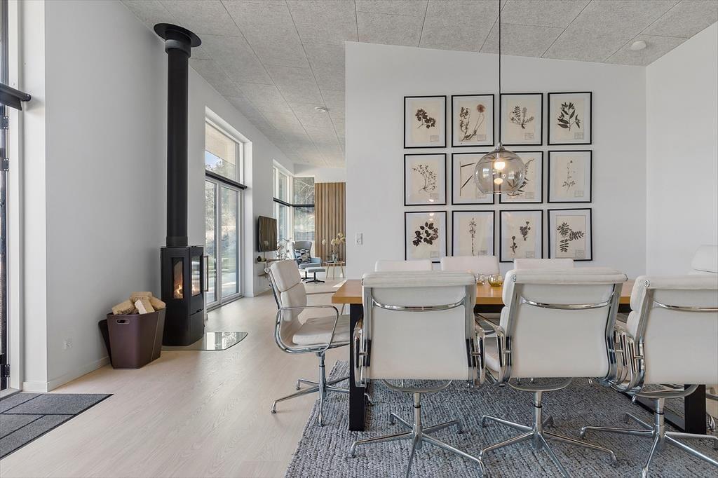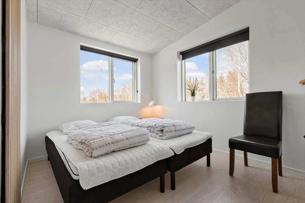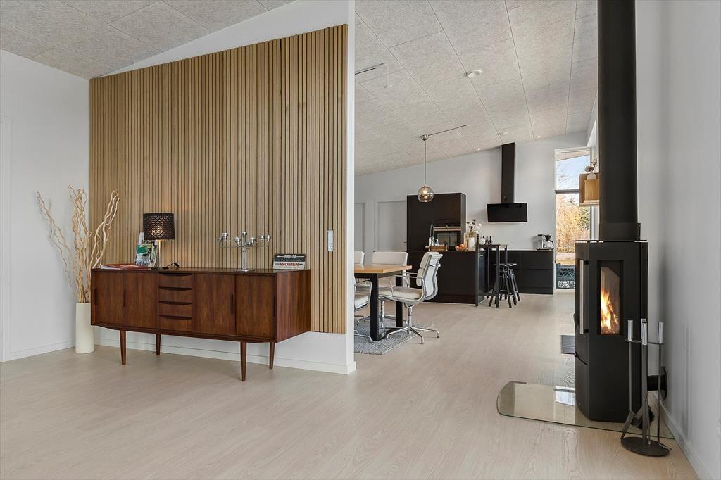 Velkommen til Bækholmen 5 C— et lyst og nyopført feriehus, som rummer plads til 8 personer og evt. jeres firbenede ven . Huset byder på en lys og indbydende stue med komfortable møbler og brændeovn, hvor I kan samles omkring god snak, spil eller en hyggelig film‑aften. Fra stuen har du direkte adgang til overdækket terrasse — perfekt til morgenkaffen eller aftensmaden på grillen. Køkkenet er moderne og veludstyret med bl.a. indbygget ovn, opvaskemaskine og alt du skal bruge for at lave dejlige måltider sammen. Fordelingen over fire soveværelser gør det let at skabe rum både for par, venner og børn, og med to badeværelser — hvor det ene har spa‑bad og sauna — bliver hygge og afslapning sat i højsædet. For de mindste gæster er både høj stol og barneseng klar.