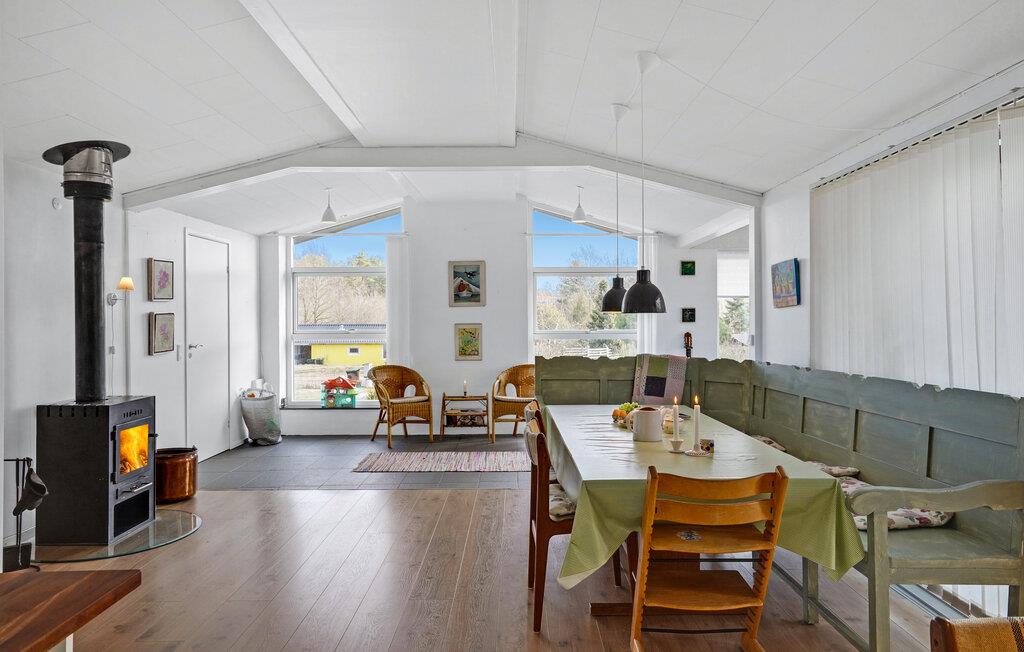 Fredeligt feriehus med store vinduer, der får rummet til at lyse op og en hyggelig indretning. Perfekt til en ferie ved havet.