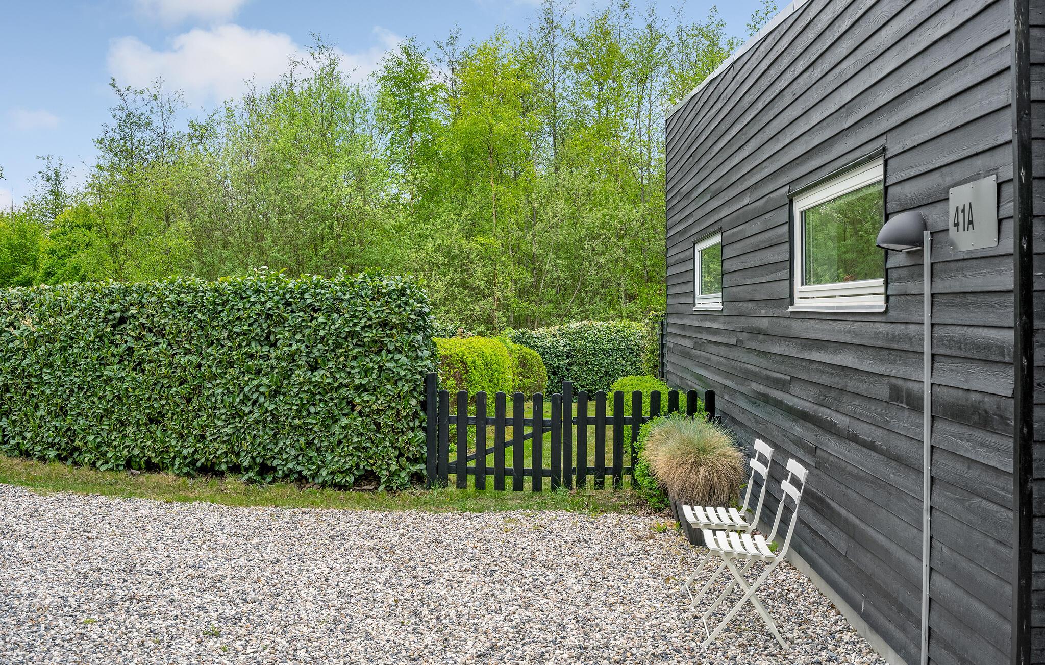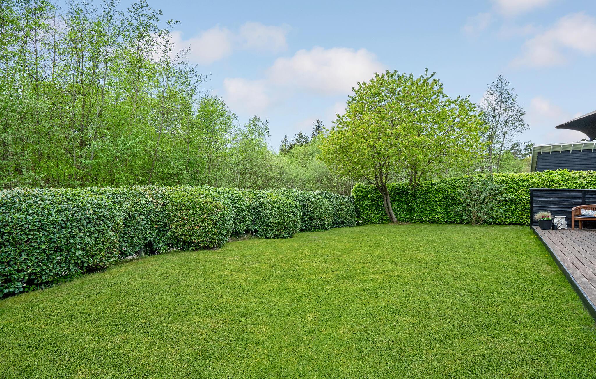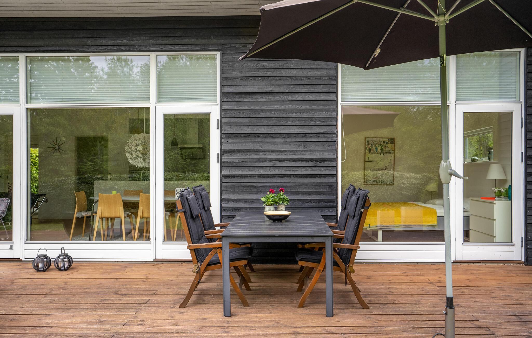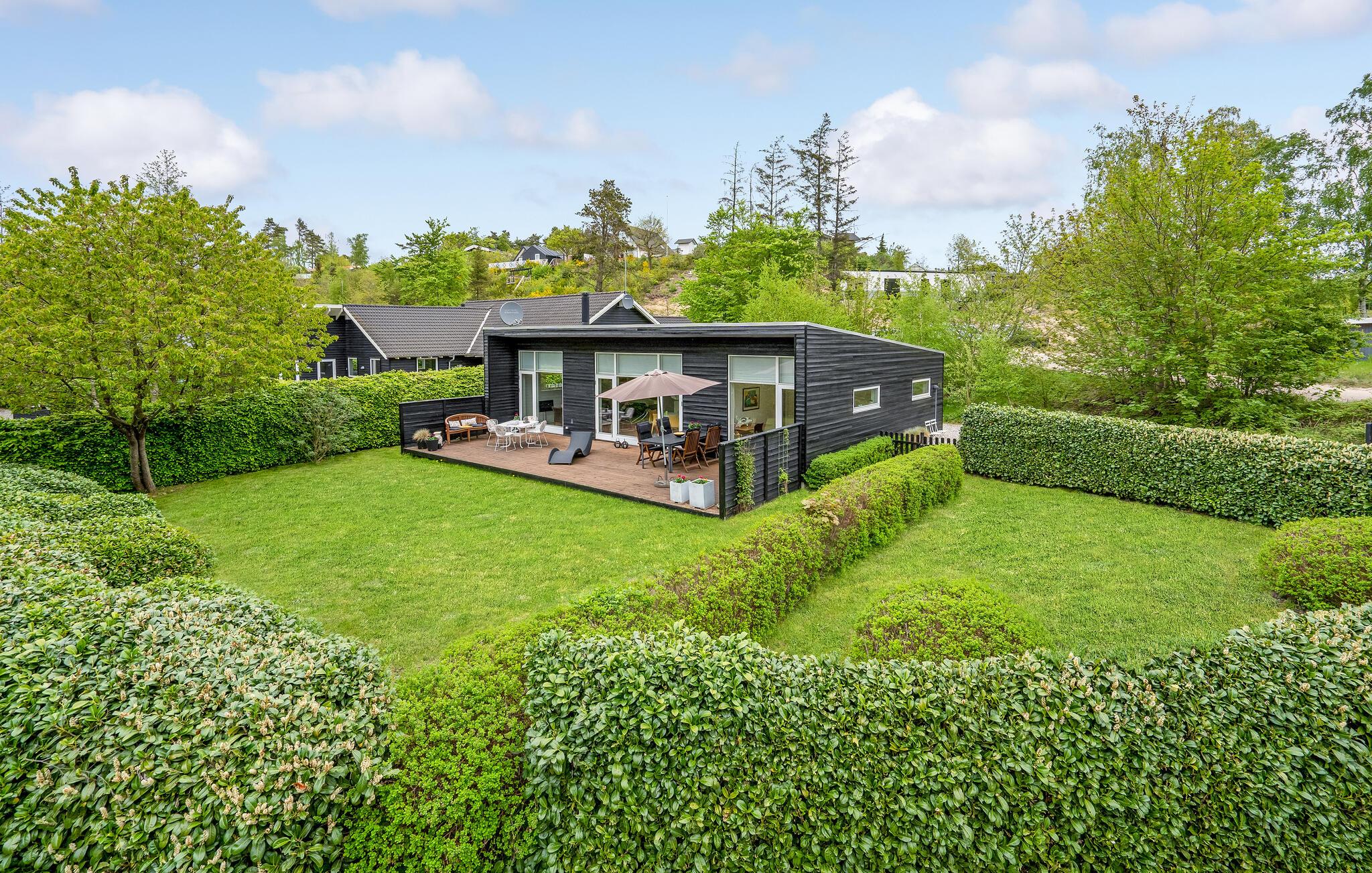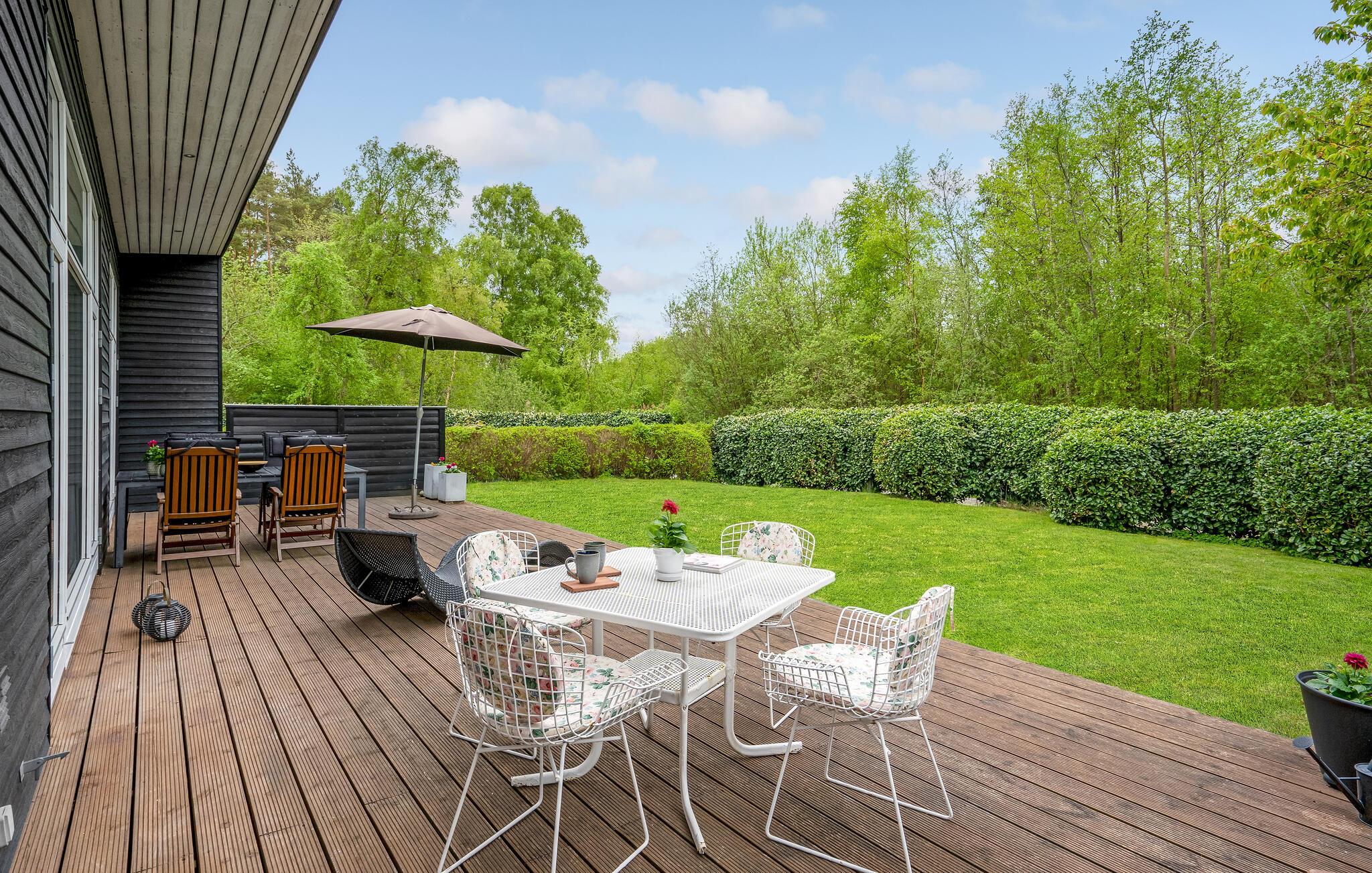 Hyggeligt feriehus i roligt område nær Vibæk Strand i Ebeltoft med spabad, stor terrasse og smuk have.