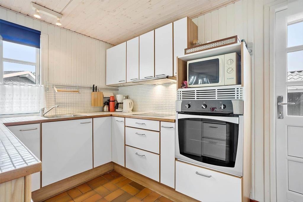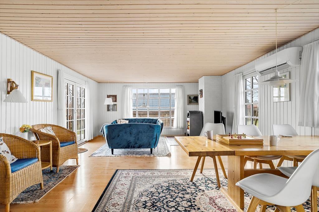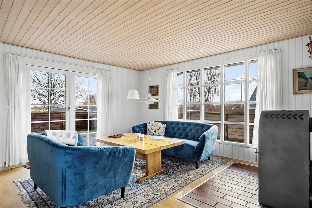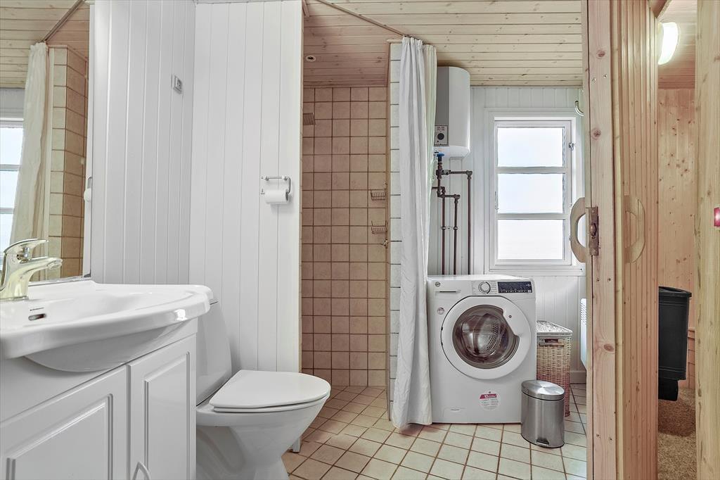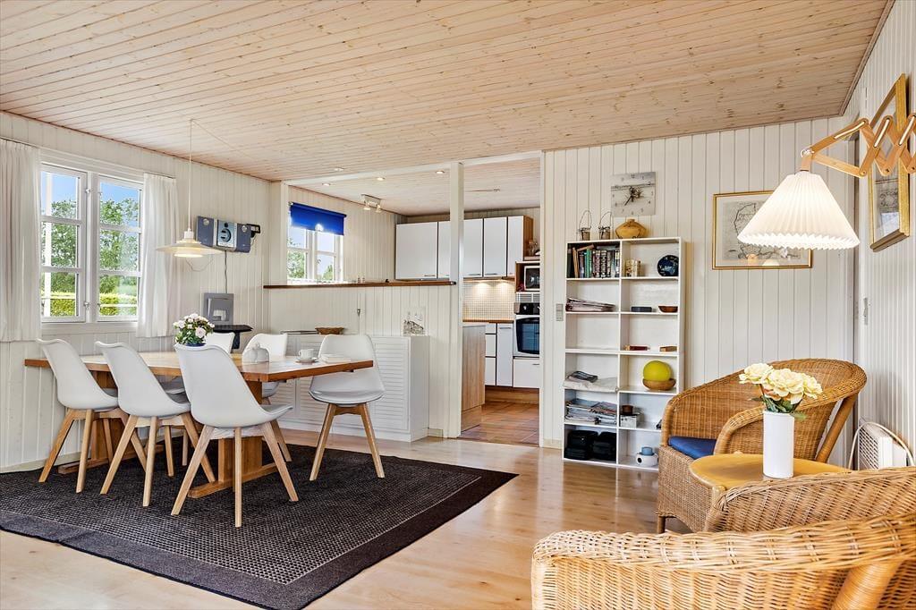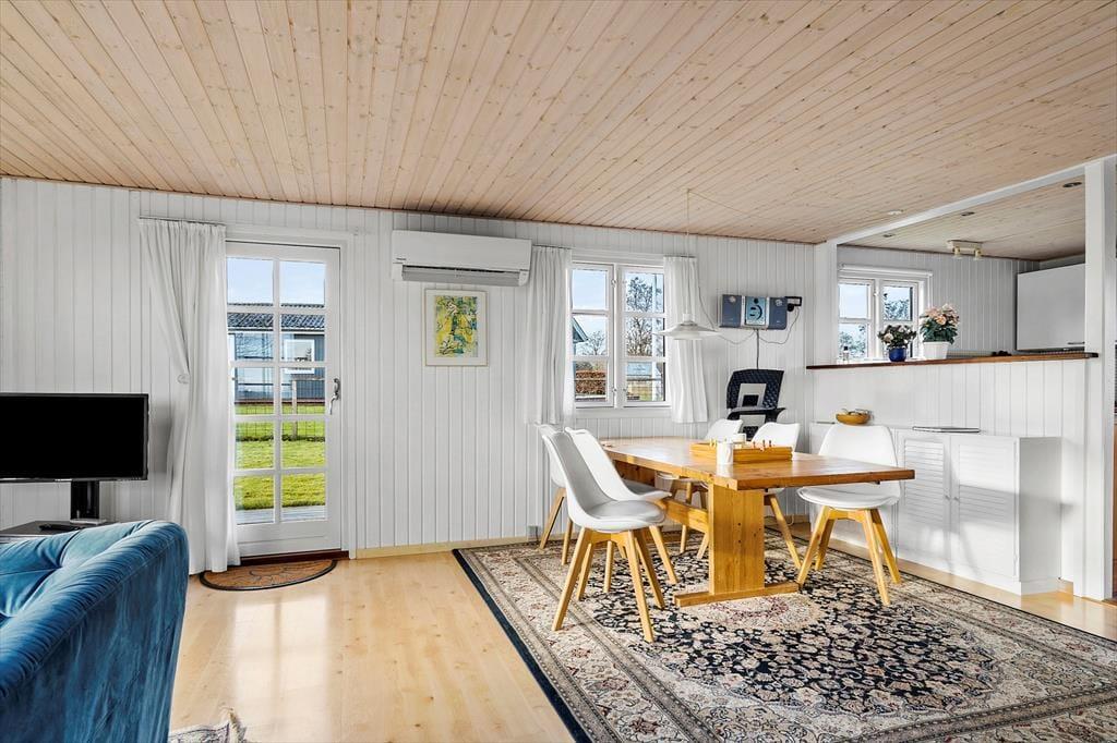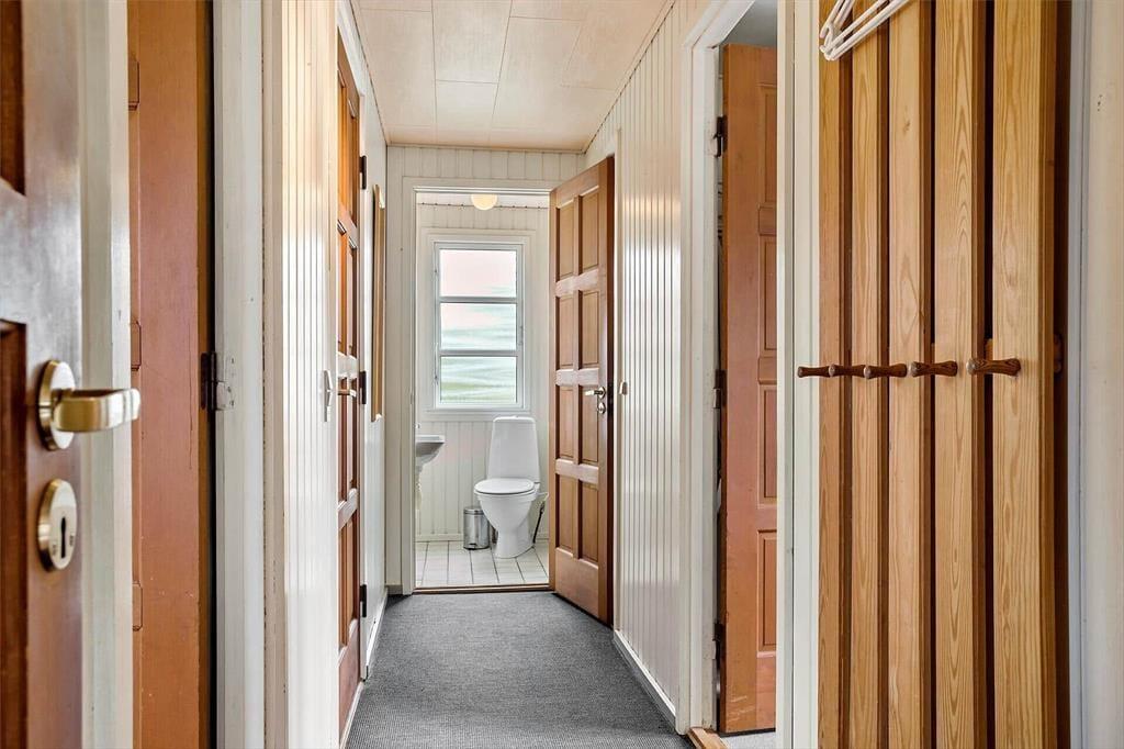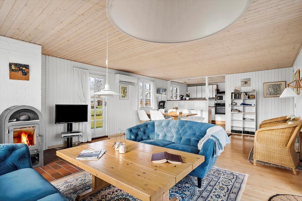Indenfor byder sommerhuset på en lys og indbydende atmosfære, hvor indretningen emmer af hygge og feriestemning. De lyse nuancer og det naturlige lys, der strømmer ind gennem vinduerne, skaber en behagelig ro, som gør det nemt at koble af fra hverdagens travlhed. Her er der plads til samvær og nærvær – hvad enten dagen starter stille med morgenkaffe og fuglesang udenfor eller slutter med hyggelige stunder i sofaen efter en dag fyldt med oplevelser. Sommerhuset er indrettet med fokus på komfort, så du hurtigt føler dig hjemme. Badeværelset indbyder til ekstra forkælelse med adgang til sauna, hvor du kan blive varmet godt igennem efter en frisk tur langs stranden eller bare nyde roen og varmen i fred og mag.