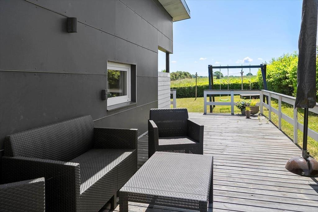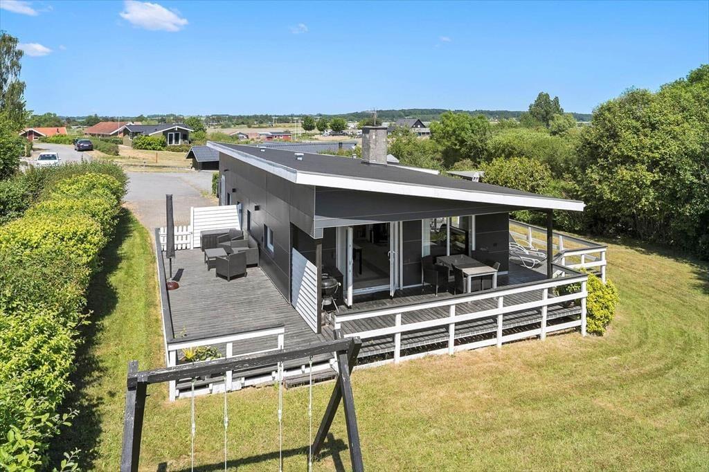 Udendørslivet er i centrum ved dette sommerhus. Den store terrasse indbyder til lange sommeraftener med grill og hygge under den overdækkede del, mens du i dagtimerne kan nyde solen på den åbne terrasse. Haven er et sandt paradis for børn med en gynge og sandkasse, hvor der er plads til leg og sjov. Her kan de små eventyrere bygge sandslotte eller gynge højt mod himlen, mens de voksne slapper af med en bog eller en kop kaffe. De naturskønne omgivelser giver desuden mulighed for hyggelige stunder med fuglekvidder og afslapning i den friske luft.