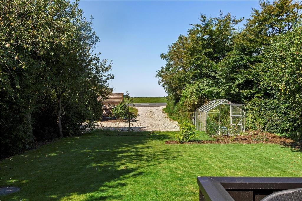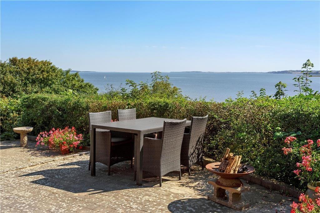 De skønne terrasser er uden tvivl en af de helt store kvaliteter ved dette hus. Foran huset er der en mindre vestvendt terrasse og mod syd et dejligt udendørs køkken. Mod vandsiden (sydøst) er der to store, solrige terrasser. Her kan I dase i liggestole og nyde den helt forrygende udsigt over Limfjorden mod øen Mors.