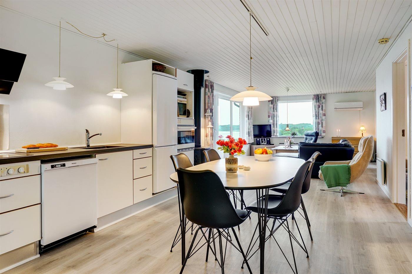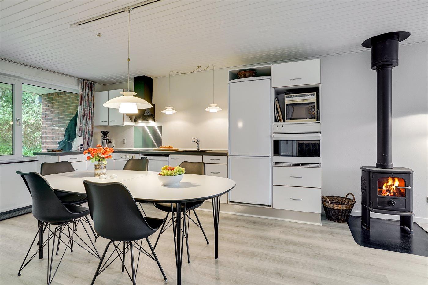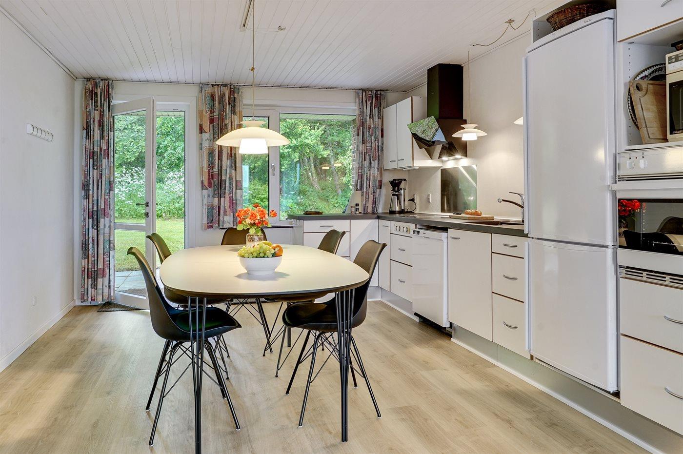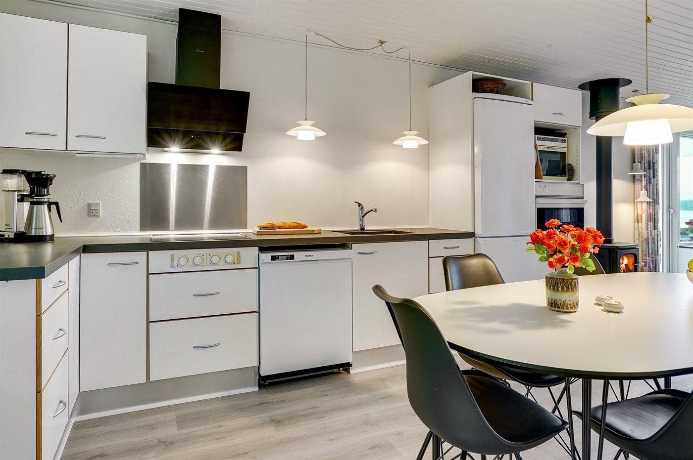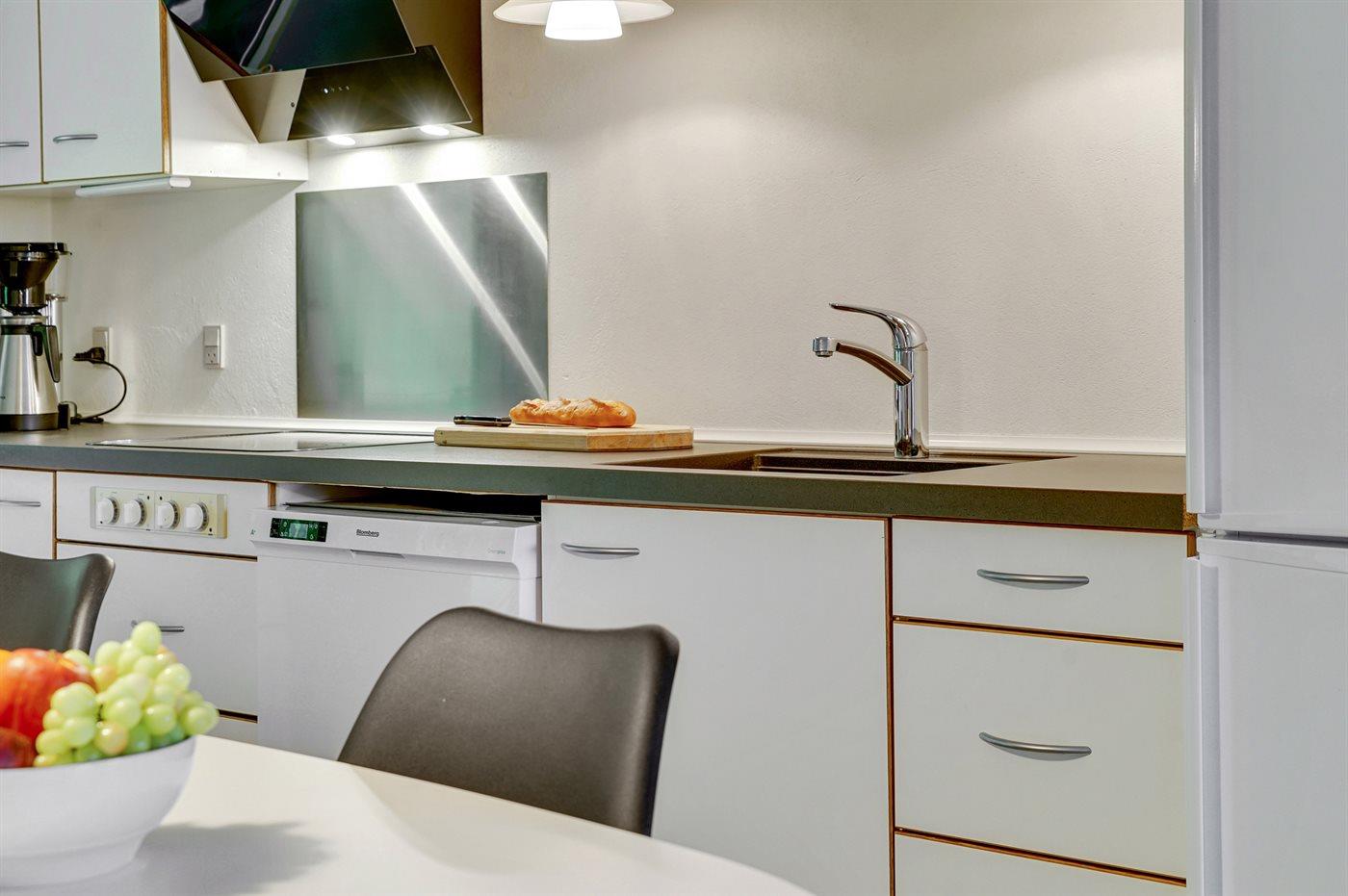 Køkkenet er udstyret med 1 køleskab. Der er 4 keramiske kogeplader, varmluftovn, mikrobølgeovn samt opvaskemaskine.