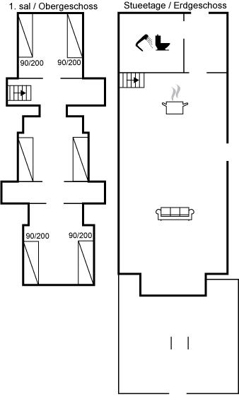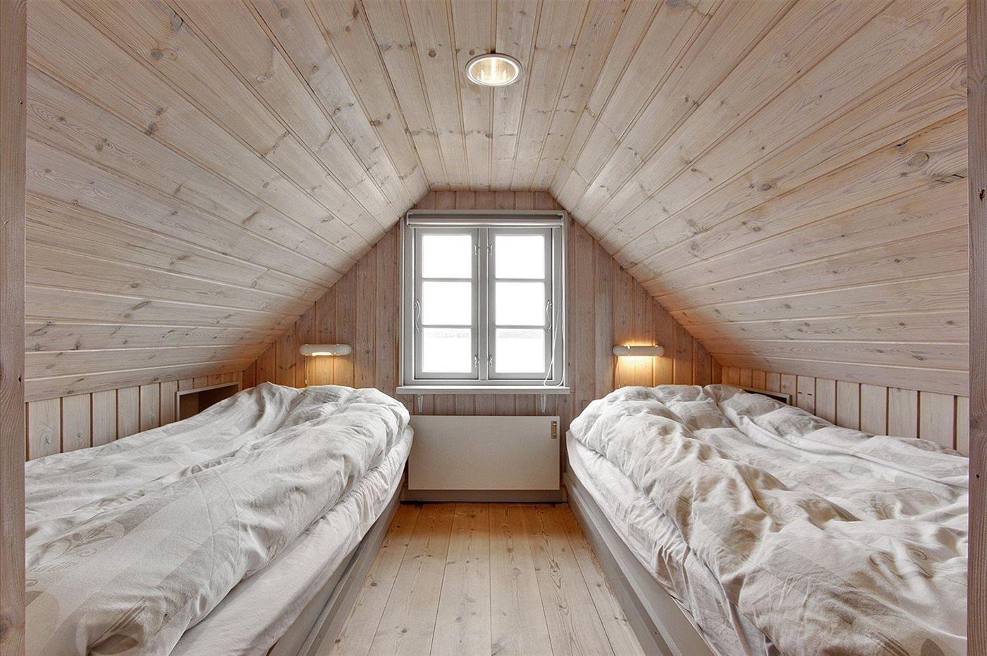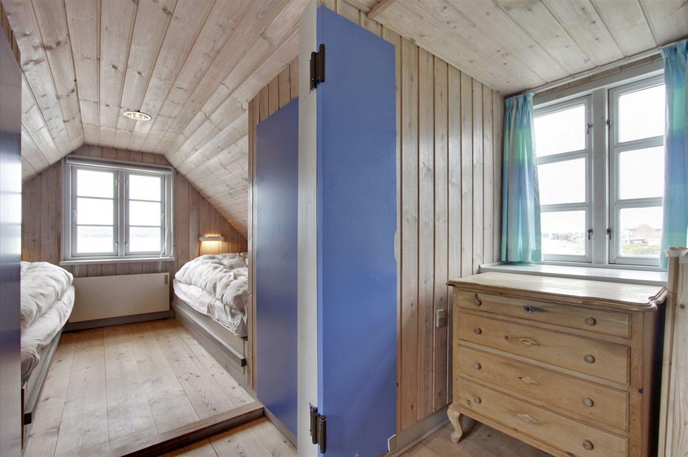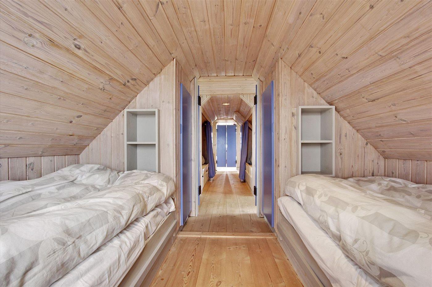 Der er i alt 2 soveværelser. Sovepladserne fordeler sig på: 6 sovepladser i enkeltsenge. 2 af disse sovepladser befinder sig på husets hems.