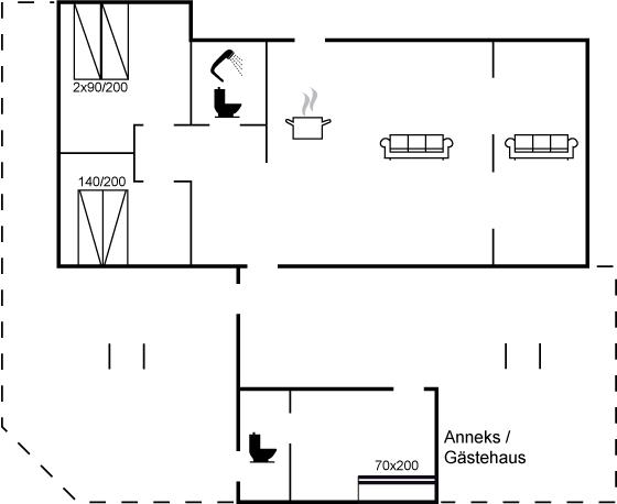 Der er i alt 3 soveværelser. Sovepladserne fordeler sig på: 4 sovepladser i dobbeltsenge. 2 sovepladser i køjeseng. 2 sovepladser på madrasser. 2 af disse sovepladser befinder sig på husets hems, og 2 befinder sig i anneks.