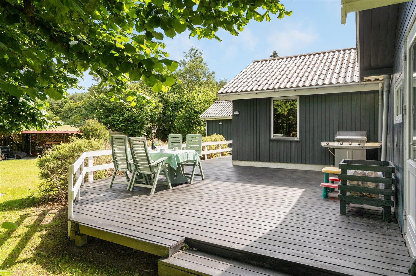 Ferieboligen er beliggende på en 1275 m² stor naturgrund. Der er 150 m til fjorden. Der er en badebro i nærheden. Nærmeste forretning er beliggende i en afstand af 6000 m. Der er en golfbane i en afstand af 5500 m. Til ferieboligen hører åbent terrasseareal. Desuden er der overdækket terrasse. Gynge. Grill til rådighed. Parkering ved ferieboligen.