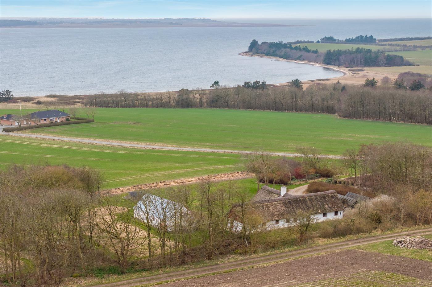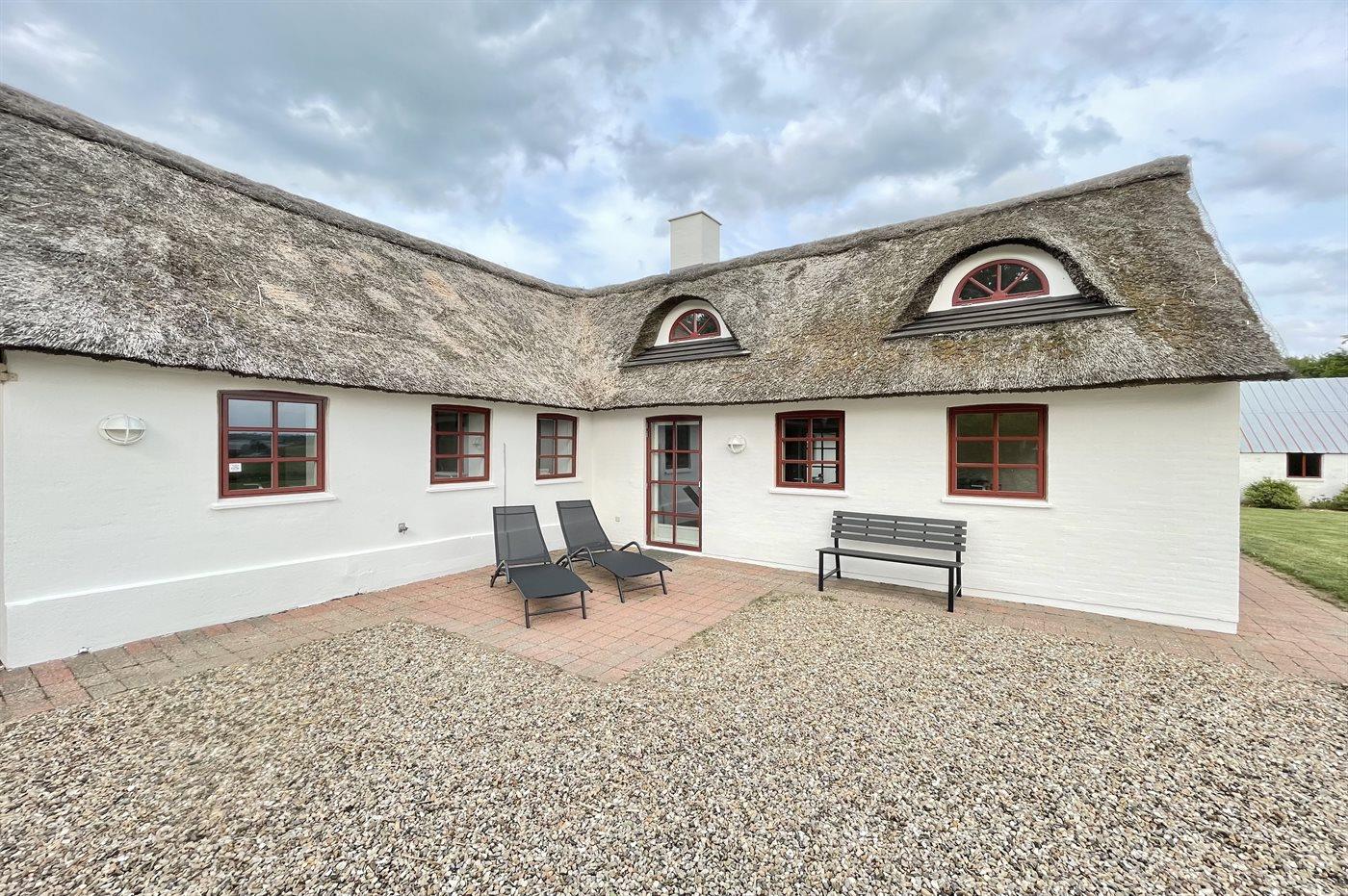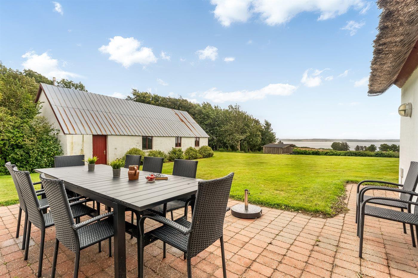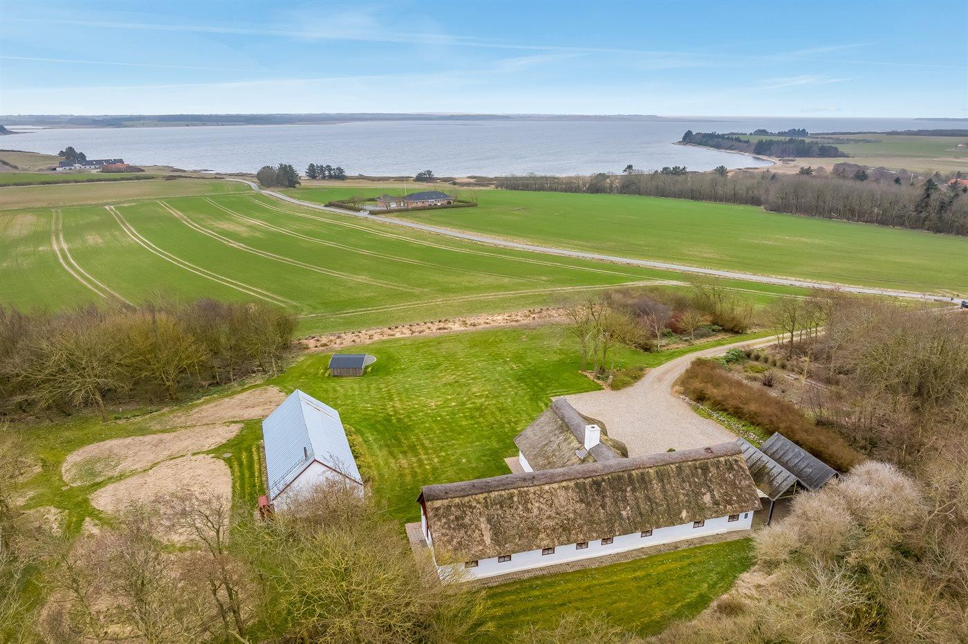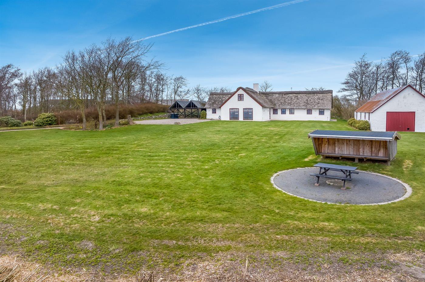 Stråtækt sommerhus i Vile med fjordudsigt, aktivitetsrum, shelter og bålplads i naturskønne omgivelser.