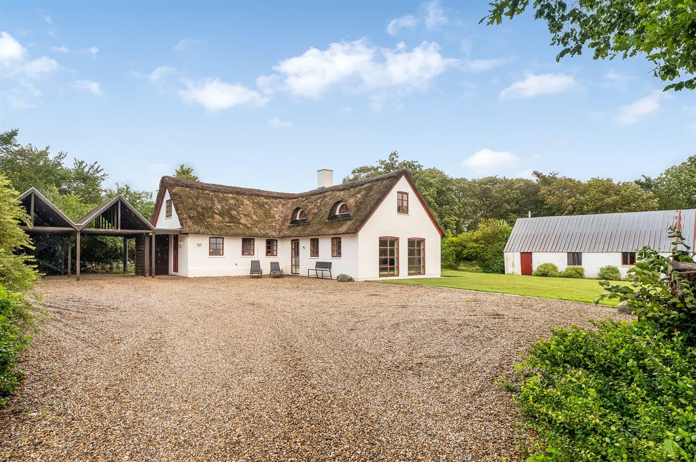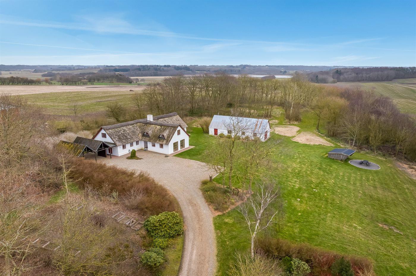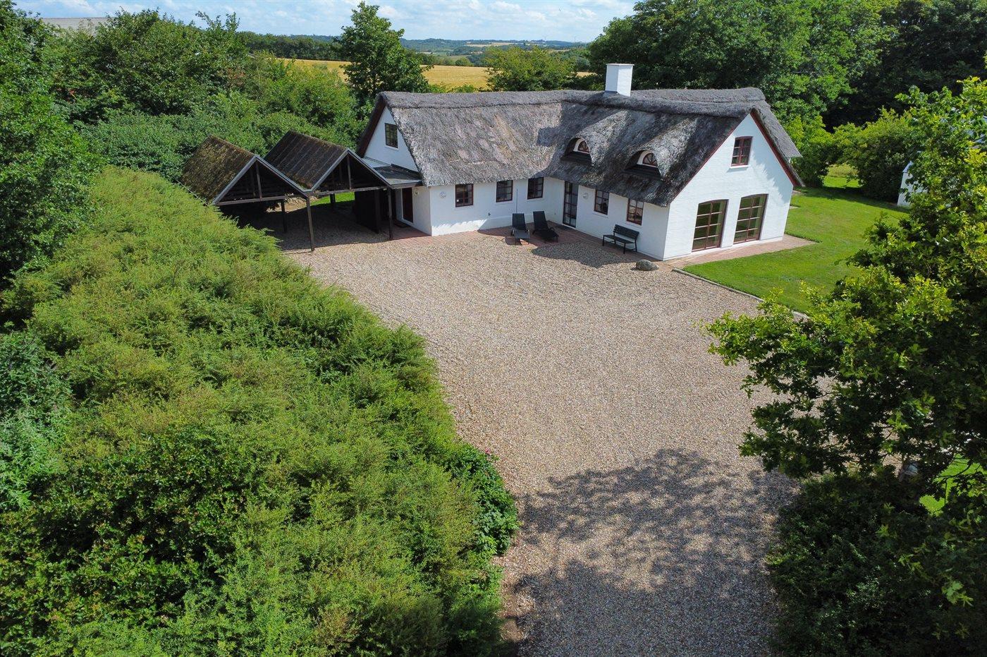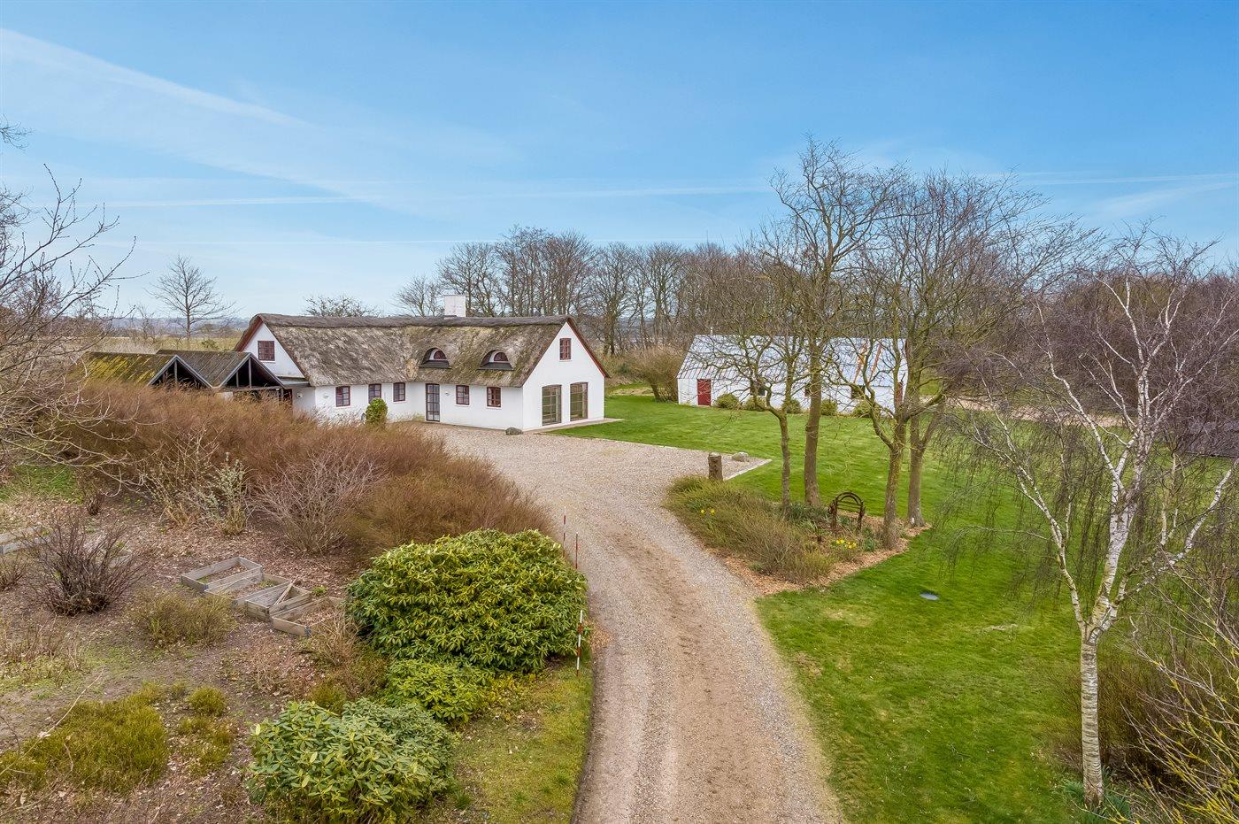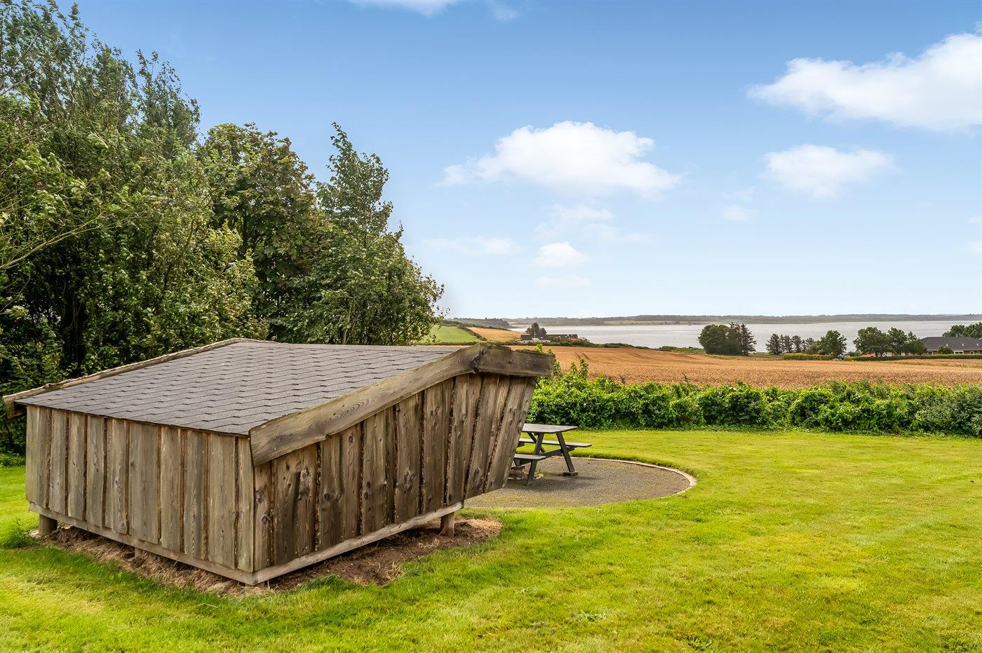 Stråtækt sommerhus i Vile med fjordudsigt, aktivitetsrum, shelter og bålplads i naturskønne omgivelser.