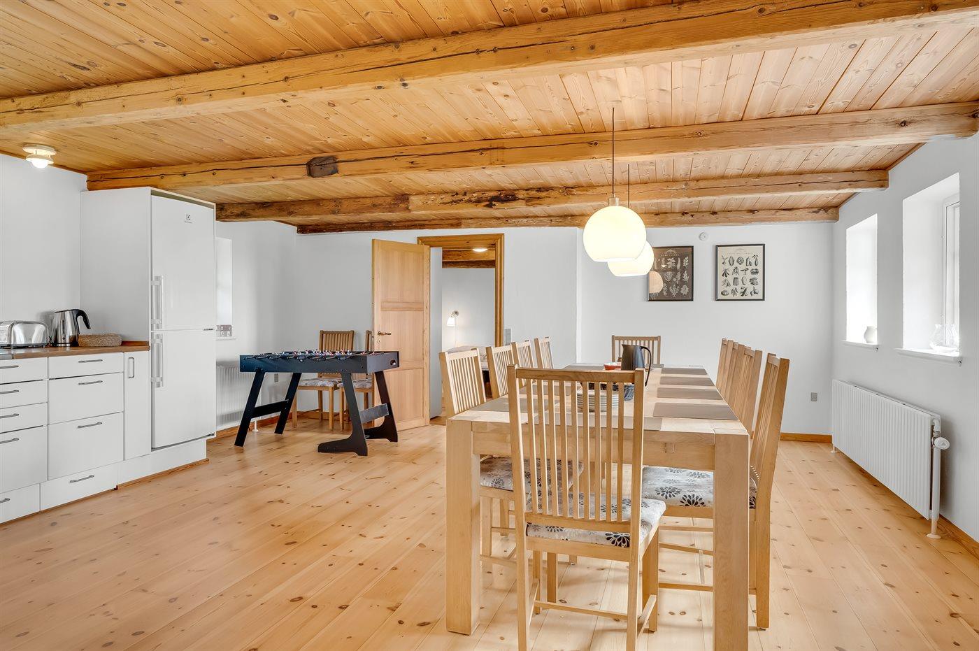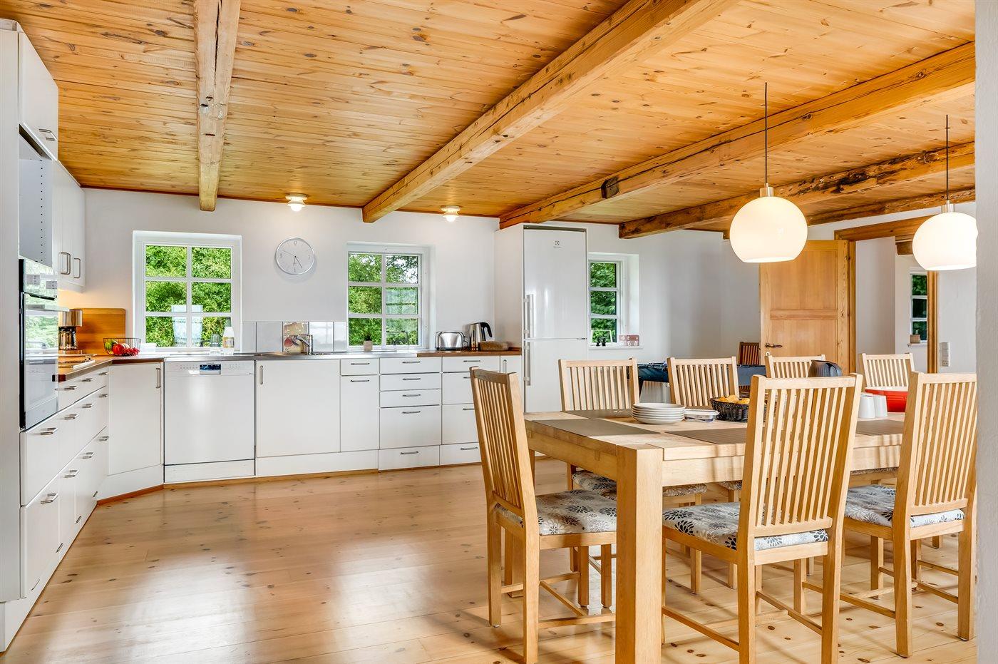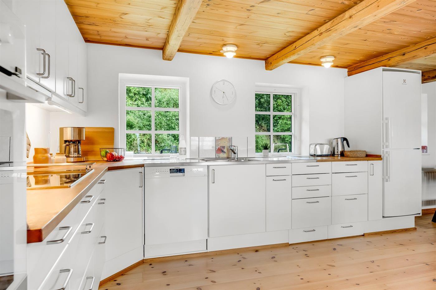 Køkkenet er udstyret med 1 køleskab. Der er 4 keramiske kogeplader, varmluftovn, mikrobølgeovn samt opvaskemaskine.