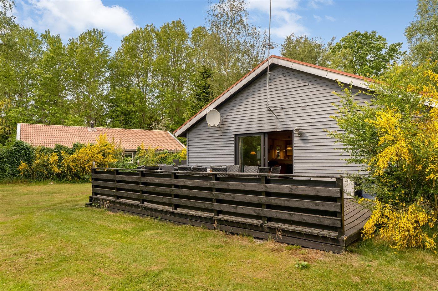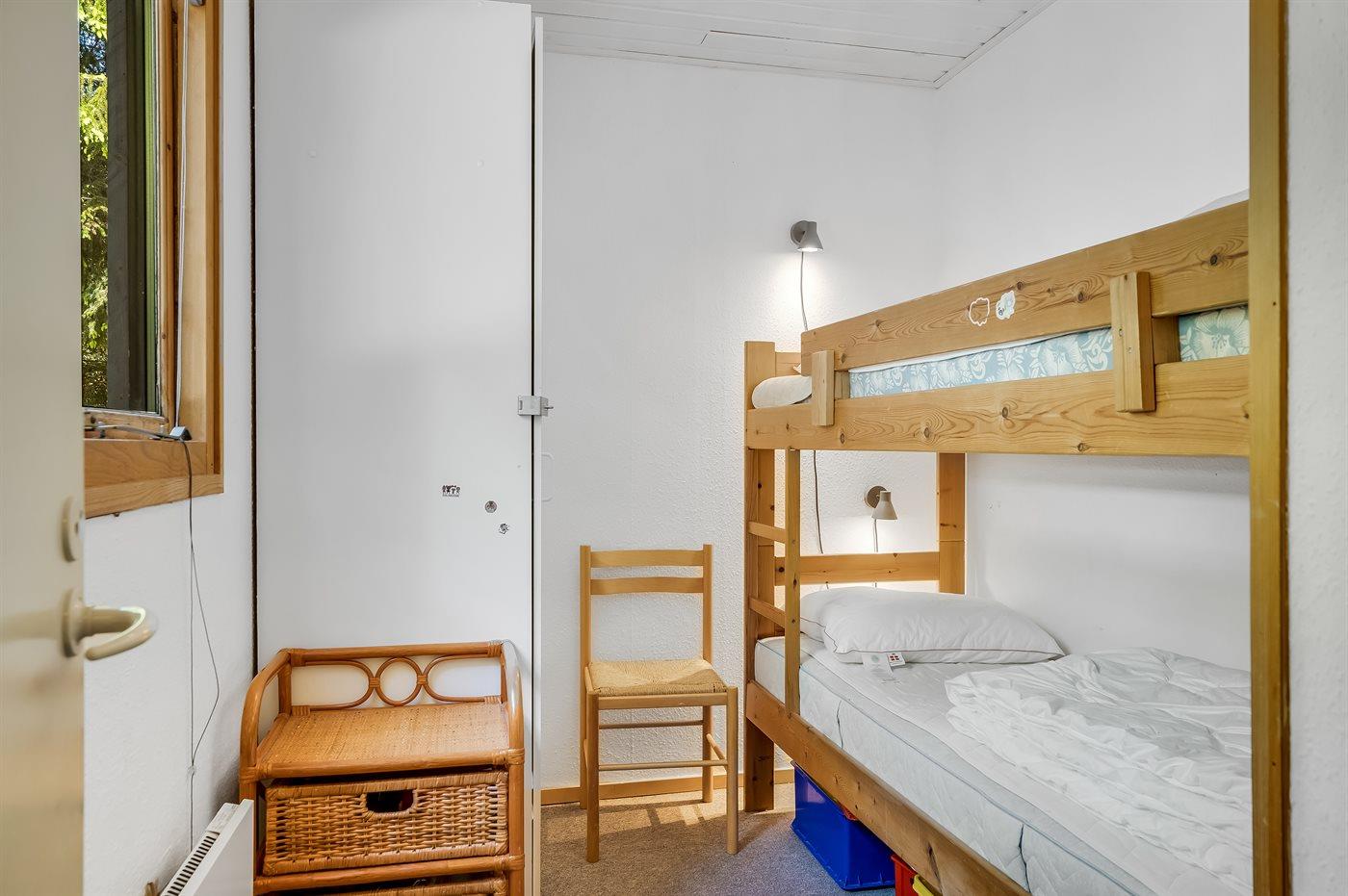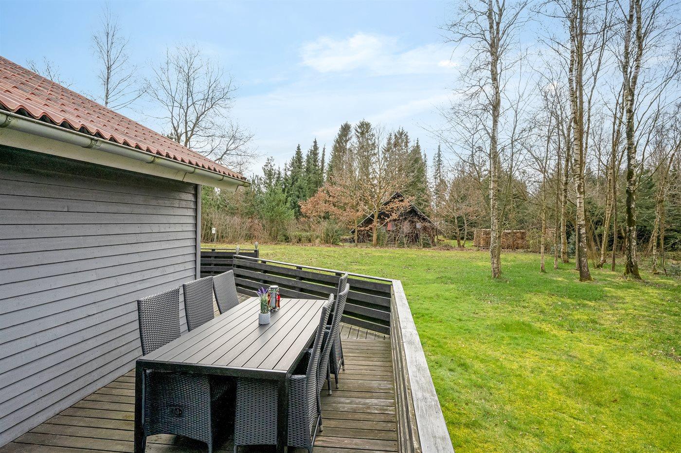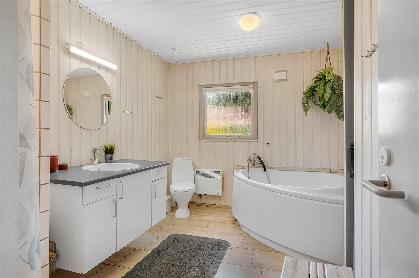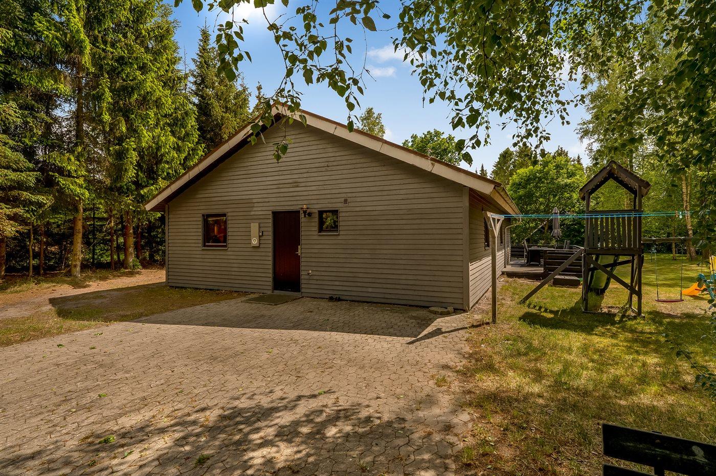 Kun 200 m fra vandet finder I dette hyggelige og børnevenlige sommerhus i træ med bl.a. spa og sauna, bygget i 1994 og moderniseret i 2010. Huset ligger på en skov-/plantagegrund med græs og høje træer samt sandkasse, gynger og legetårn med rutsjebane til børnene. Der findes en dejlig, afskærmet terrasse med havemøbler.