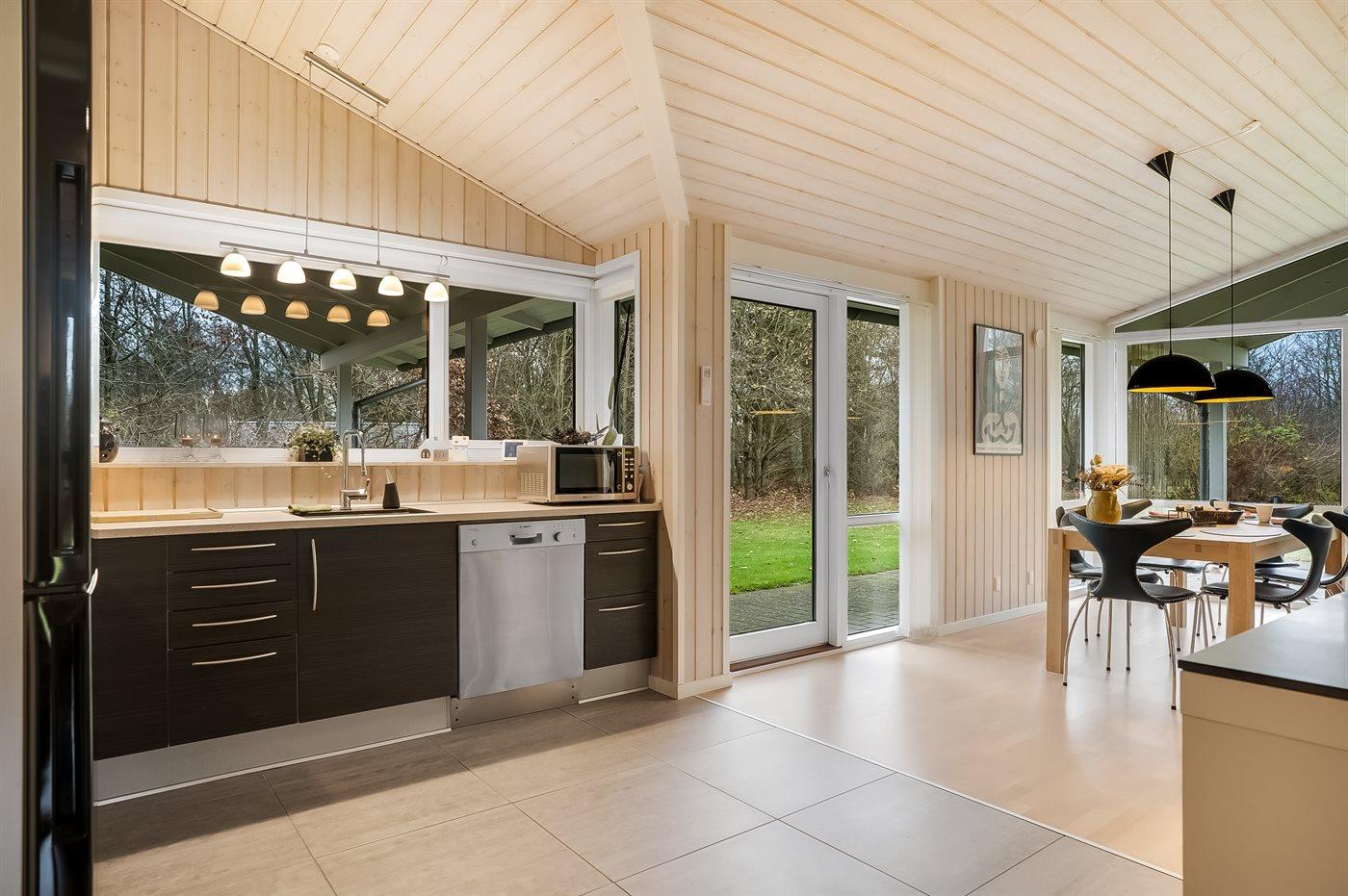 Køkkenet er udstyret med 1 køleskab. Der er 4 elkogeplader, varmluftovn, mikrobølgeovn samt opvaskemaskine Der er gulvvarme i køkkenet.