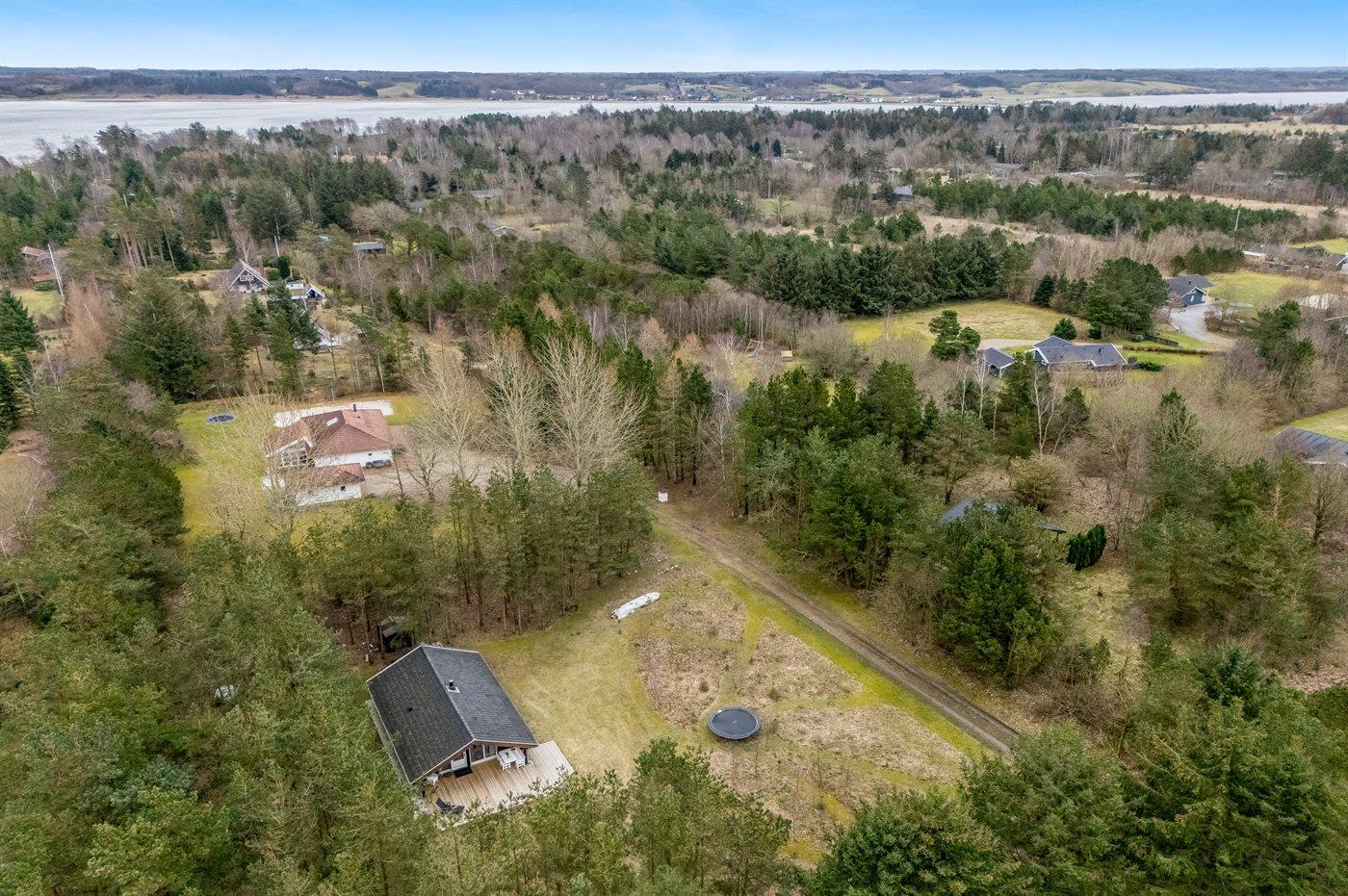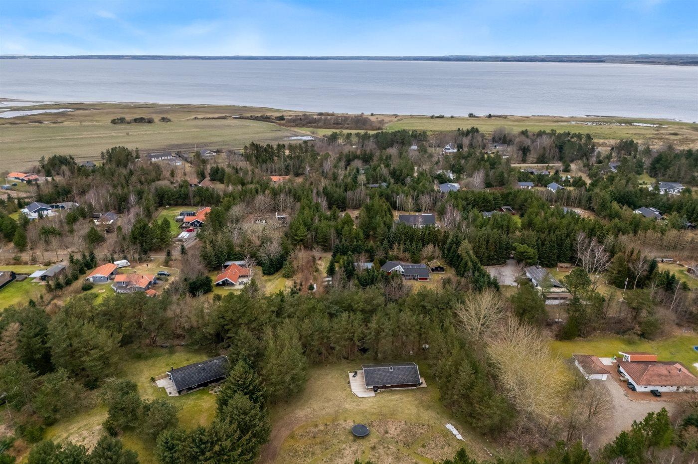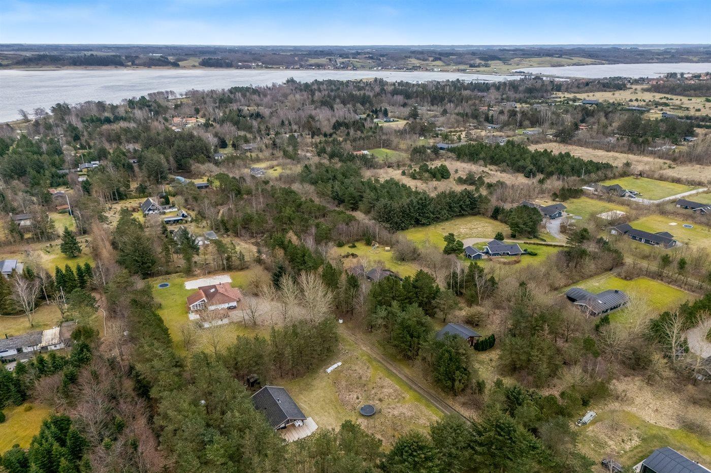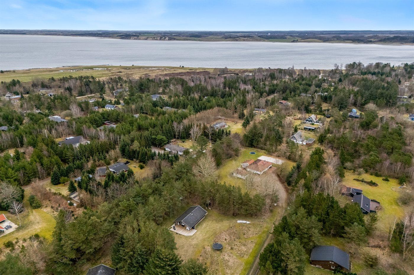 Ferieboligen er beliggende på en 2400 m² stor naturgrund. Der er 700 m til fjorden. Nærmeste forretning er beliggende i en afstand af 3000 m. Desuden er der 15 m² overdækket terrasse. Parkering ved ferieboligen.