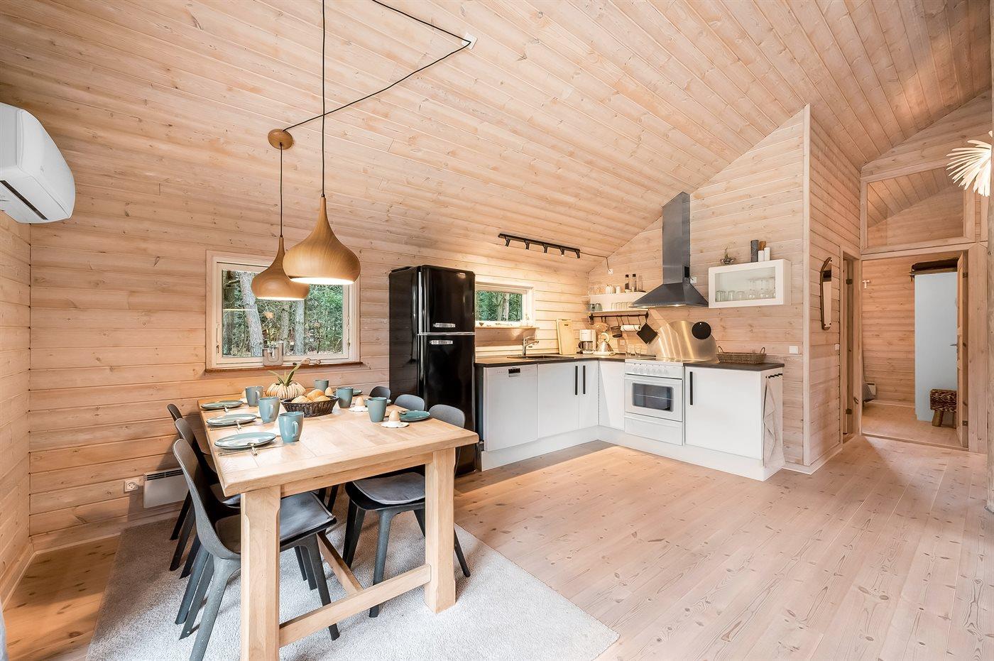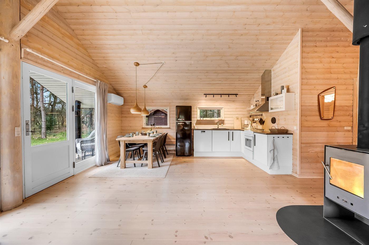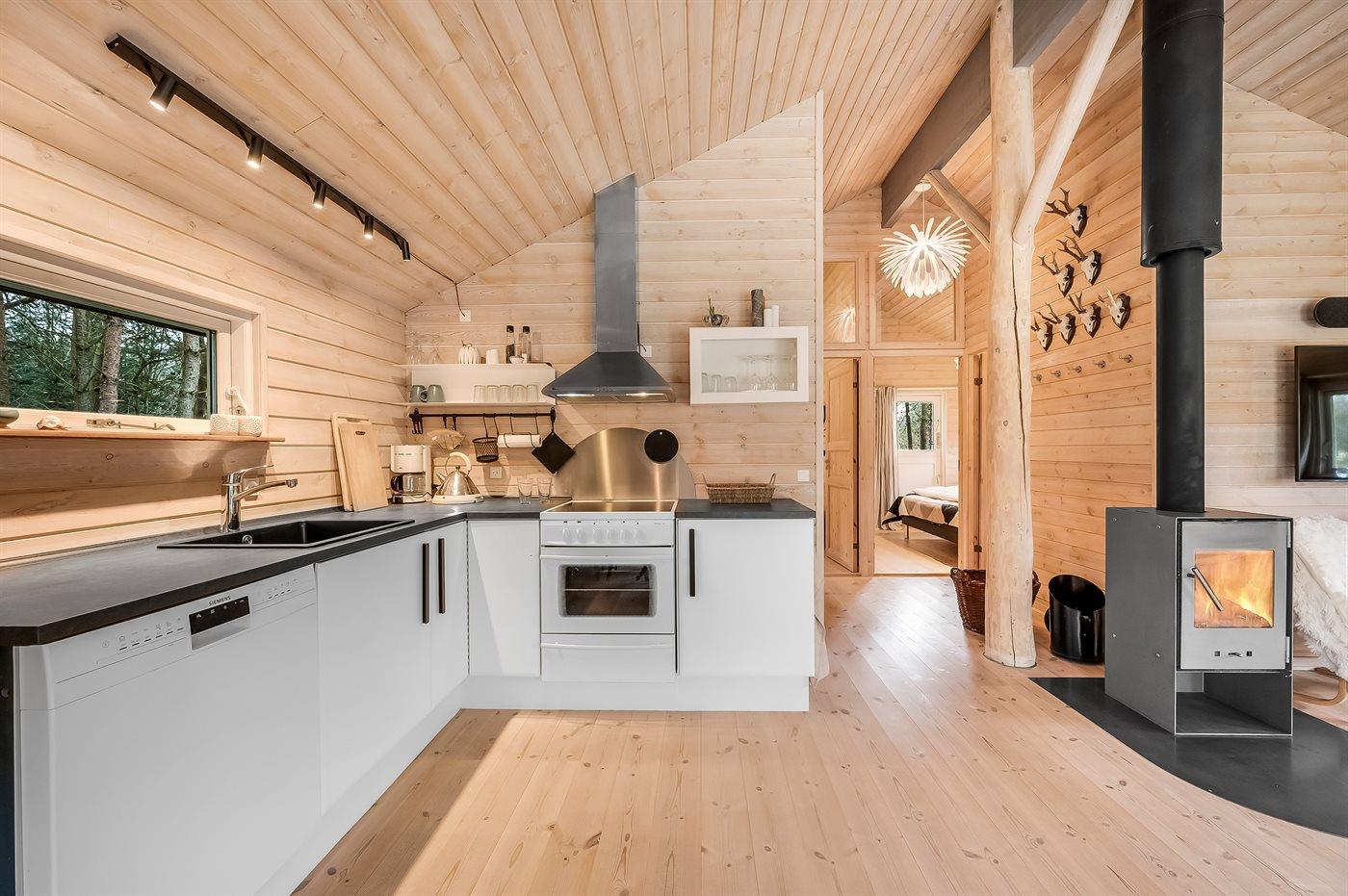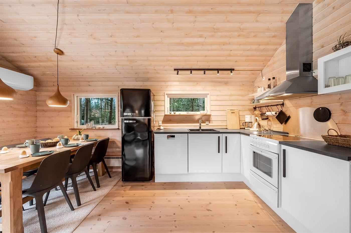 Køkkenet er udstyret med 1 køleskab. Der er 4 elkogeplader, varmluftovn samt opvaskemaskine.