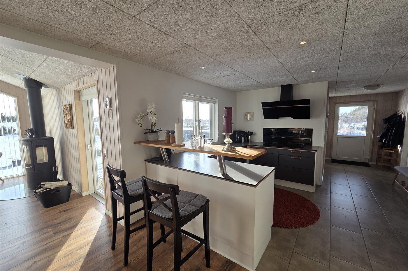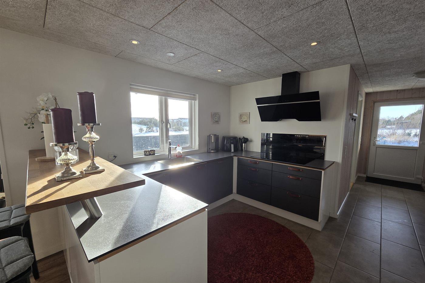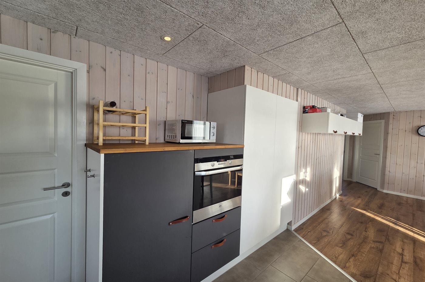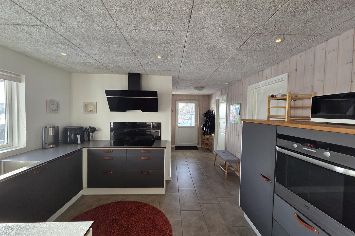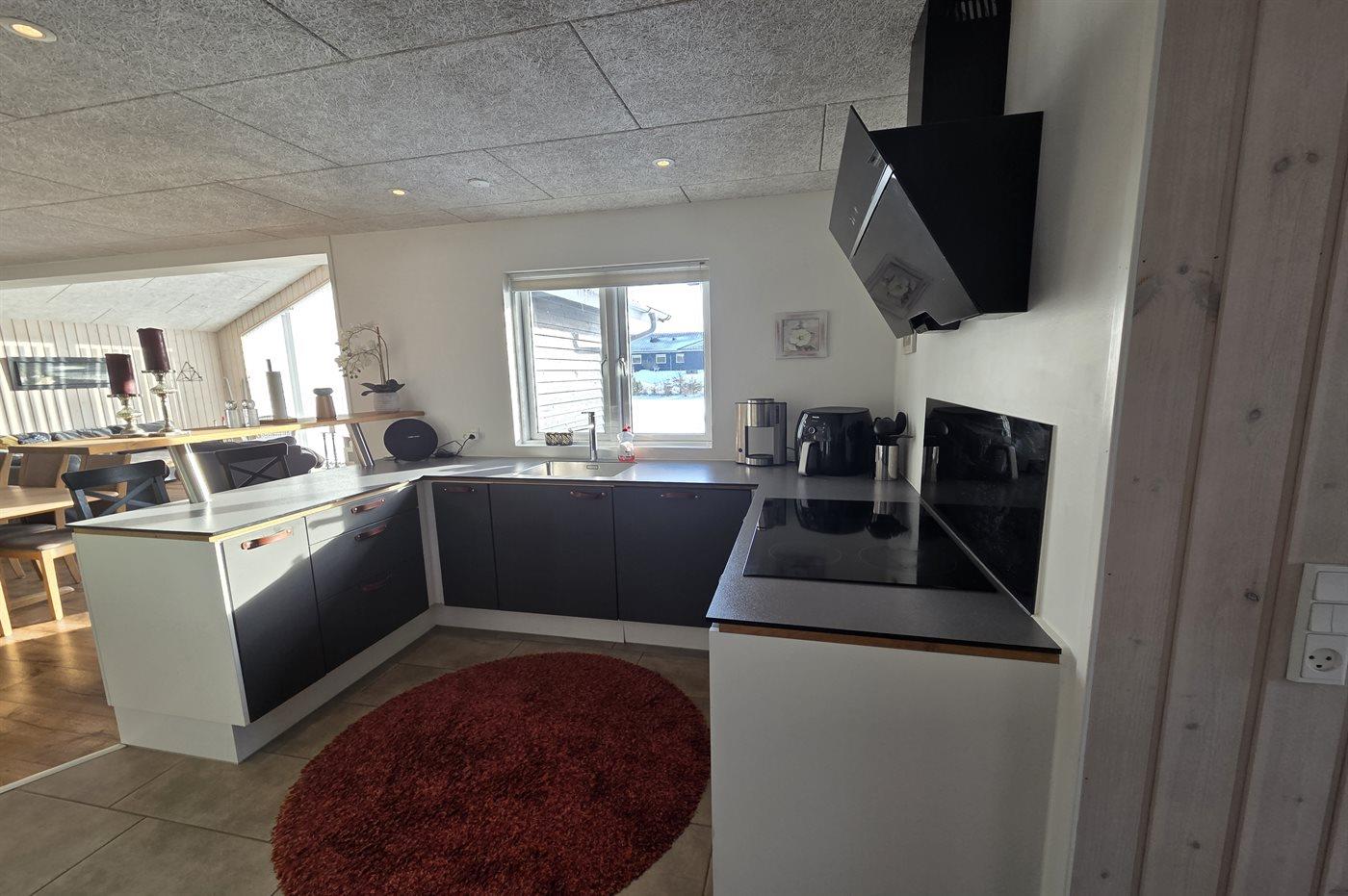Køkkenet er udstyret med 1 køleskab. Der er 4 induktionskogeplader, varmluftovn, mikrobølgeovn, Airfryer samt opvaskemaskine.