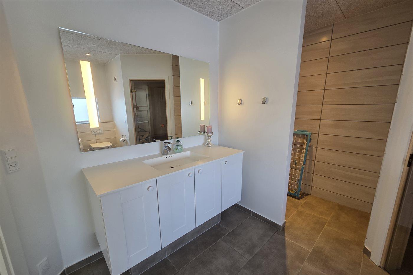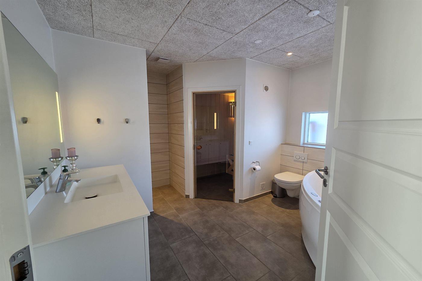 Der er 2 badeværelser med bruseniche og 2 toiletter. Der er gulvvarme på 2 badeværelser. I saunaen er der mulighed for afslapning.