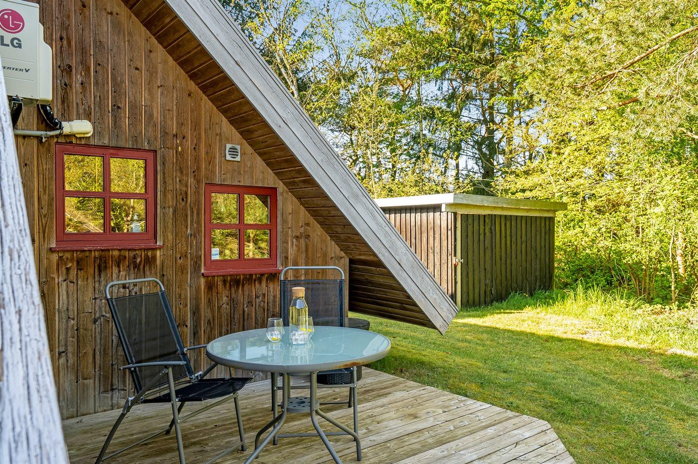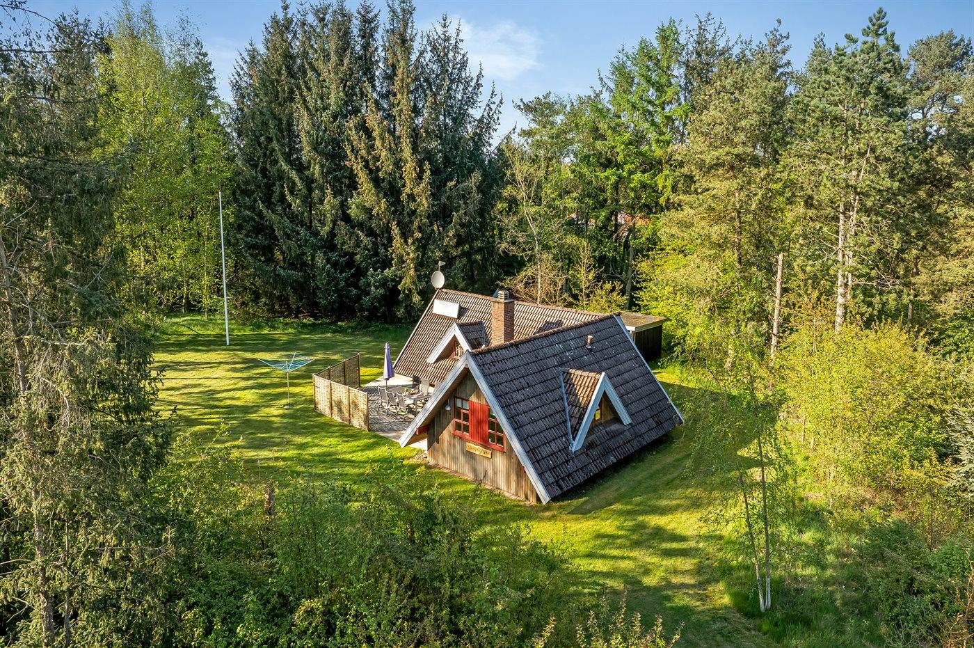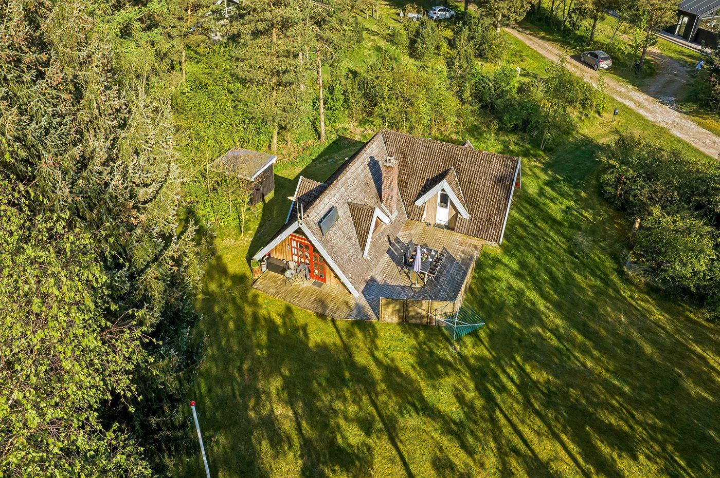 Hyggeligt sommerhus i skov nær Virksund med adgang til fjord, terrasse og elbiloplader.