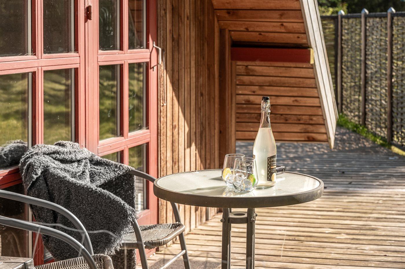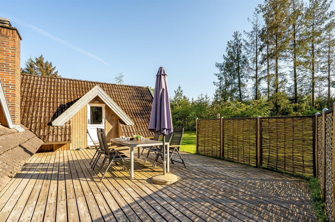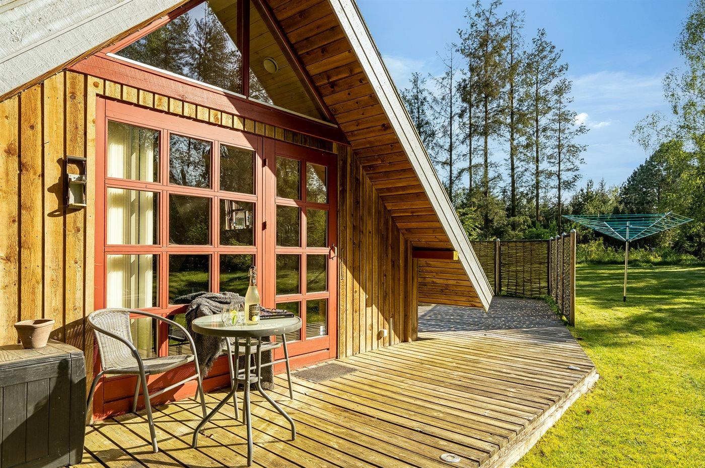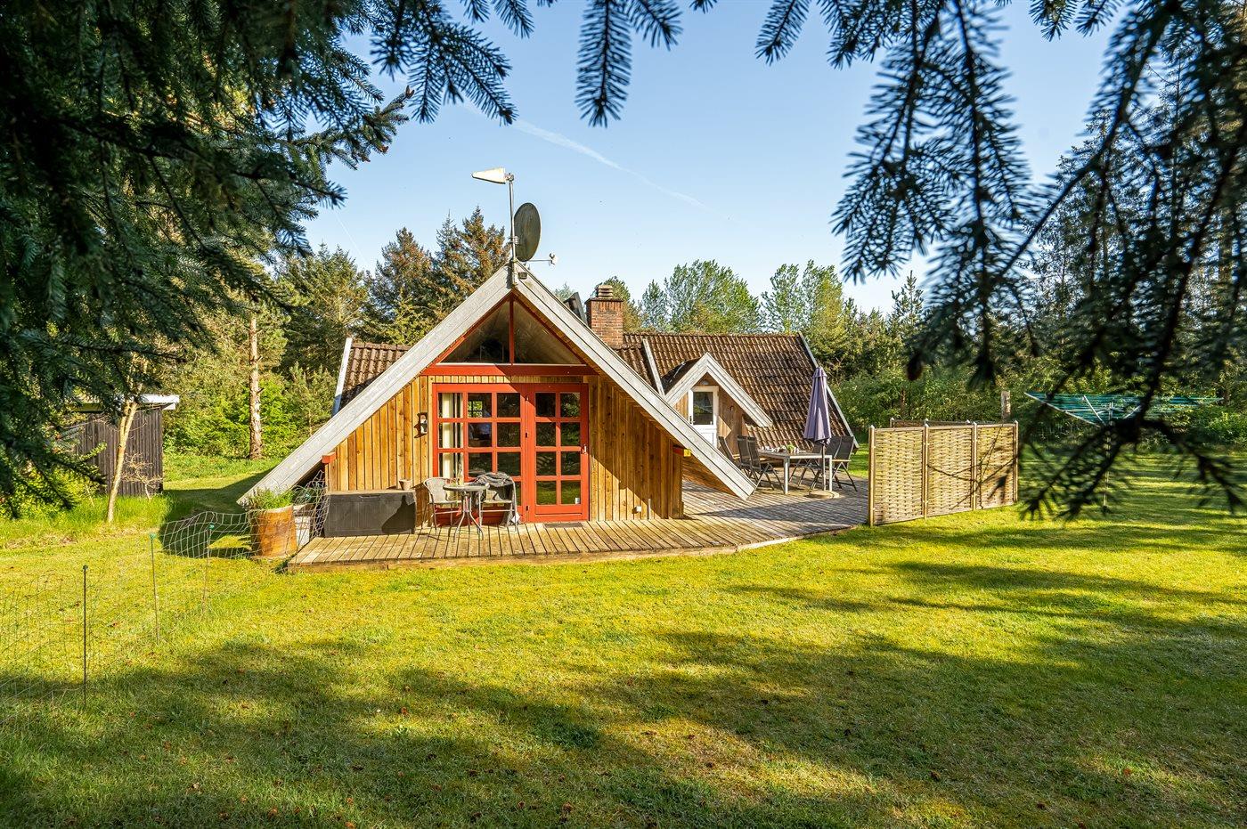 Hyggeligt sommerhus i skov nær Virksund med adgang til fjord, terrasse og elbiloplader.