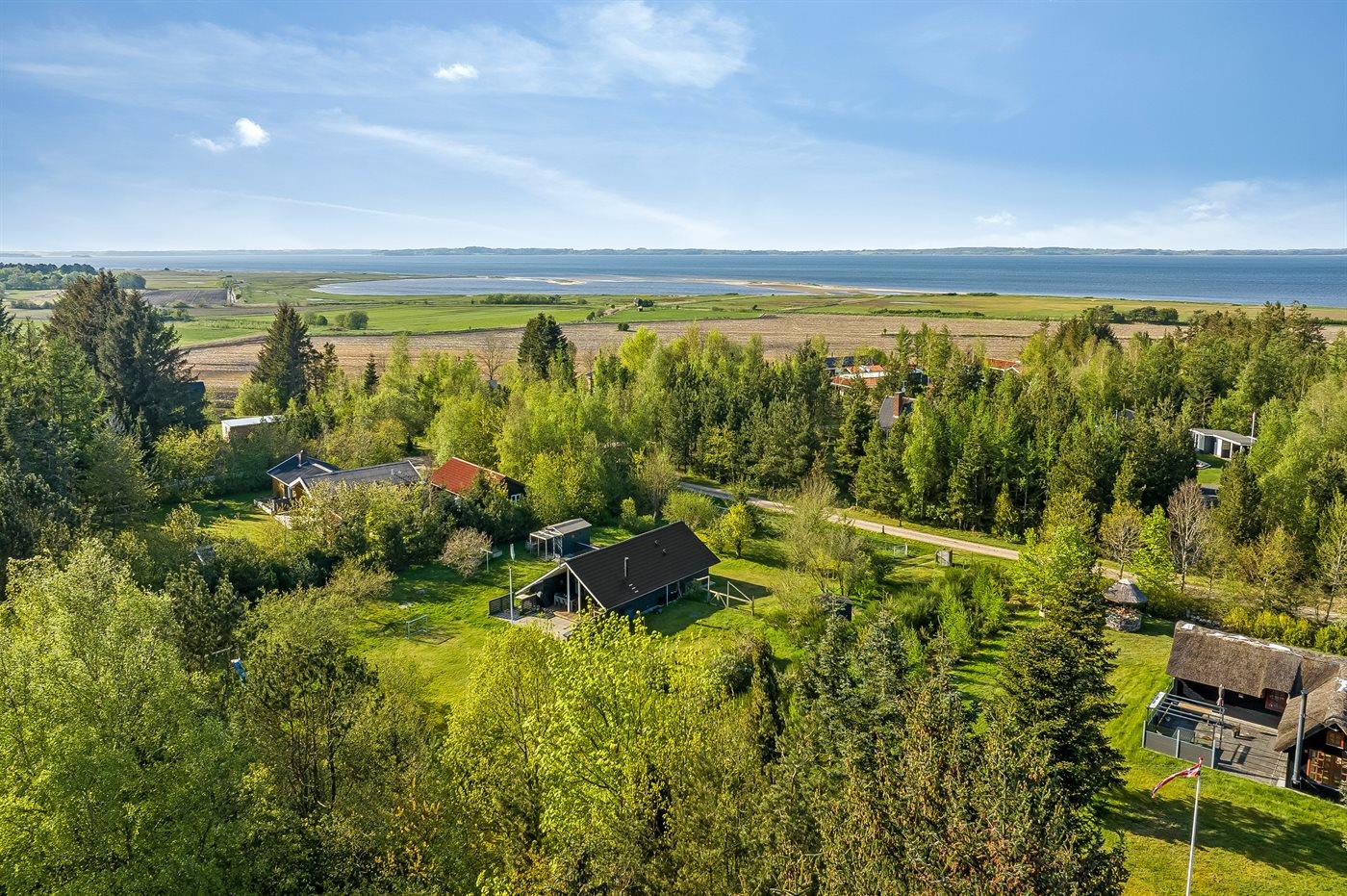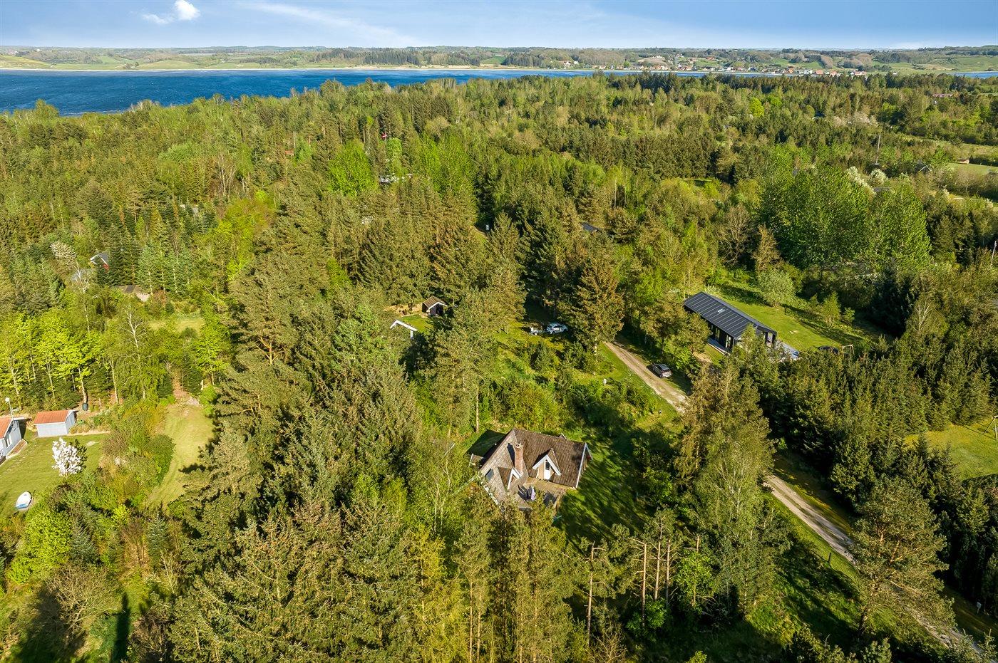 Ferieboligen er beliggende på en 2502 m² stor grund i skov/plantage. Grunden er indhegnet. Der er 600 m til fjorden. Nærmeste forretning er beliggende i en afstand af 1200 m. Til ferieboligen hører åbent terrasseareal. Der er redskabsrum. Der er installeret stik til opladning af elbil. Parkering ved ferieboligen.